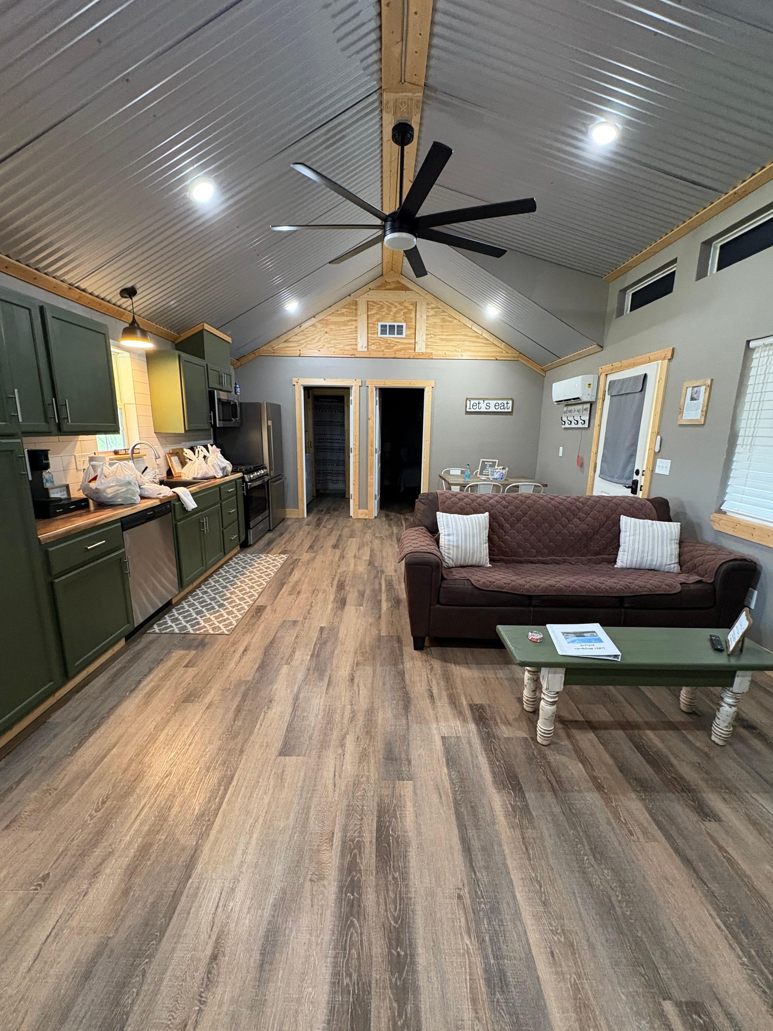 As you walk in you will be welcomed by an open kitchen and living area. The kitchen has all the amenities you need to make a home cooked meal or make snacks and popcorn. Complete with full size appliances. The living room is ready for you to enjoy a movie and snacks or cozy up on the couch and relax after a long busy day.