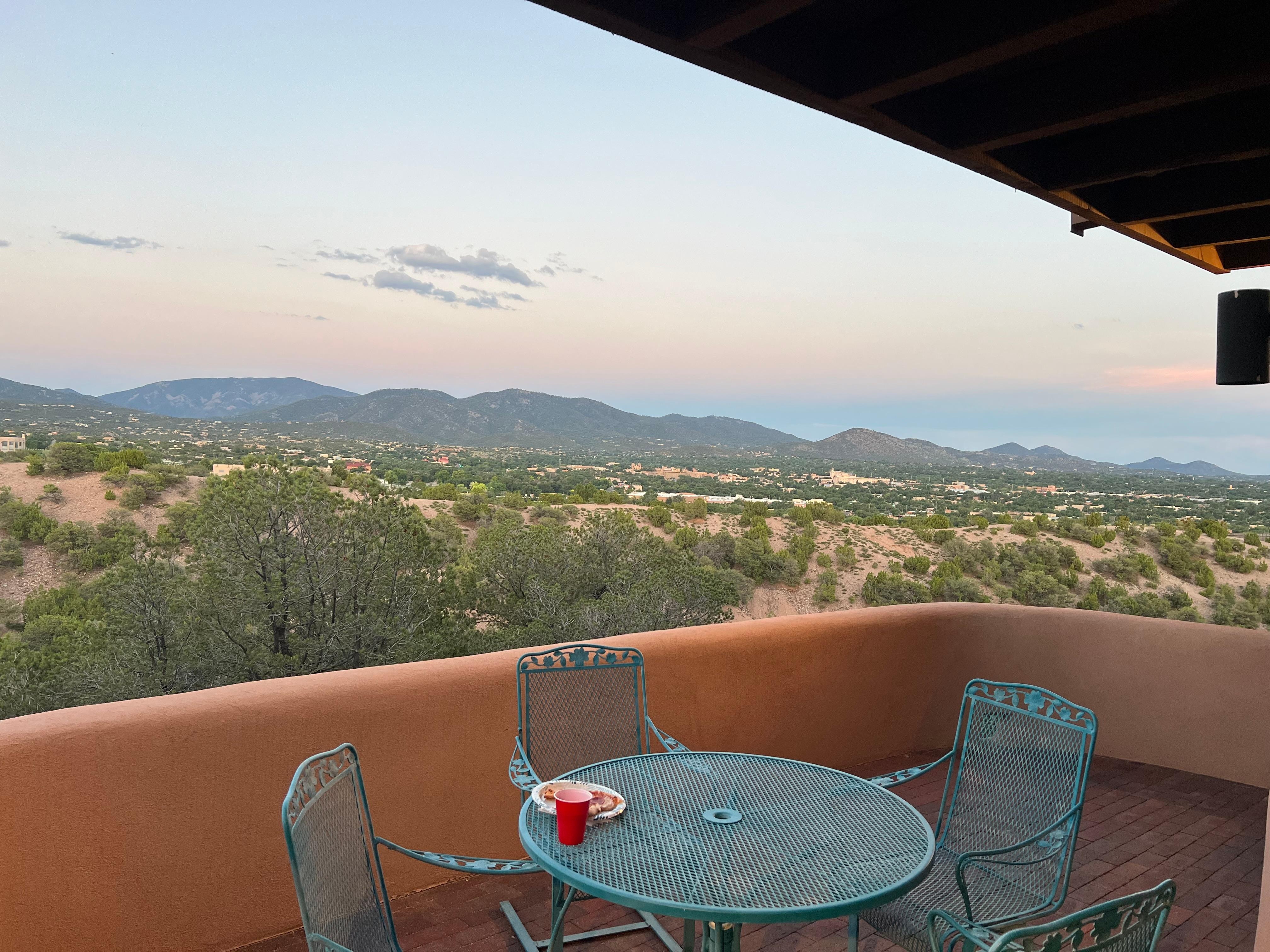 Luces de la Ciudad (“Lights of the City”) is a stunning 4,300 sq. ft. Santa Fe retreat with commanding views of the historic downtown and Sangre de Cristo Mountains — just two miles from the heart of the city. With vintage touches, exposed timber beams, and thoughtful amenities, this pet-friendly home welcomes up to eight guests in four bedrooms and four-and-a-half baths.