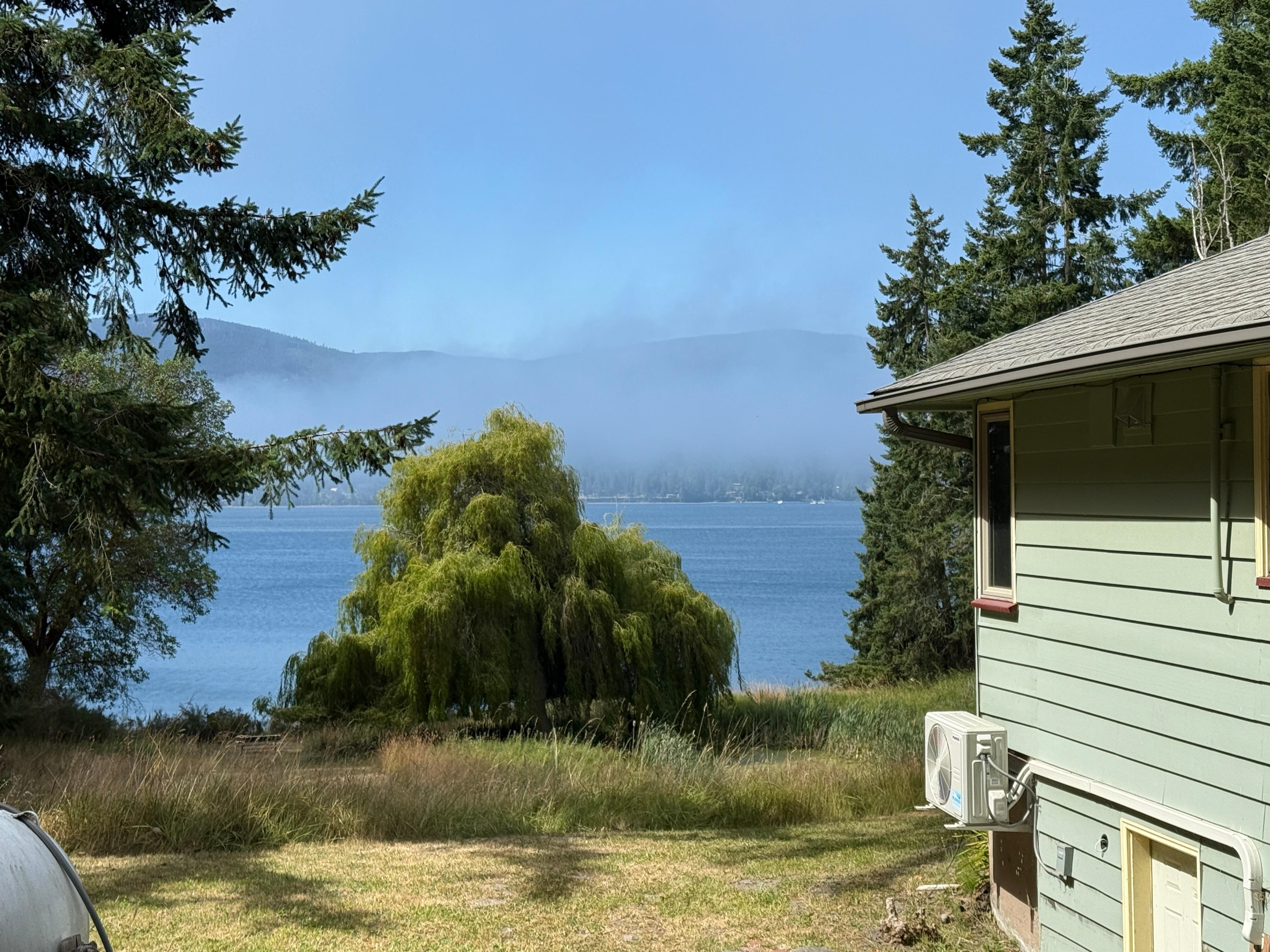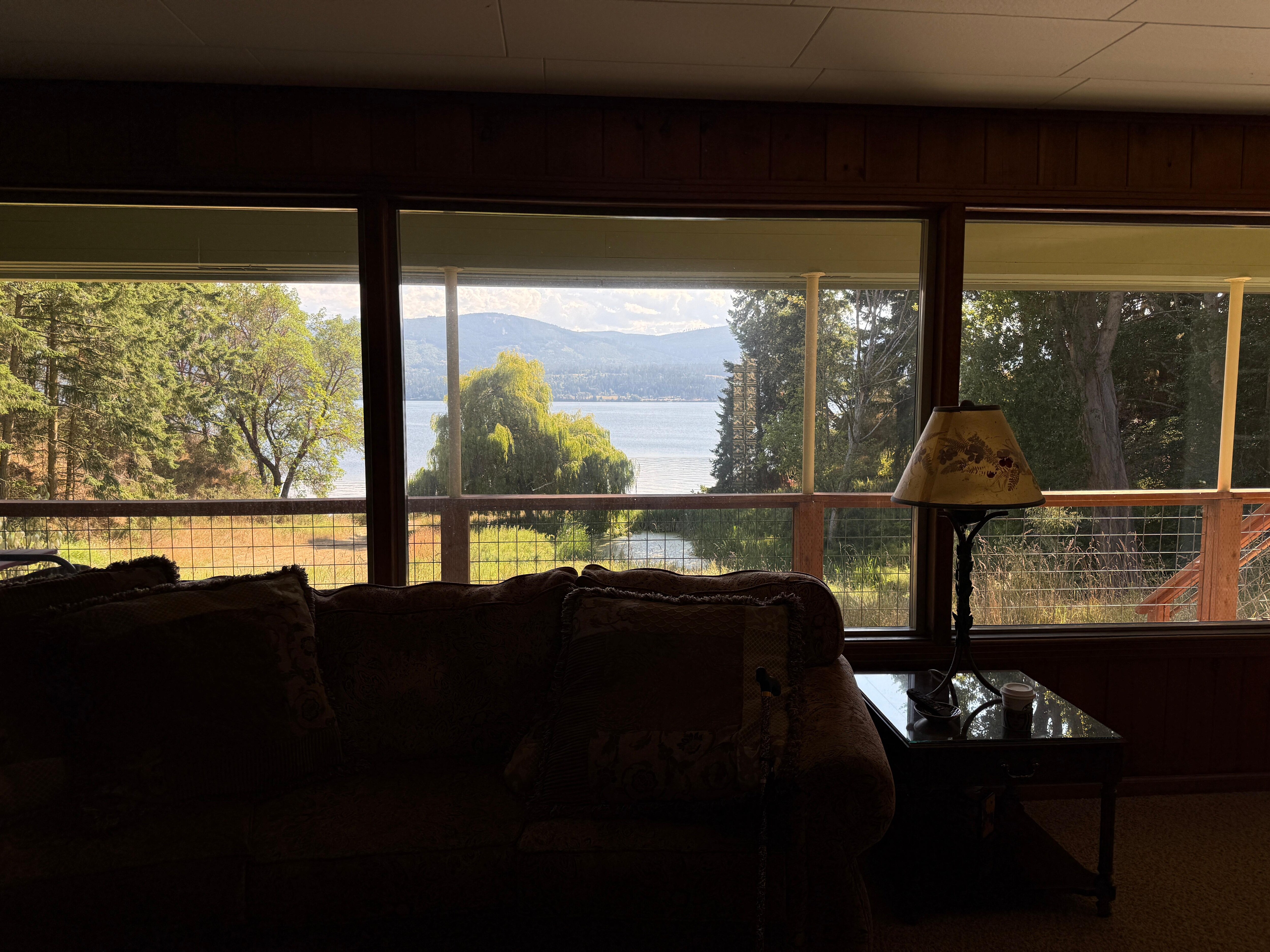 Stepping inside, you are greeted by a cozy interior adorned with rustic charm and modern comforts. Large windows frame breathtaking views of Sequim Bay, inviting the serene beauty of the outdoors inside. The decor reflects the natural surroundings, with earthy tones and tasteful nods to the coastal environment.