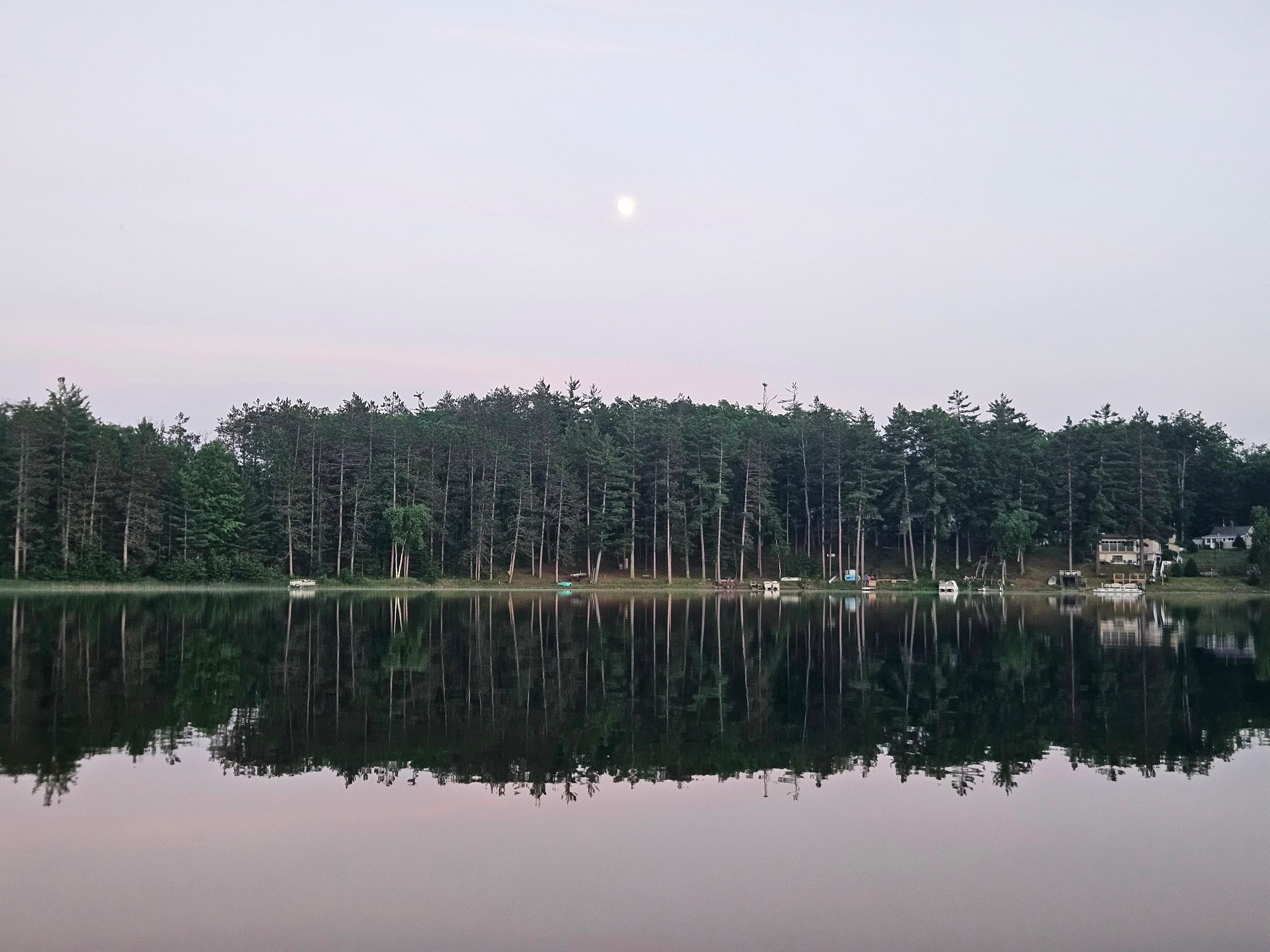 This is our family cabin on Crooked lake, and we rent it out for part of the summer months. It was built in the 1950’s by the Erb lumber founder. This is a quiet and beautiful lake with a fantastic, ever-changing view in the heart of the Amish rolling hills. Loons, Herons and eagles are common here, and I'm sure you'll see lots of other wildlife. Den of foxes 100’ away. I’ve seen bobcat, wolverine, foxes, eagle, bear and of course lots of deer. This a clean, spring fed no-wake 90 acre lake, and there is good fishing as well (Largemouth, Crappie, Sunfish, Bluegills, Rock Bass, and Perch. Some huge Pike.). It's located on the end of a cul-de-sac, so nothing but woods on one side (a couple hundred acres). We spend most of our time on the deck enjoying the lake, or down near the water or on it. Inside the cabin, I'm sure you'll find it spacious (around 1300 square feet). It has an open floor plan, and is full of contemporary Michigan art from downstate. The master bedroom is quite large, and the other two bedrooms are somewhat smaller. The master has a king sized bed. BR2 has a bunk bed in it, and BR3 has a full sized bed. The bathroom is average sized with a tub and shower and is freshly updated. Everything is clean and functional. There is a television with DVD player, and a decent sized library of DVD movies. There are 800 movies on a Raspberry Pi as well. Smart tv with streamed Netflix etc. Fast fiber optic internet. Sit on the deck and work remote if you’d like.