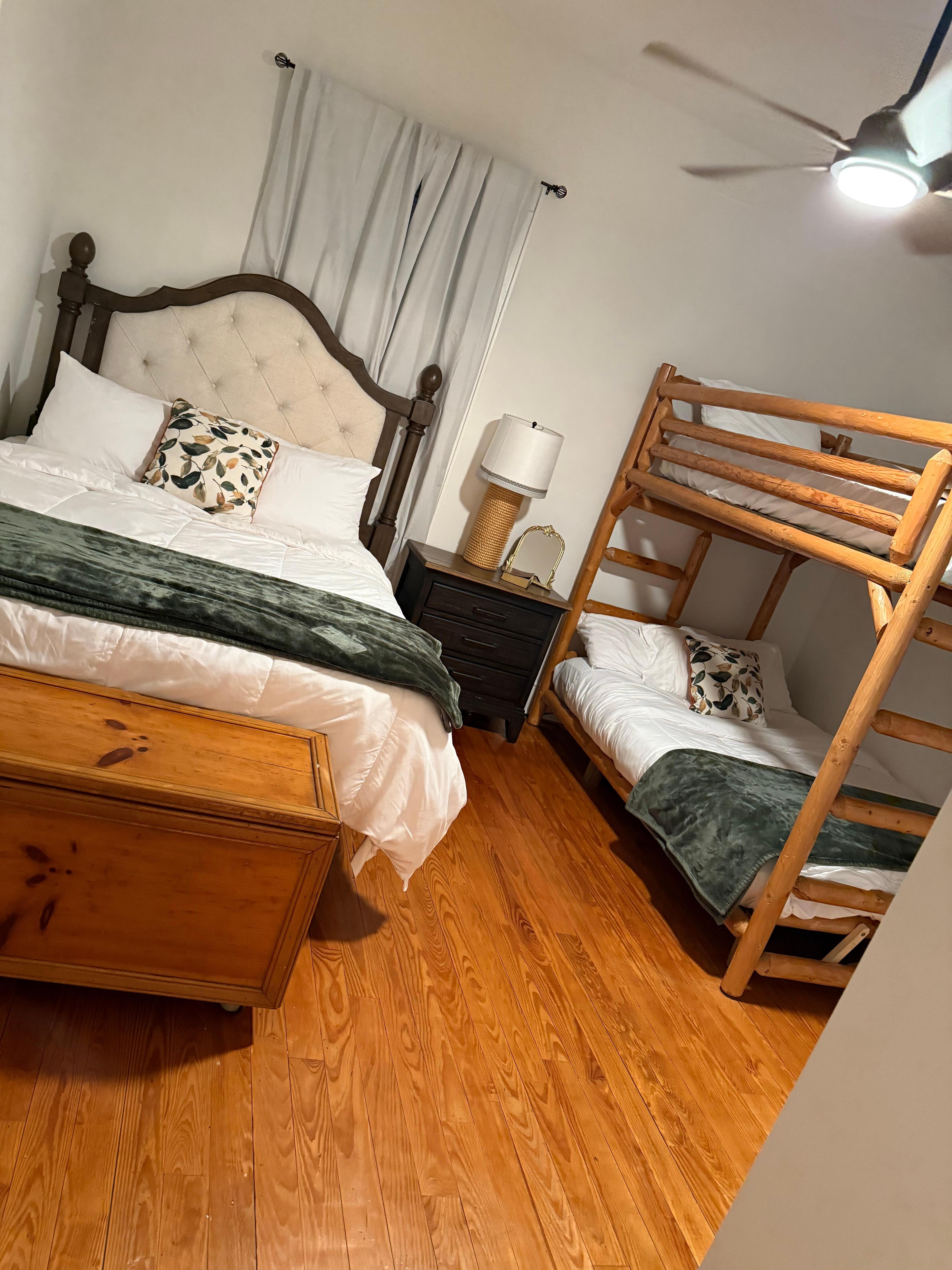 This property included 2 rooms and 2 full baths. The master bedroom includes one queen sized bed, one full bathroom and a walk in closet. The 2nd room includes one queen sized bed, a bunk bed and closet. Spacious, newly updated kitchen, and full sized guest bathroom. Outside there is a grill, outdoor deck with patio furniture, porch, and privacy fence with a spacious back yard.