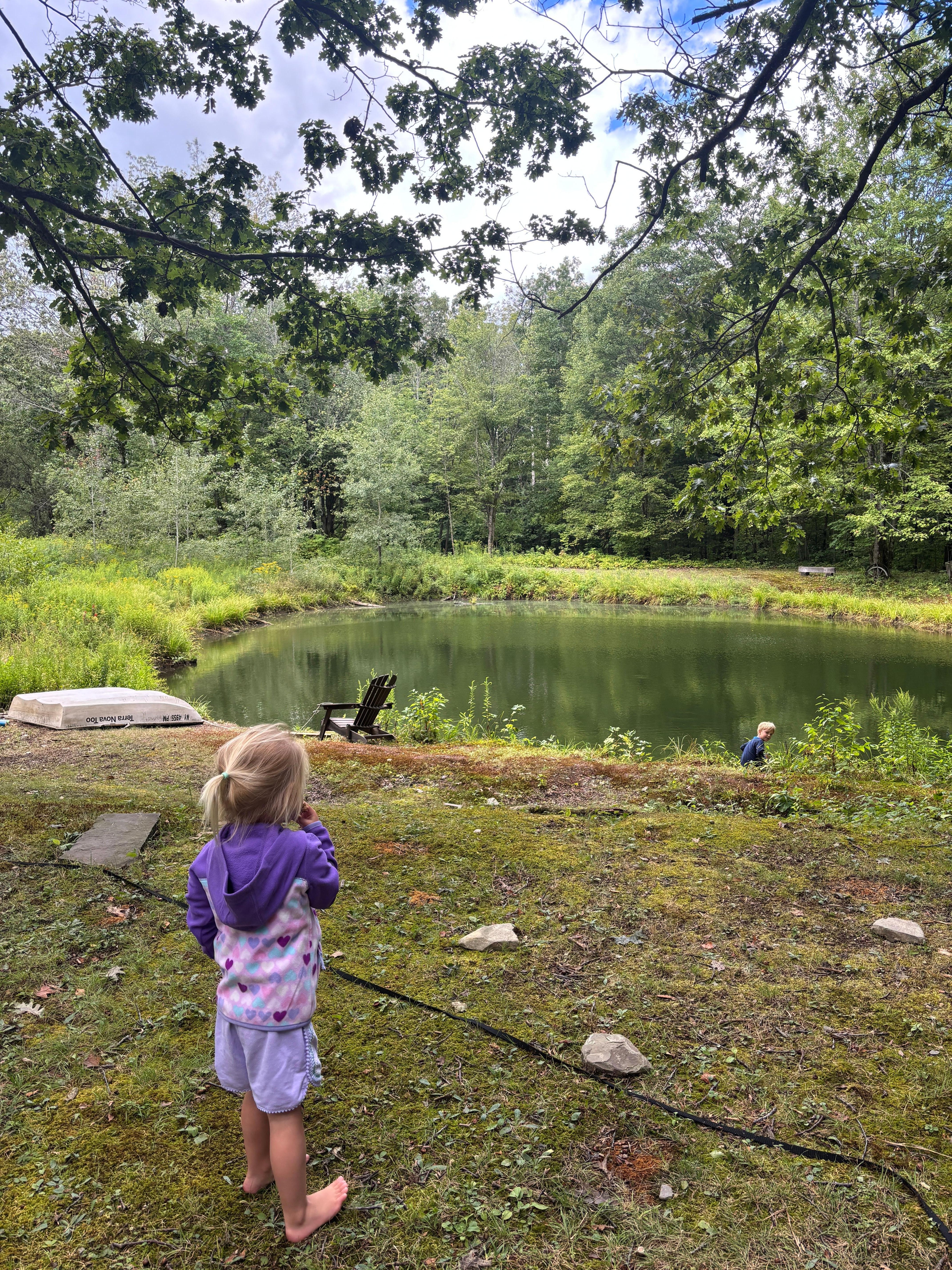 The pond is primarily for wildlife and ambience, not for swimming (by people or pets) and definitely not a fishing pond (only goldfish). But there is a little dingy to get out onto it.
