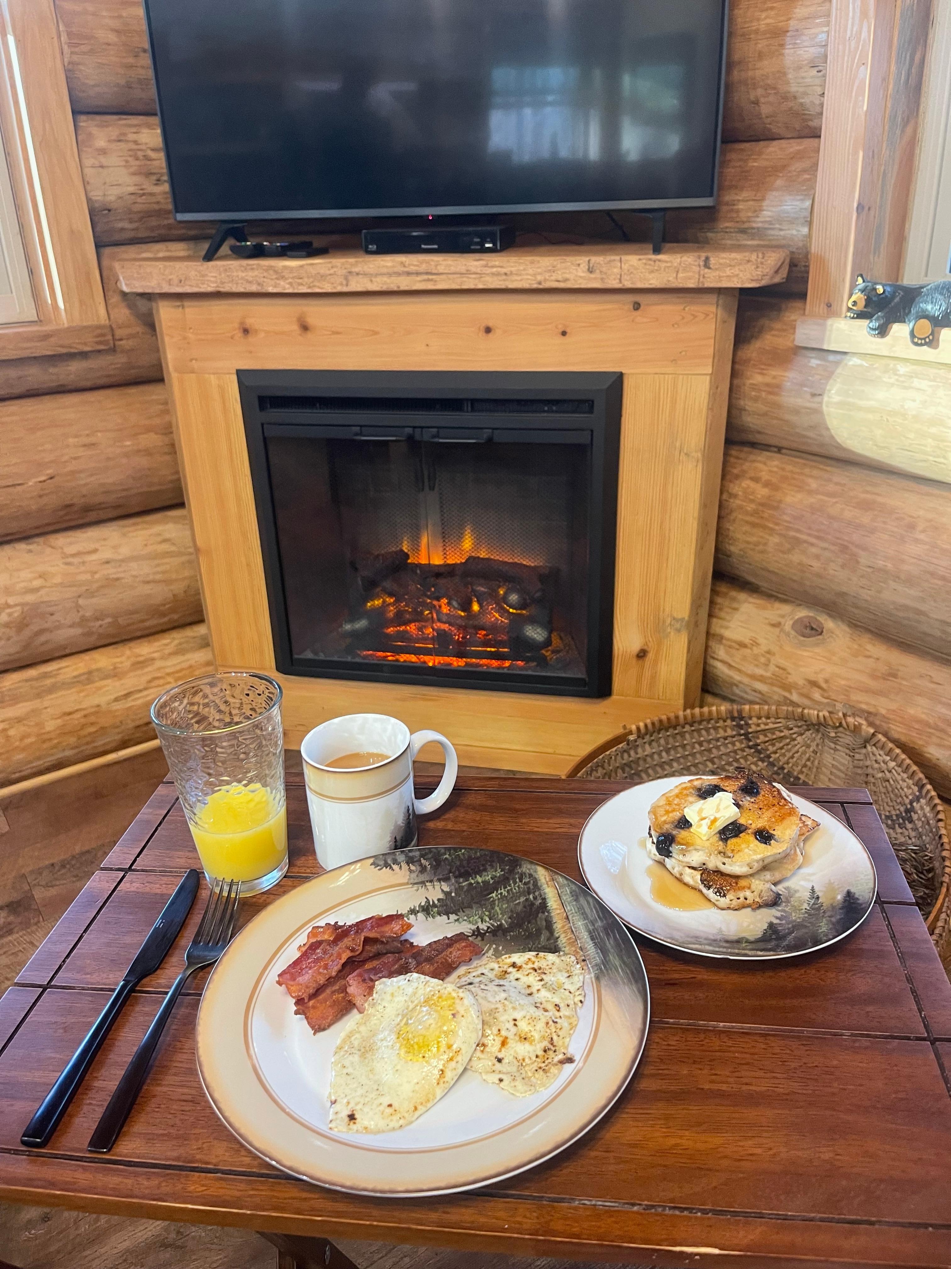 The cabin features a vaulted ceiling with huge exposed log beams and antler chandelier. It has a queen size bed with memory foam topper for a good nights sleep. If you prefer a firm mattress, let us know prior to your stay and we can remove the memory foam topper. The sofa can also be pulled out to make a full sized bed.