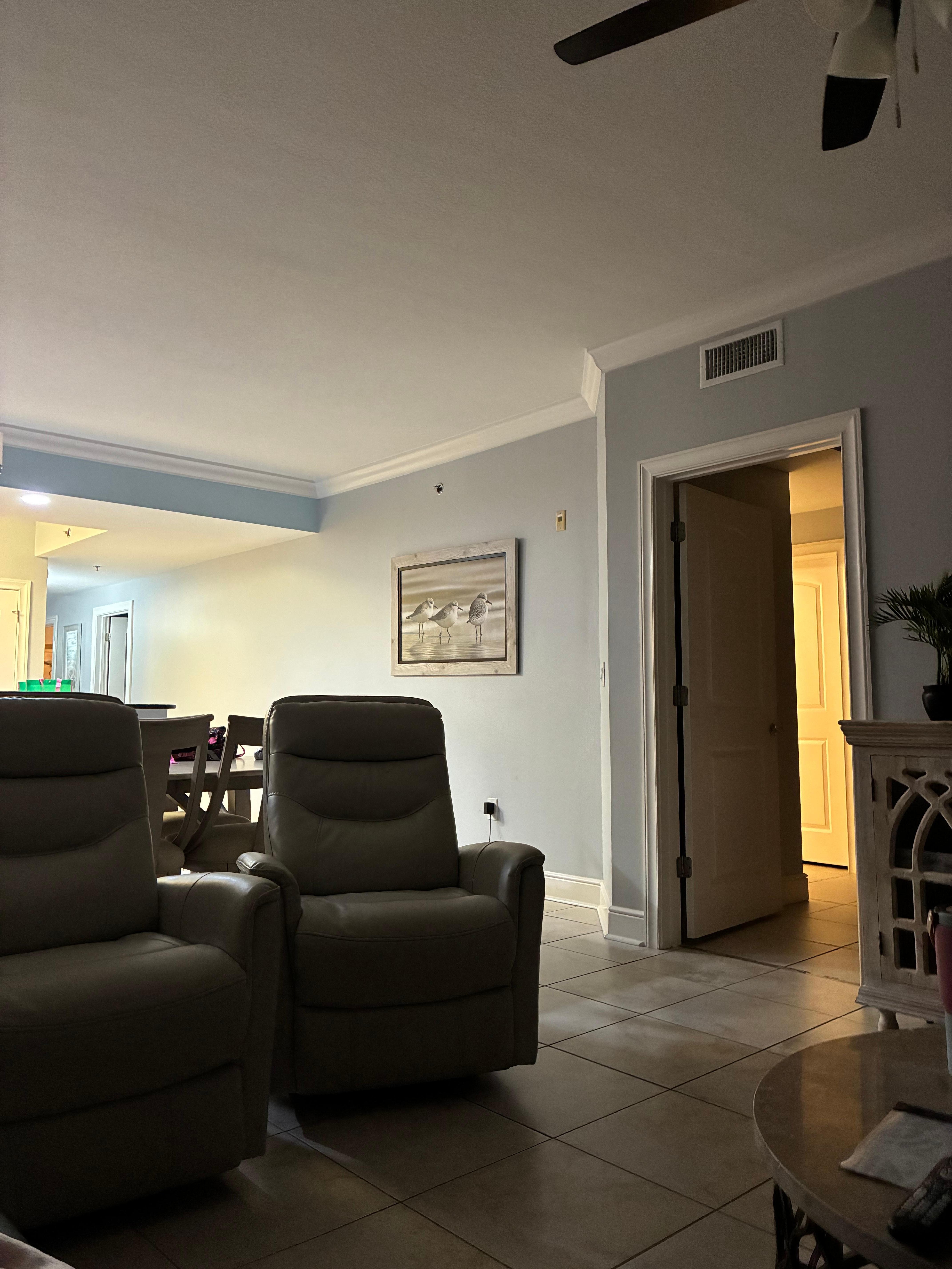 The master suite offers a plush king bed, private balcony access, and a luxurious ensuite bath with a walk-in shower (no tub), dual vanities, and generous storage. Every bedroom features its own TV, offering a cozy place to unwind after a day at the beach. The living room includes four comfortable reclining chairs and a sleeper sofa for extra guests.