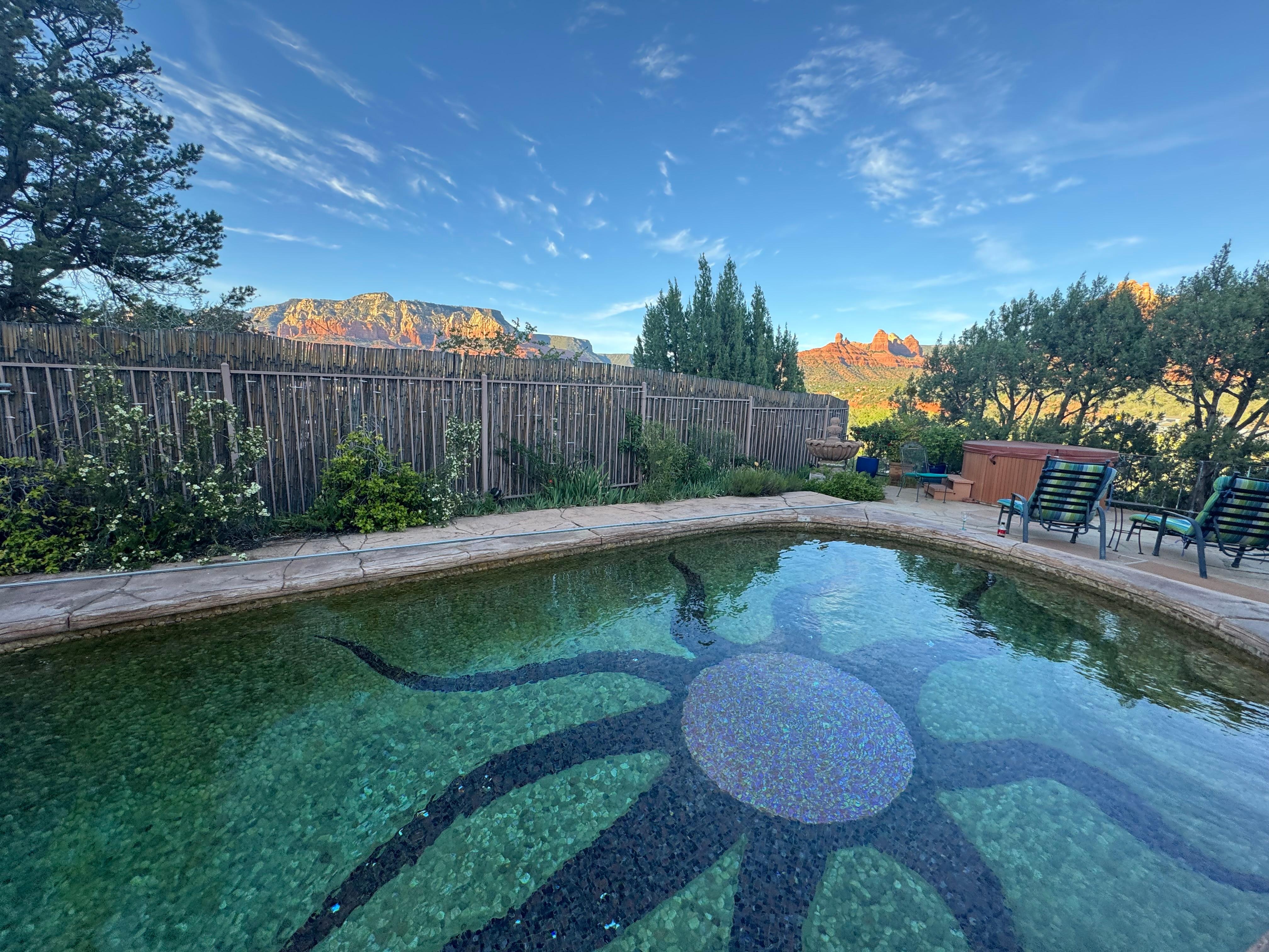 In addition to its romantic setting, this casa has magnificent mountain, mesa and Red Rock views. It also features a covered porch, swimming pool, jacuzzi and mature high desert landscaping. The Travel Industry Votes Sedona the '#1 Most Beautiful Place In America.'