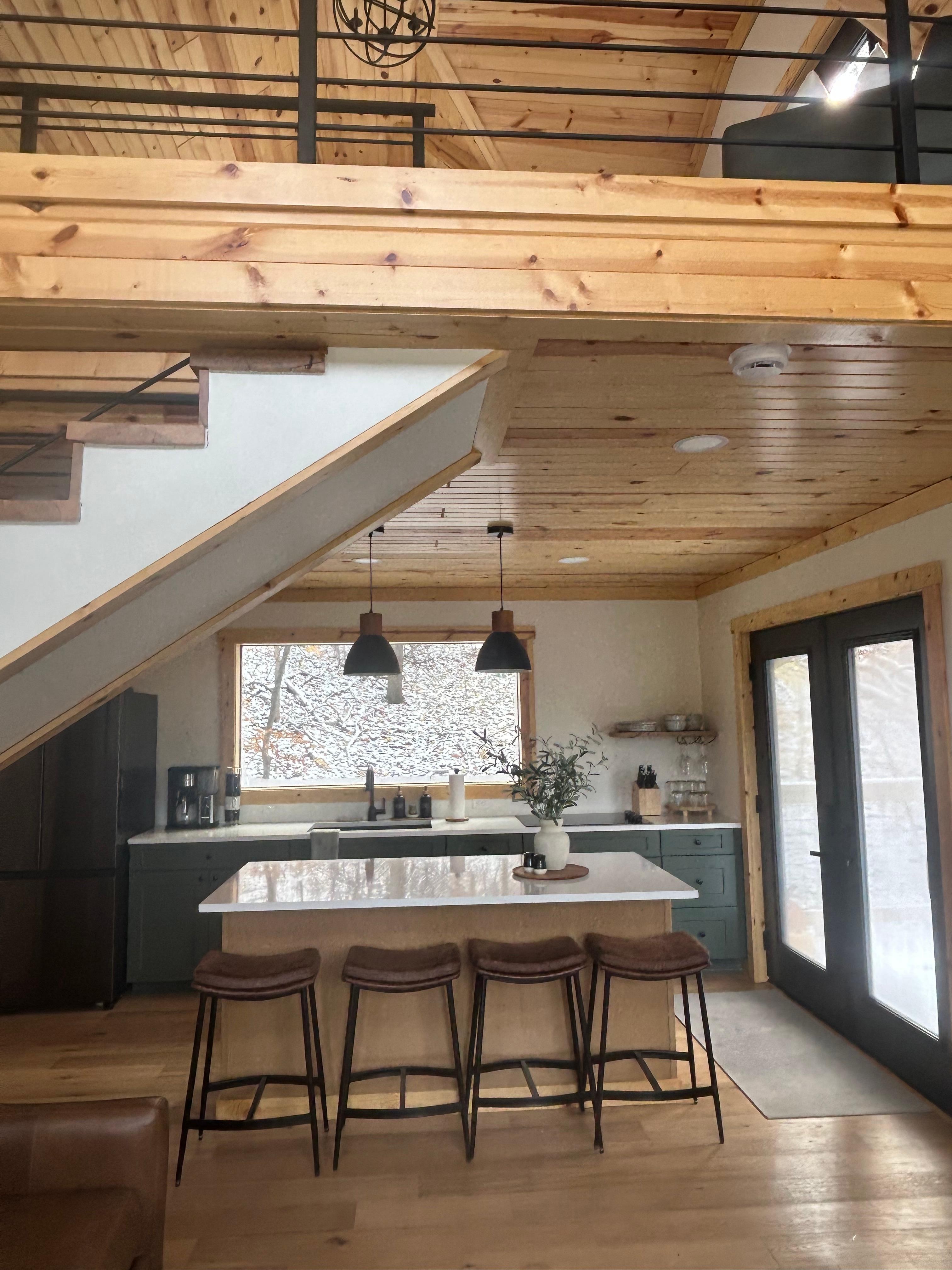 The Jaxon House comfortably accommodates up to four guests, featuring a king-sized bed in the upstairs bedroom boasting breathtaking views, as well as a plush Italian leather queen sleeper sofa in the living area.