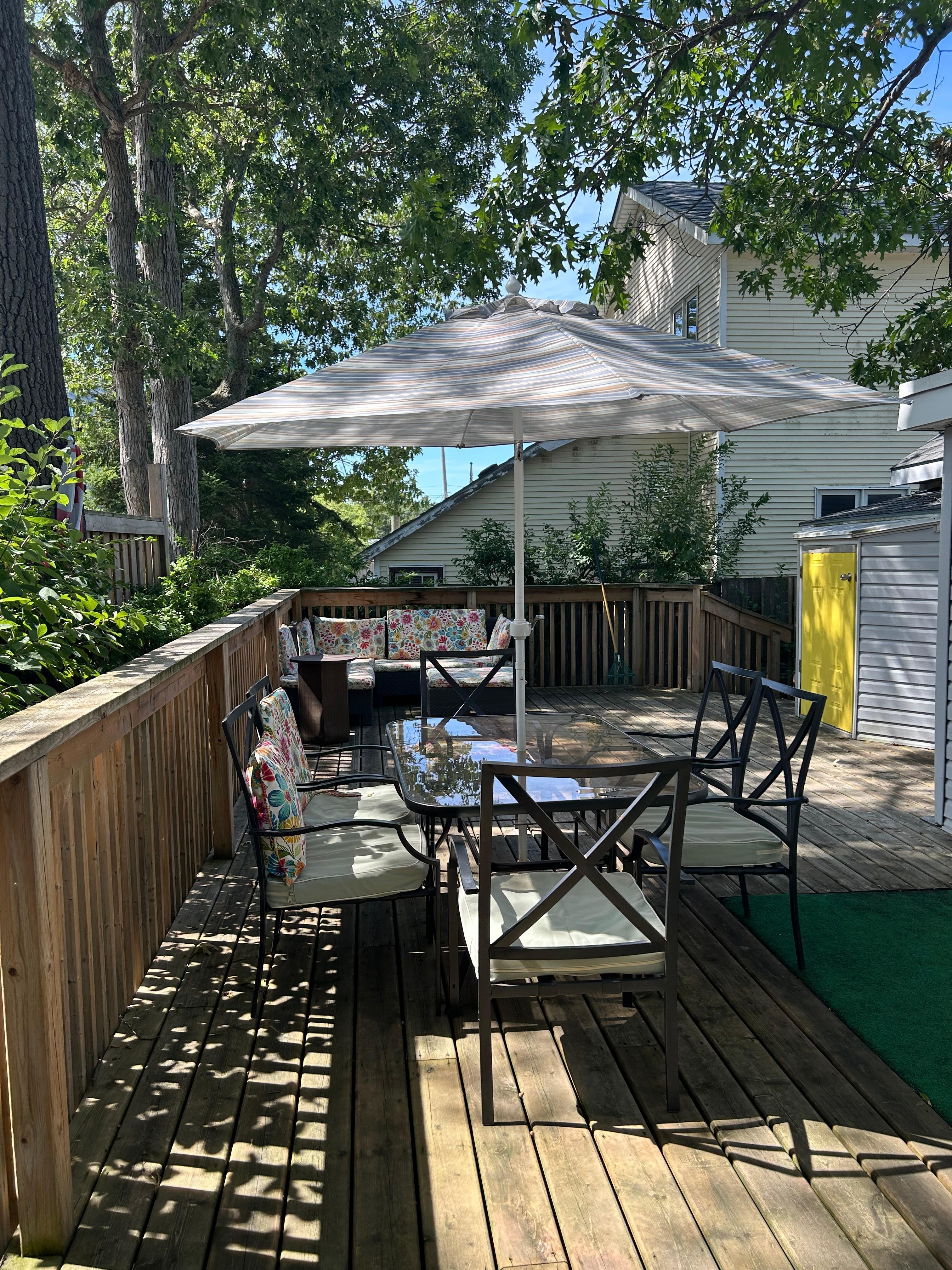 Here, at the Goldfish Cottage, you can entertain your family and friends on the large patio with an awesome BBQ, shade trees and a straight shot to the beach! You can see the lake from the front porch!