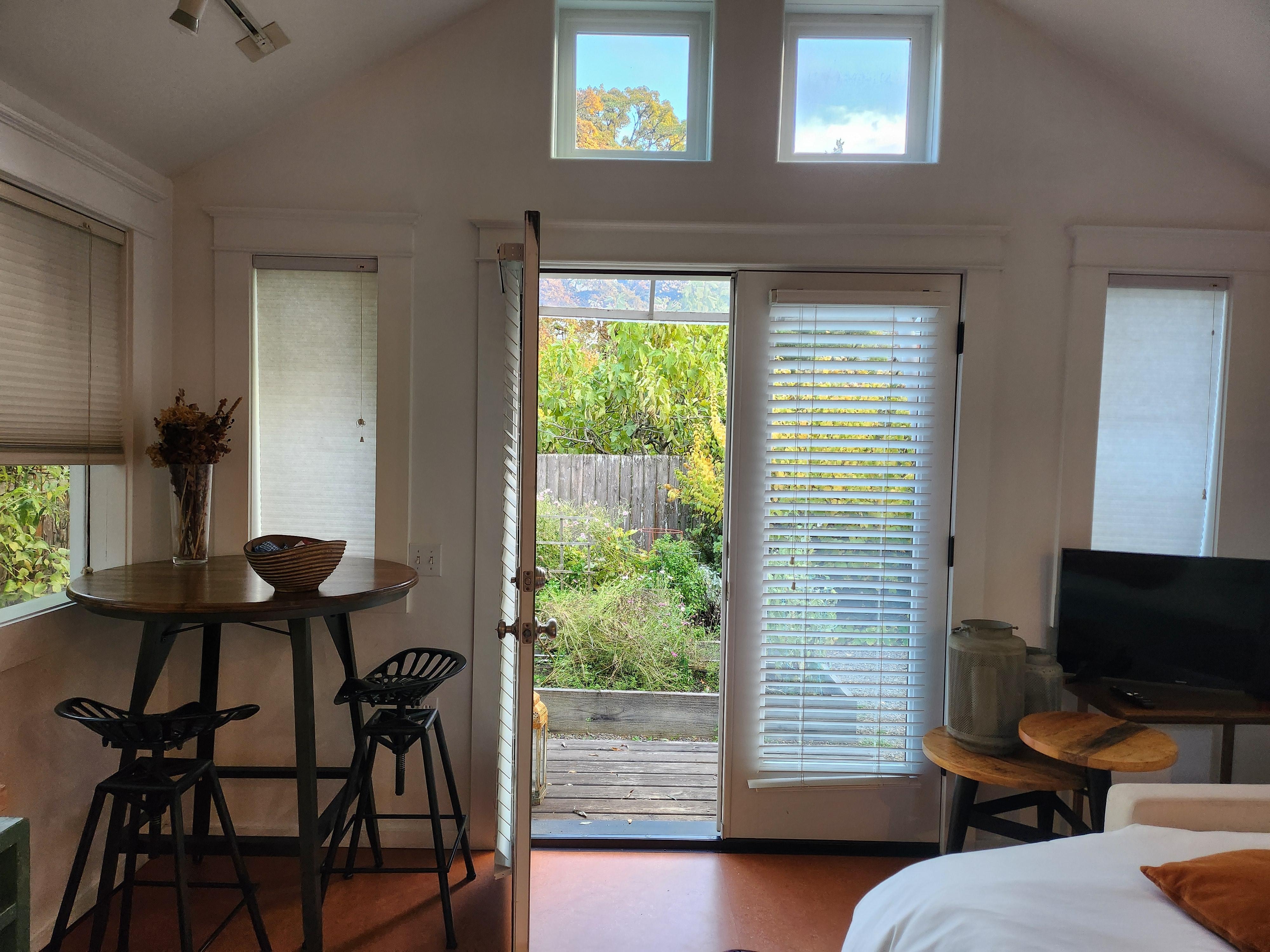 Newly developed and furnished to offer comfort and style, Star Studio features tall ceilings, natural light, marmoleum flooring, a temperapetic queen bed, a dining table, digital TV, writing desk, a full kitchenette, a spacious bathroom, and a deck into the garden. Open the French doors to enjoy the forest-like setting and garden view from the deck of the Studio.