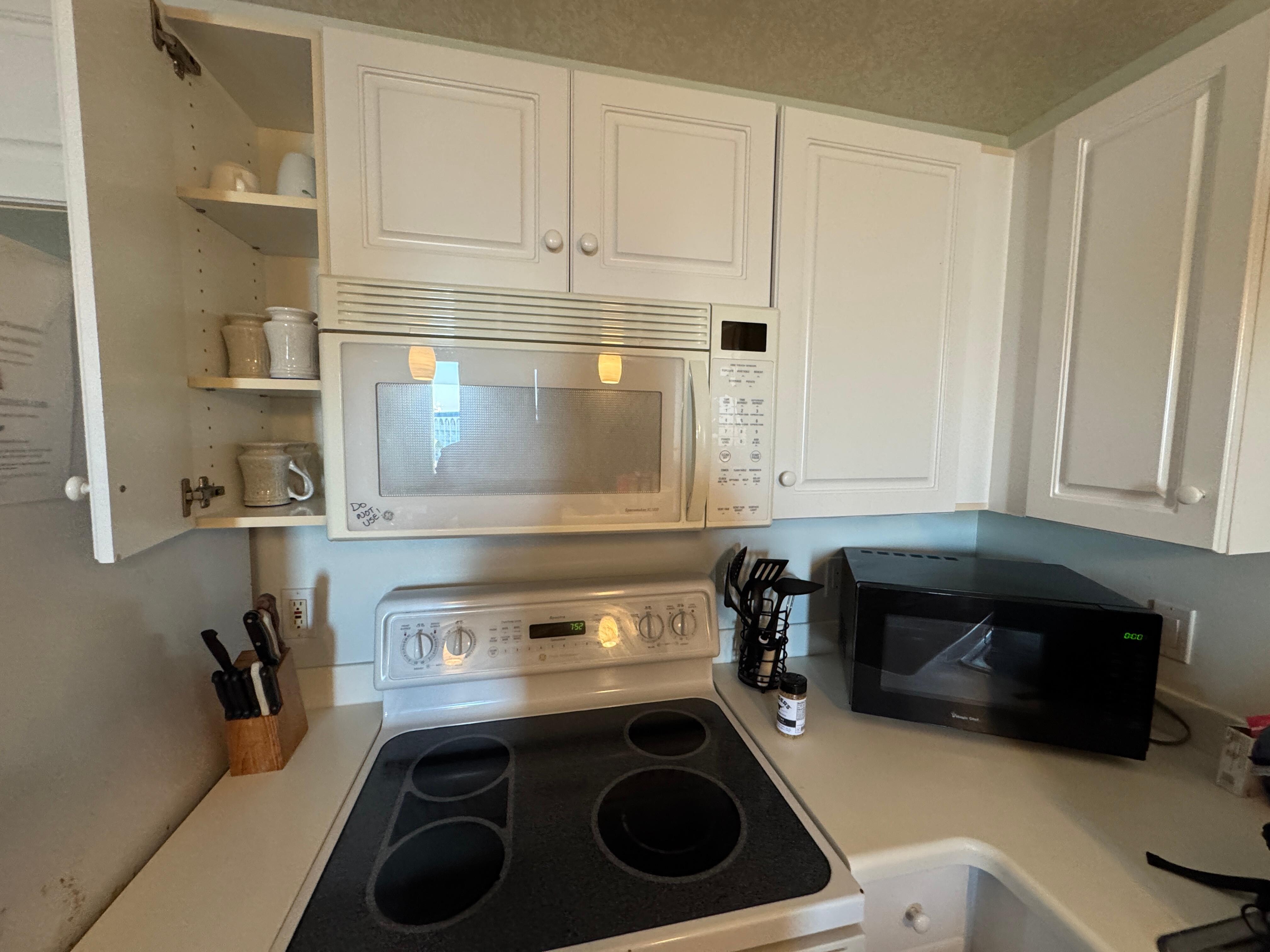 The kitchen is equipped with all modern amenities as well as a Keurig coffee maker (drip coffee maker also available), a Breville toaster oven, a large party blender and bar tools, and glasses. The unit also contains a stackable washer/dryer.
