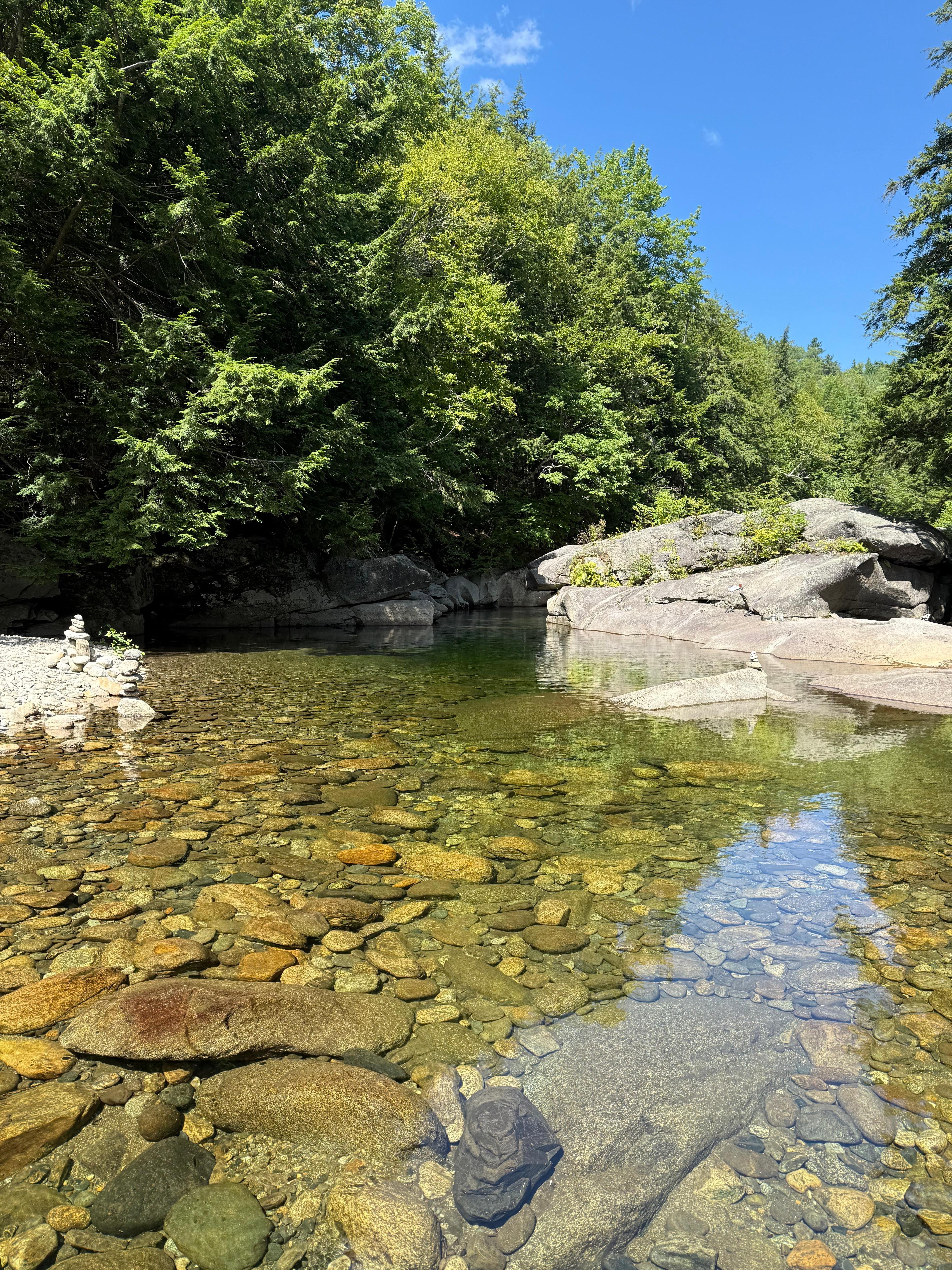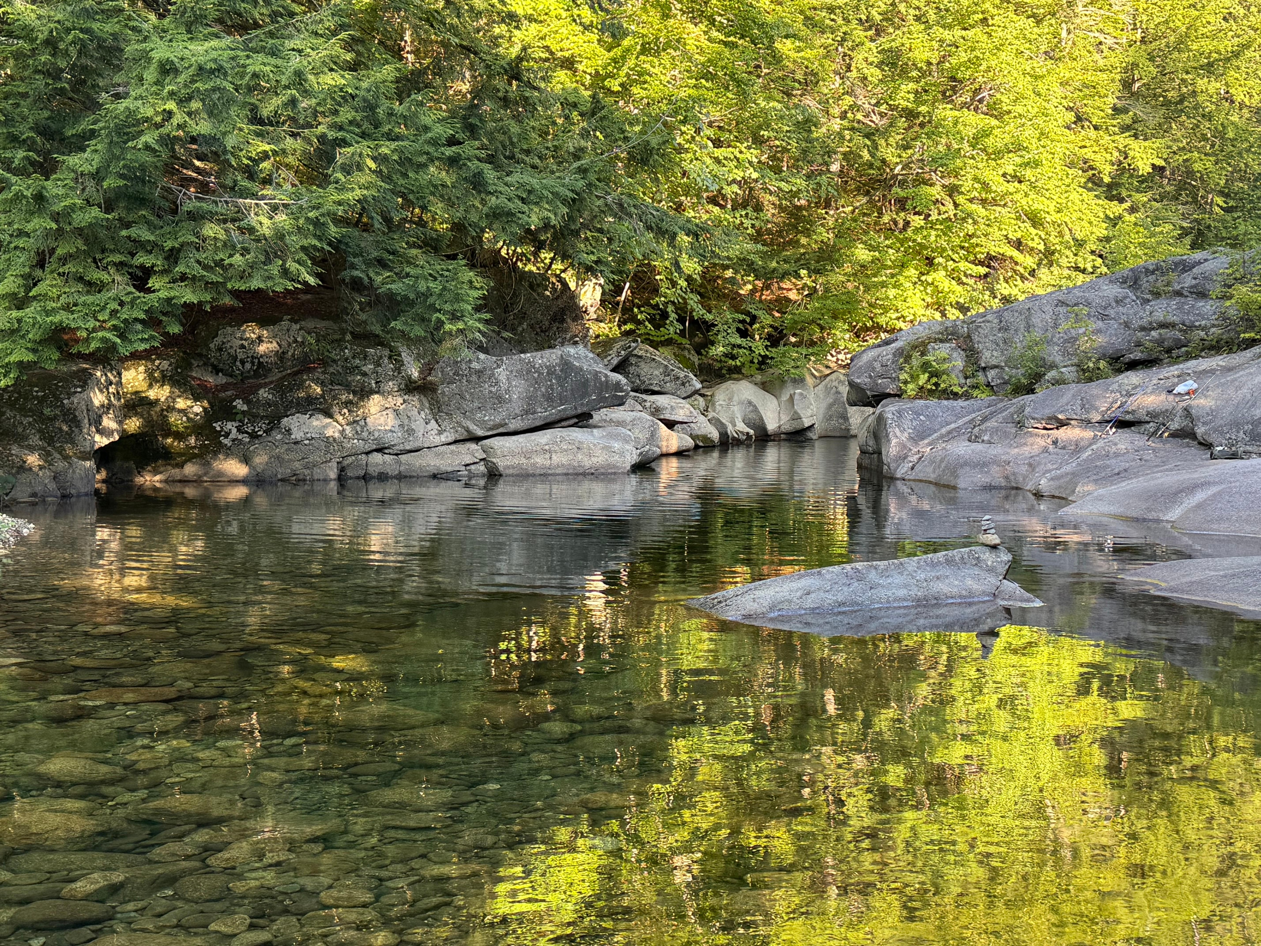 Grampa Fuller chose well when he built the Fuller Camps (Big Camp & Little Camp) on two of the best swimming holes on the Baker River, surrounded by 195 acres of land. On a sunny day, the rocks are hot, the water is cool, and the waterfalls give you a massage. Jump off the rocks into the 12+ feet deep swimming hole or play in the sand and river rocks at the low end of the pool. Better than any pool, the natural crystal-clear water is refreshing for hours of fun in the sun.