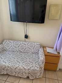 The IKEA solsta sofa bed is compact (sofa 54"x31"; bed area 46.5"x80.5"). The bed is bigger than a twin and smaller than a full/double. It sleeps up to 2 small people. The bed and sofabed are in the same area and when the sofa bed is open, it takes up nearly all of the floor space between the two. There is no separate bedroom, so only book if you are close to those you're traveling with =)