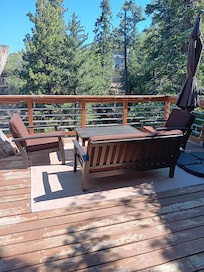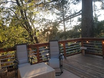 As you walk into this sweet cabin, you'll find an open living space with dining area, kitchen and wood burning fireplace (bring small pieces of wood under 10 inches). A sliding glass door opens to a huge private outdoor deck surrounded by majestic trees. You'll hear the creek and waterfalls in the serene setting that nature has provided during the snowy winter months. Enjoy your morning coffee on the inviting deck. Back inside - down 4 small steps - the main bedroom has a cozy queen sized bed. Second bedroom houses a full sized bed. Both rooms have TV, space heaters and table lamps with dual USB ports and touch control.