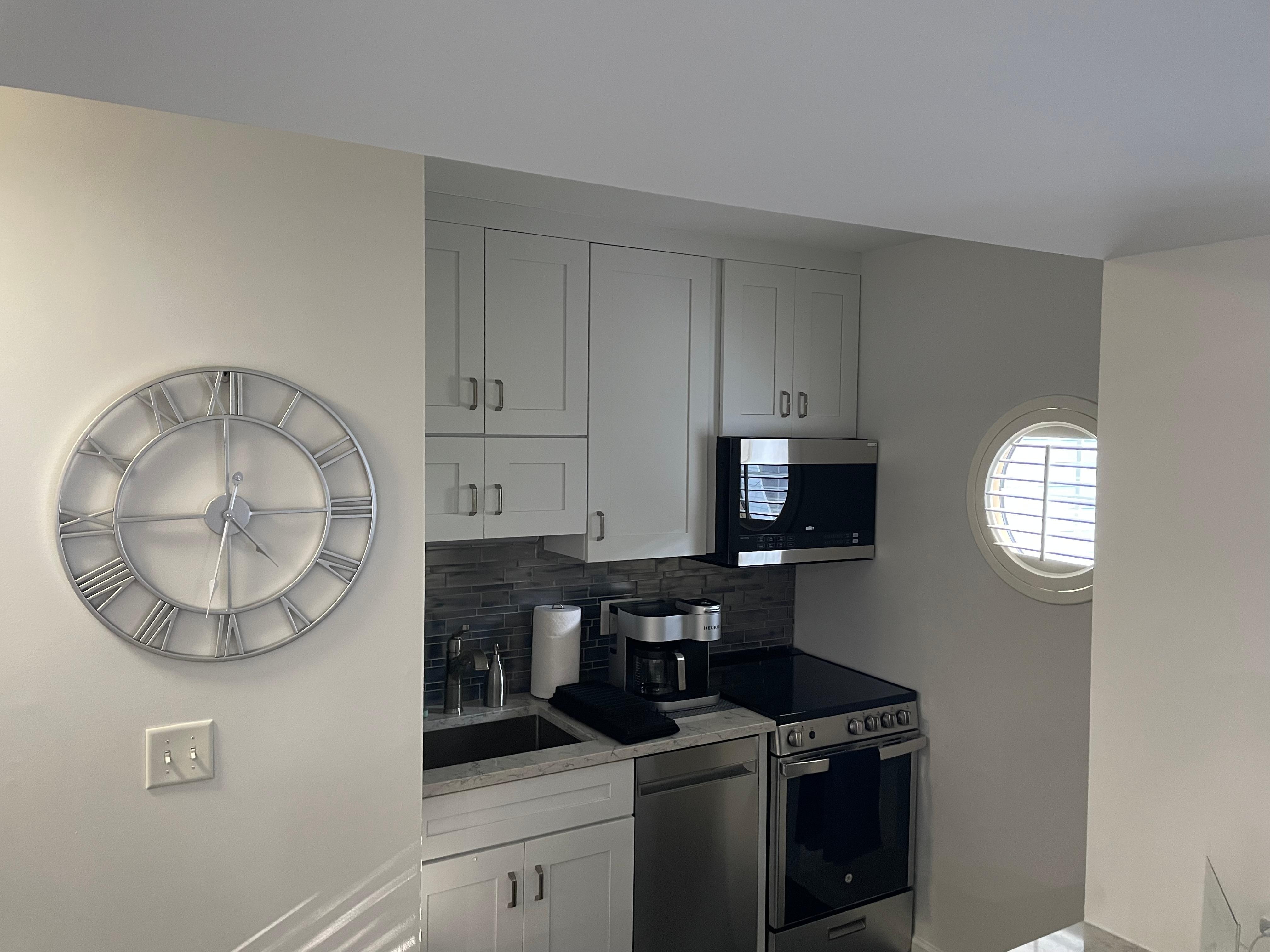 Indulge in the fully equipped kitchen with stainless steel appliances, including a refrigerator, microwave, and dishwasher. Start your day with the convenience of a Keurig dual drip and K-cup coffee maker, with complimentary coffee, decaf, tea, and hot chocolate provided for your enjoyment. Complete with dinnerware, the kitchen is ready for you to prepare delicious meals during your stay.