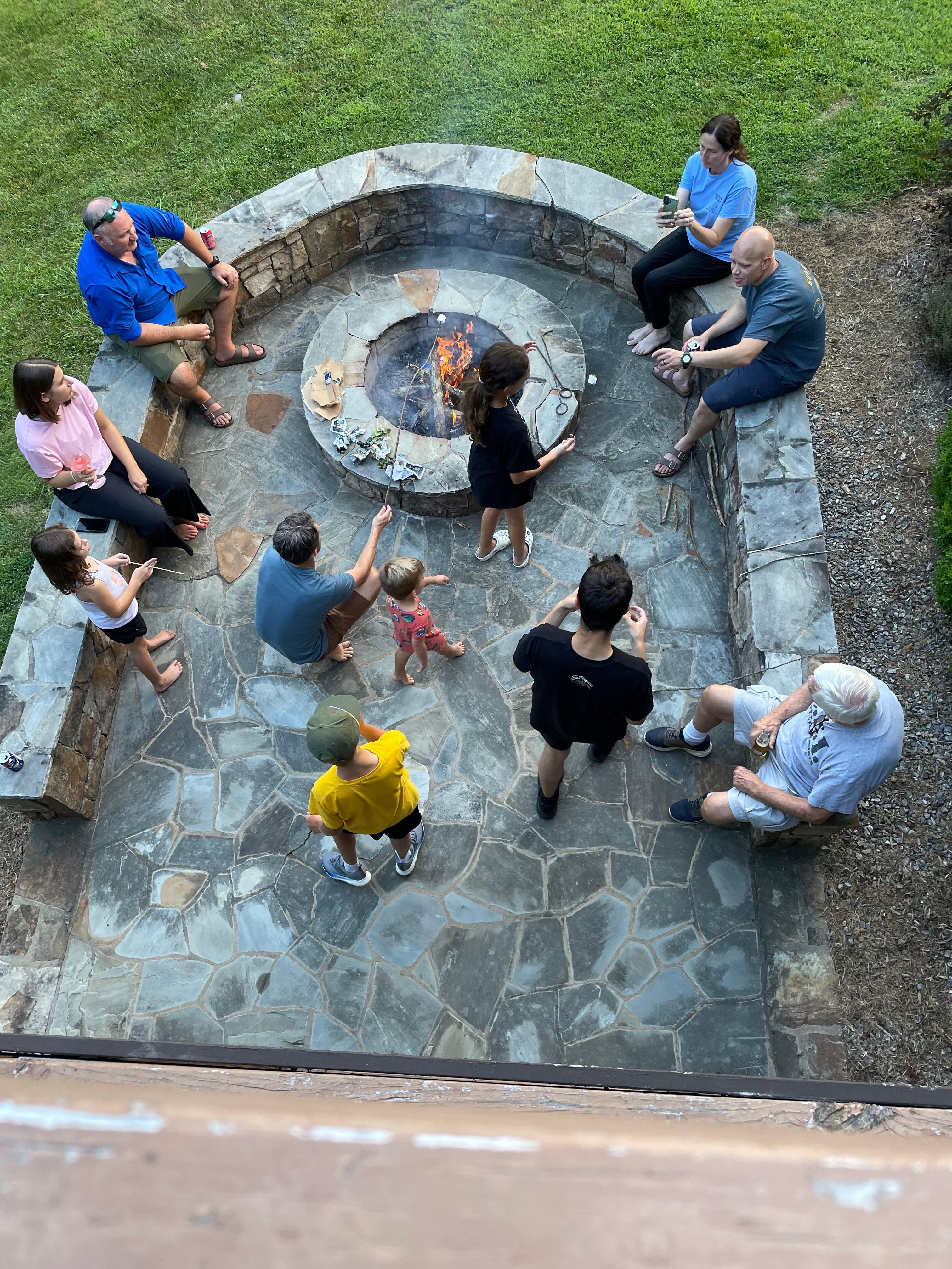 • Outdoor living area with gas grill, dining tables, screened porch and fireplace.