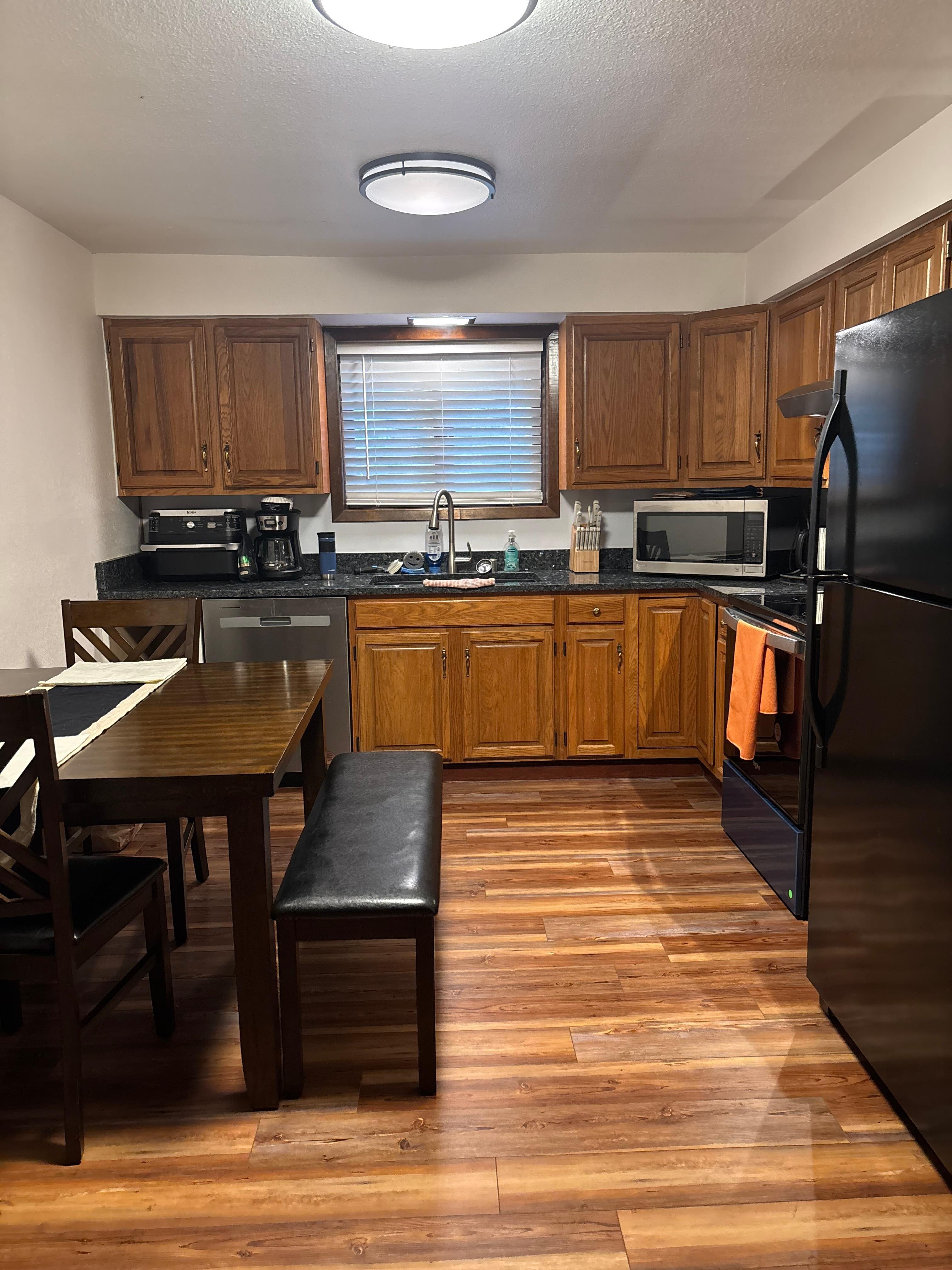 The space has a well-equipped and clean kitchen with luxurious granite countertops. For your practicality and convenience, it has refrigerator, microwave, electric kettle, stove & oven, dishwasher and other cooking essentials.
