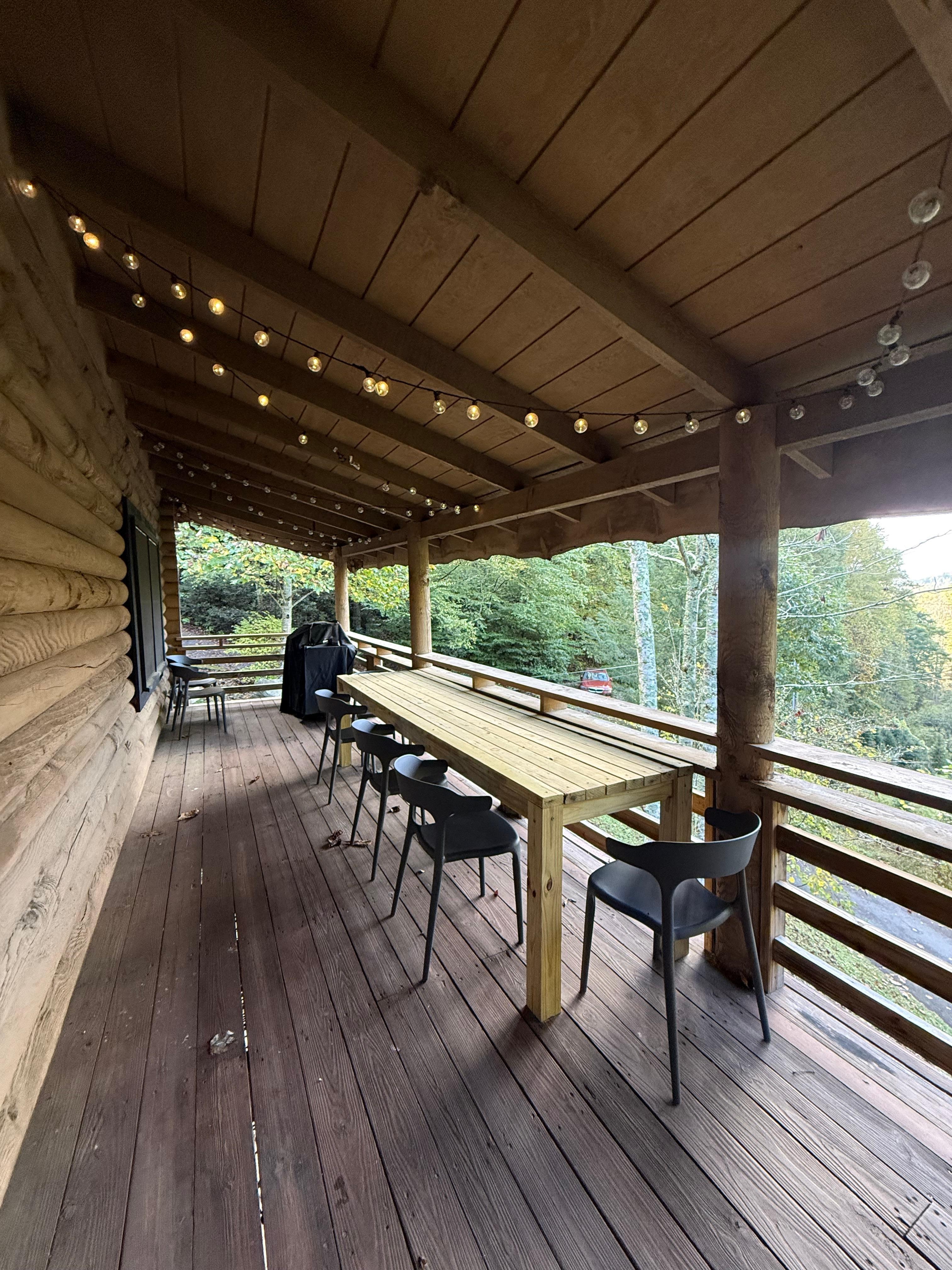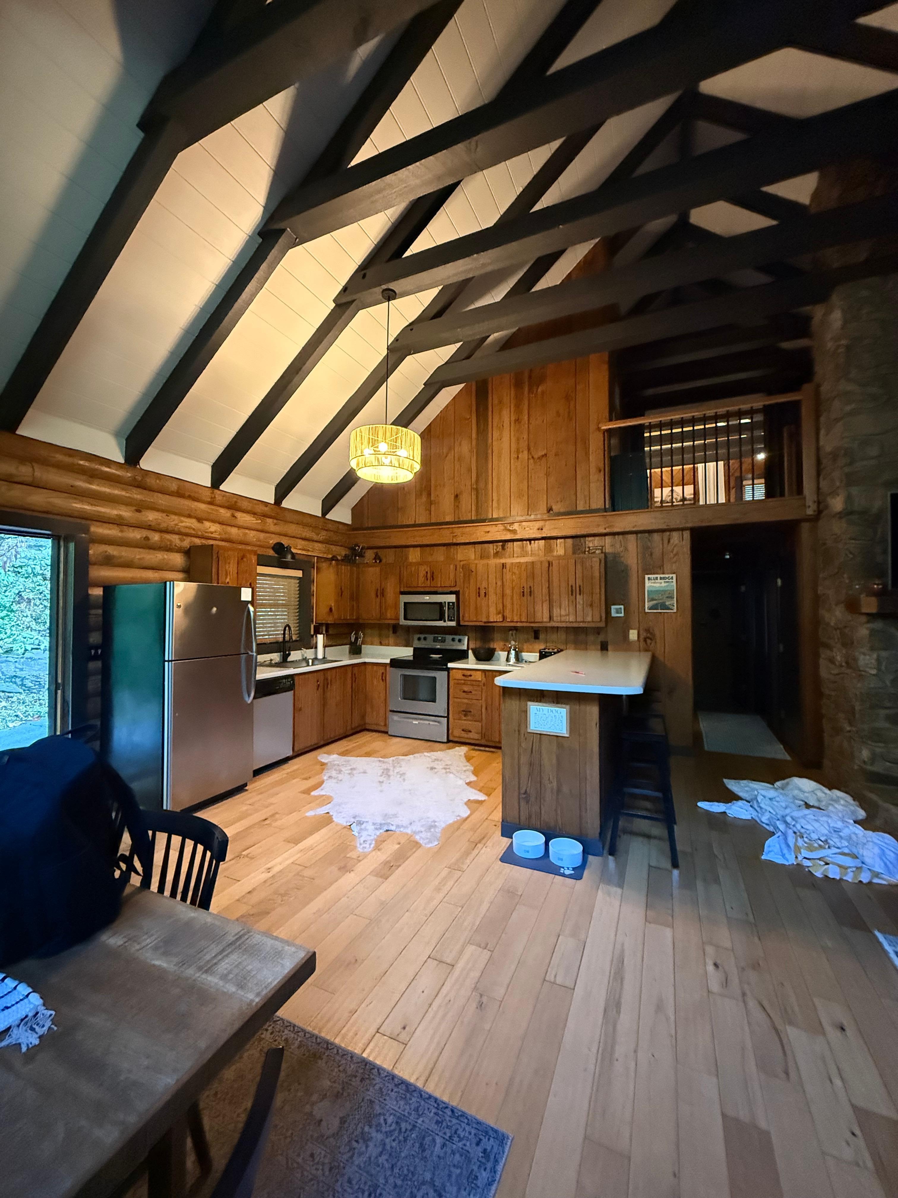 Nestled in the mountains, this charming log home offers a perfect blend of rustic elegance and modern comfort. The home is adorned with a large rock formation and small brook. The open floor plan seamlessly connects the living, dining, and kitchen areas, creating a spacious and inviting atmosphere. Central to the living area is a beautiful gas fireplace, its warm glow providing a cozy ambiance. Cozy up on the couch to warm up by the fire after a day of hiking or skiing. Step outside on the covered deck where the bistro lights create an enchanting atmosphere to enjoy your morning coffee or evening drink. Grill dinner on the gas grill and enjoy outdoor dining. The well-equipped kitchen features modern appliances and plenty of counter space, ideal for preparing meals. Enjoy dining around the large table, with seating for eight, or relax at the island peninsula, with seating for four additional guests. The natural beauty of the log interior enhances your mountain experience. Ideal for a romantic retreat or a family getaway, this log home in the woods promises relaxation and memorable moments amidst nature's tranquility.