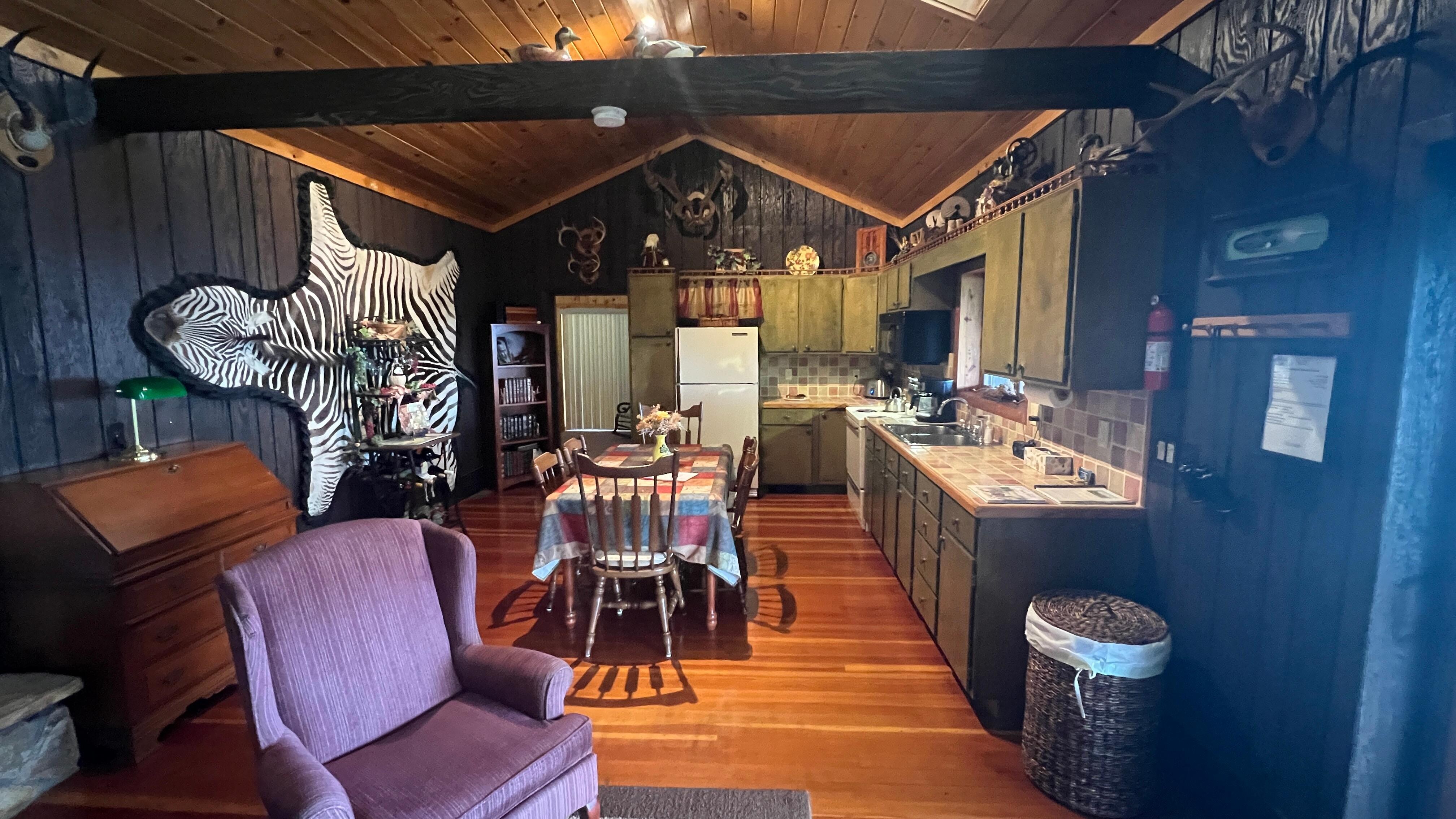 The well equipped Kitchen has a window overlooking the lake with a stove, an oven, refrigerator, a microwave oven and coffee maker. The home has propane heating for the chilly nights in the early summer and fall.