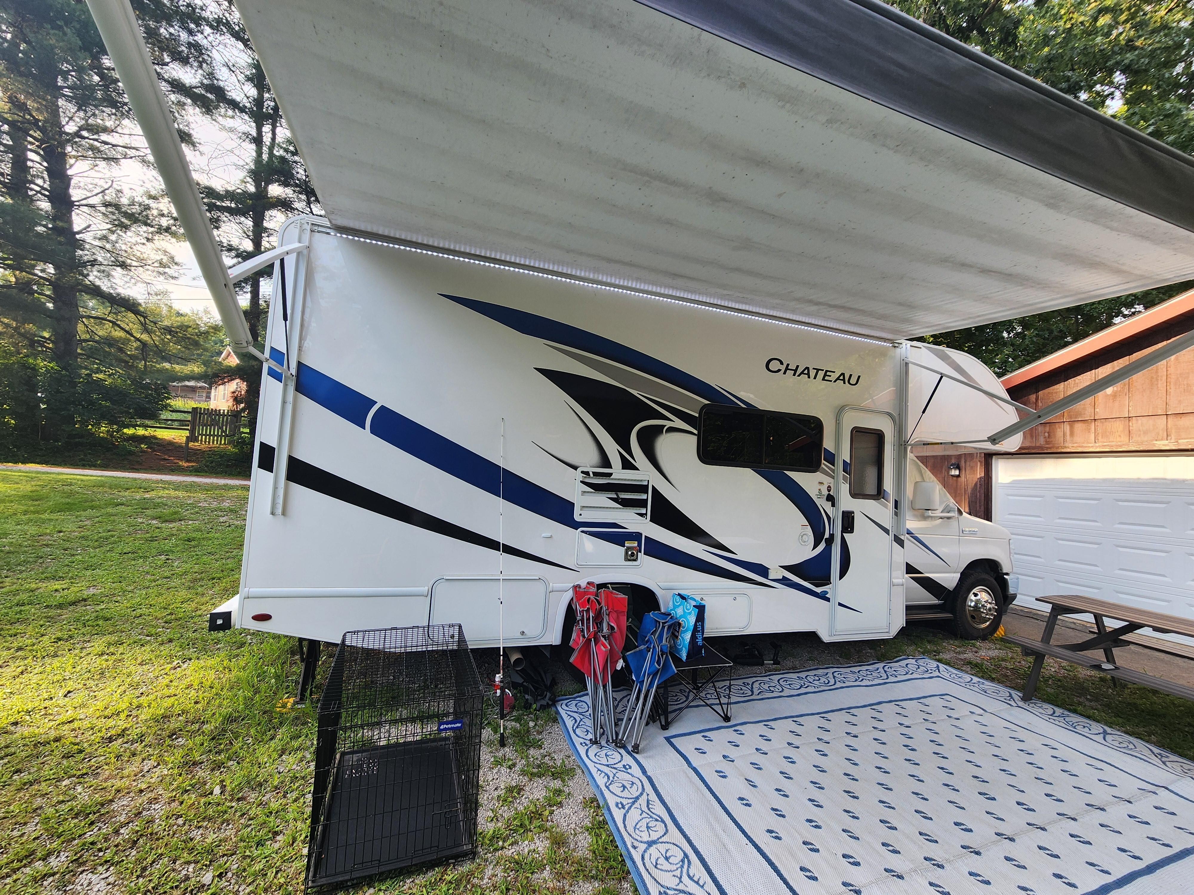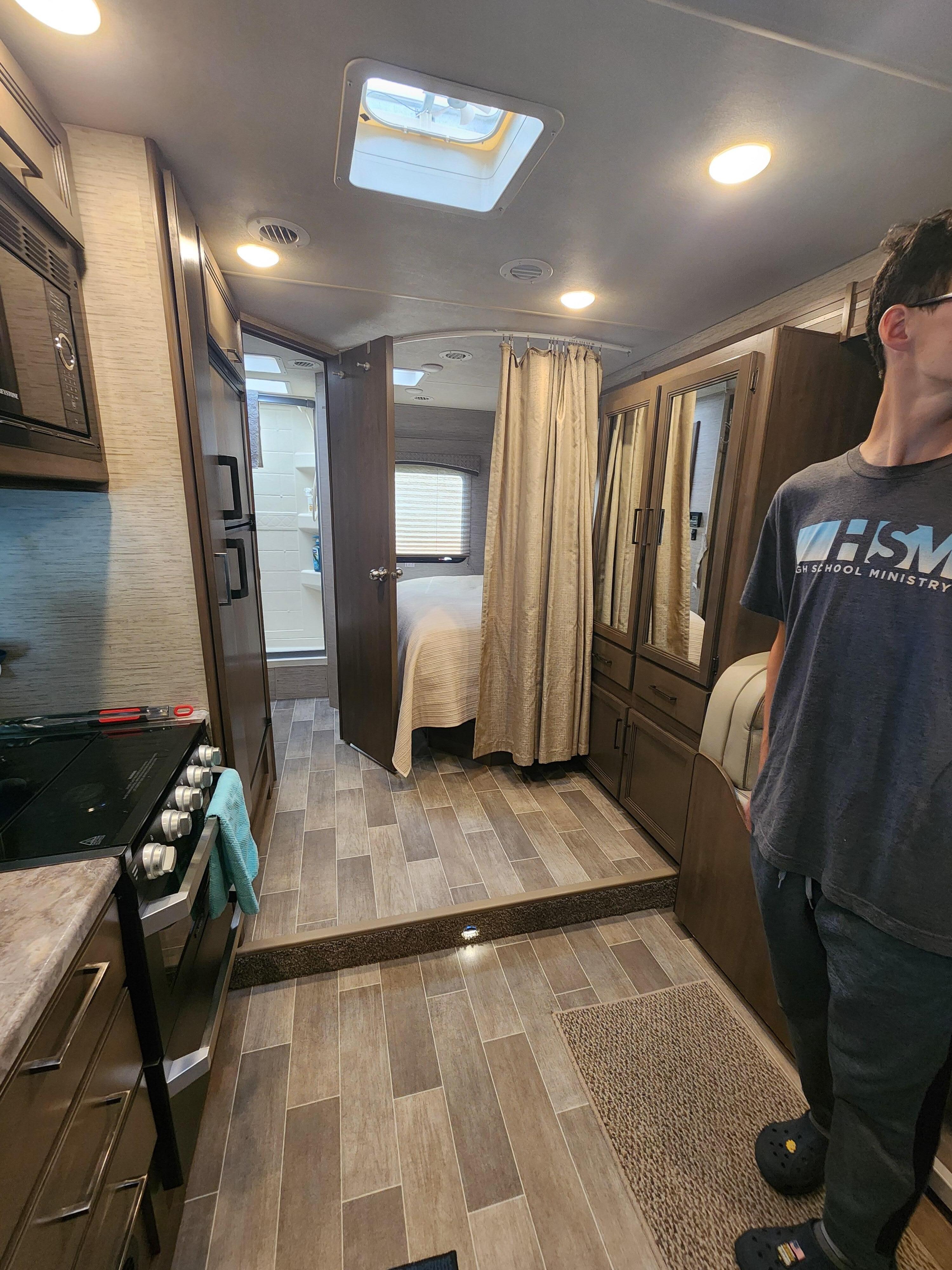 The RV includes a queen bed separated by a privacy curtain, a dinette that can convert into a full bed, and a loft that is also a full size sleeping area. A/C, furnace, refrig / freezer, microwave, stove and oven, bathroom with step in shower make this GLAMPING and not just camping.