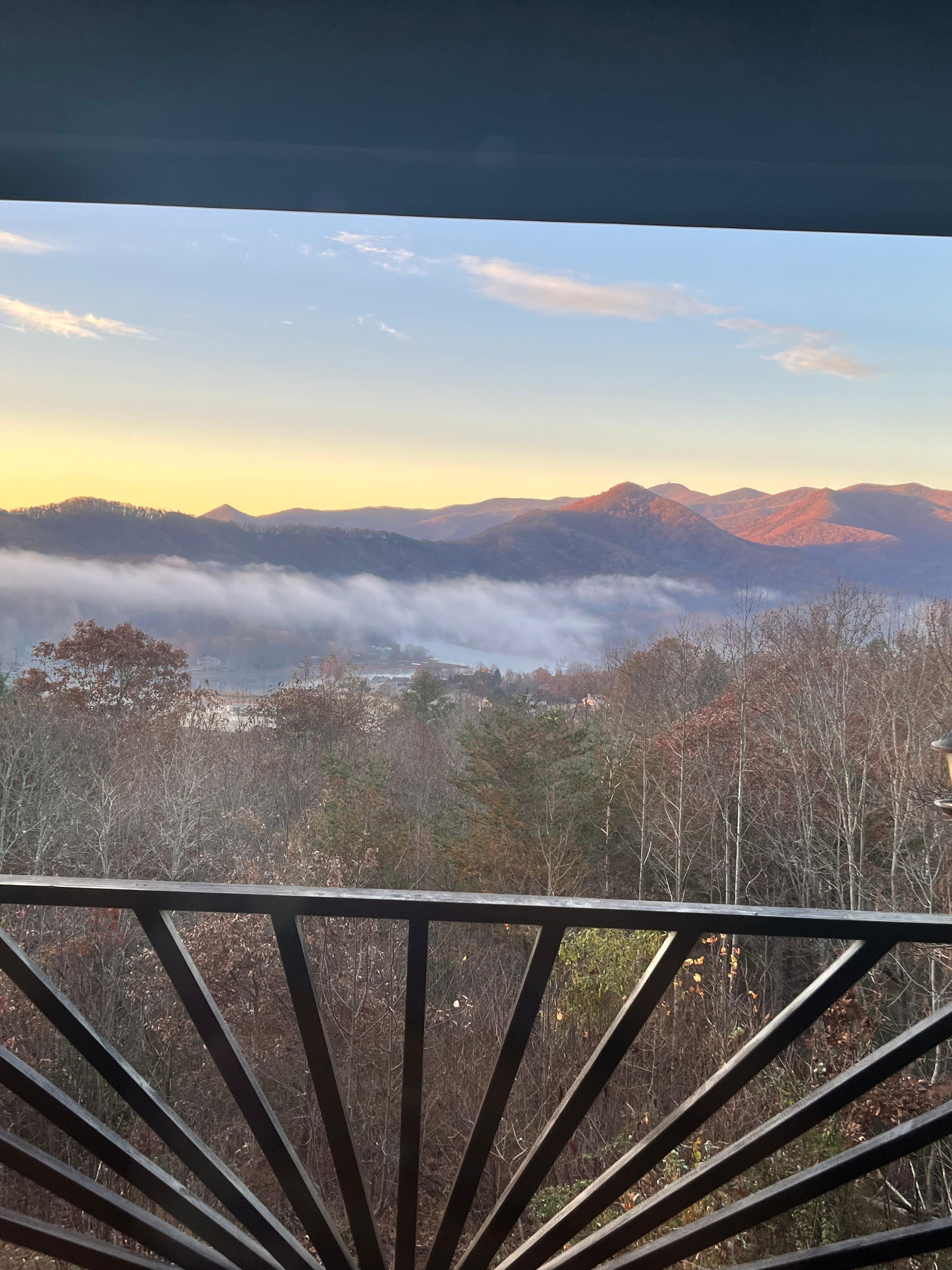 One of the best views in Hiawassee. From nearly every room, take in panoramic views of Lake Chatuge, the U.S. National Forest, and Brasstown Bald—the tallest point in Georgia. Enjoy stunning sunsets from the wrap-around covered deck, complete with lounge chairs, rocking chairs, outdoor dining, and ceiling fans. A security camera is located at the front porch and covers only the driveway area.