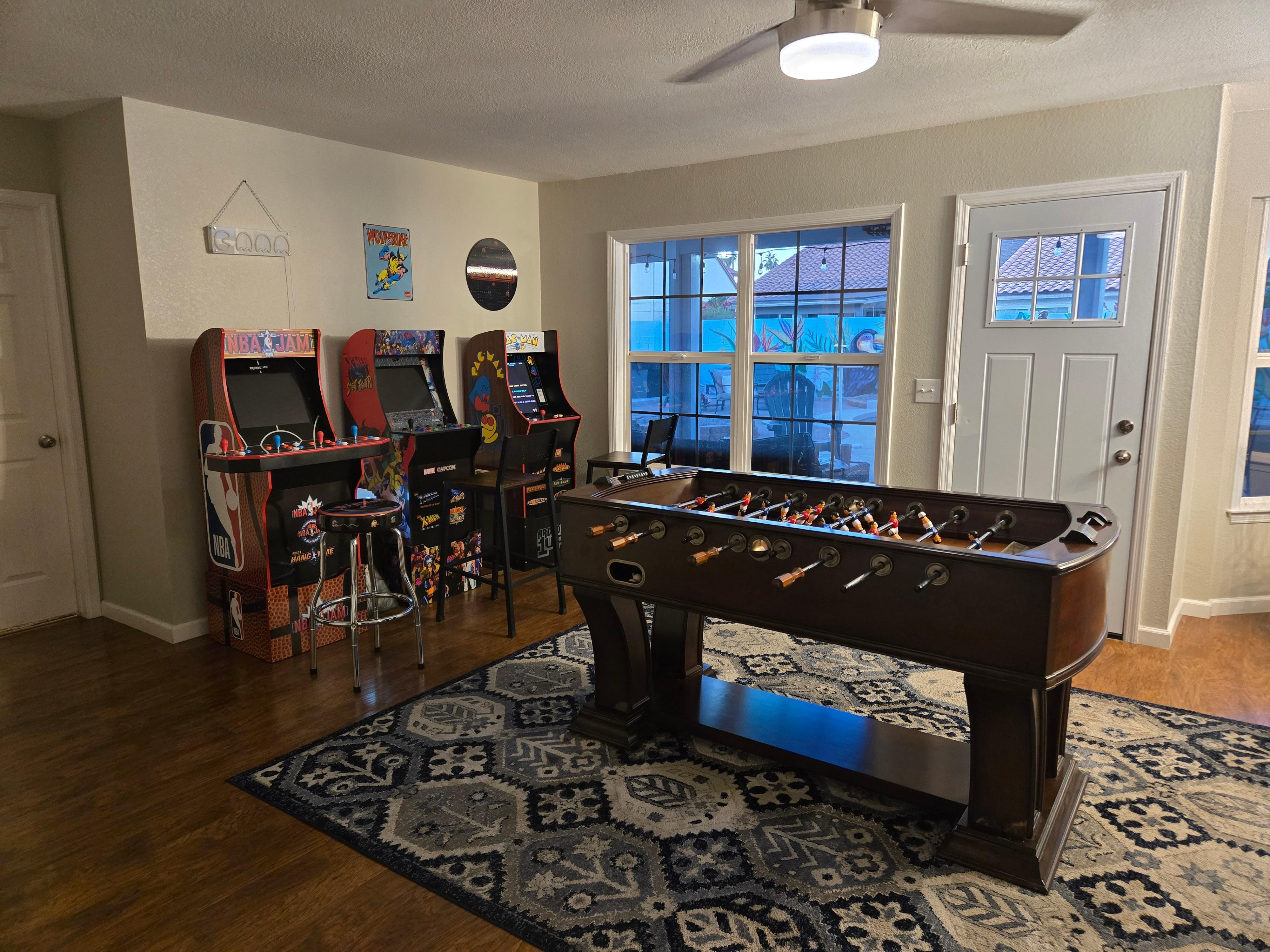 The interior of this home is a haven of comfort and entertainment. The cozy family room features plush furnishings and a large smart TV, perfect for relaxing evenings. The open floor plan seamlessly connects the fully equipped kitchen, a charming kitchen nook with views of the colorful backyard oasis, a bar area, an exciting game room with a foosball table and arcade games, and an elegant dining area for memorable family meals.