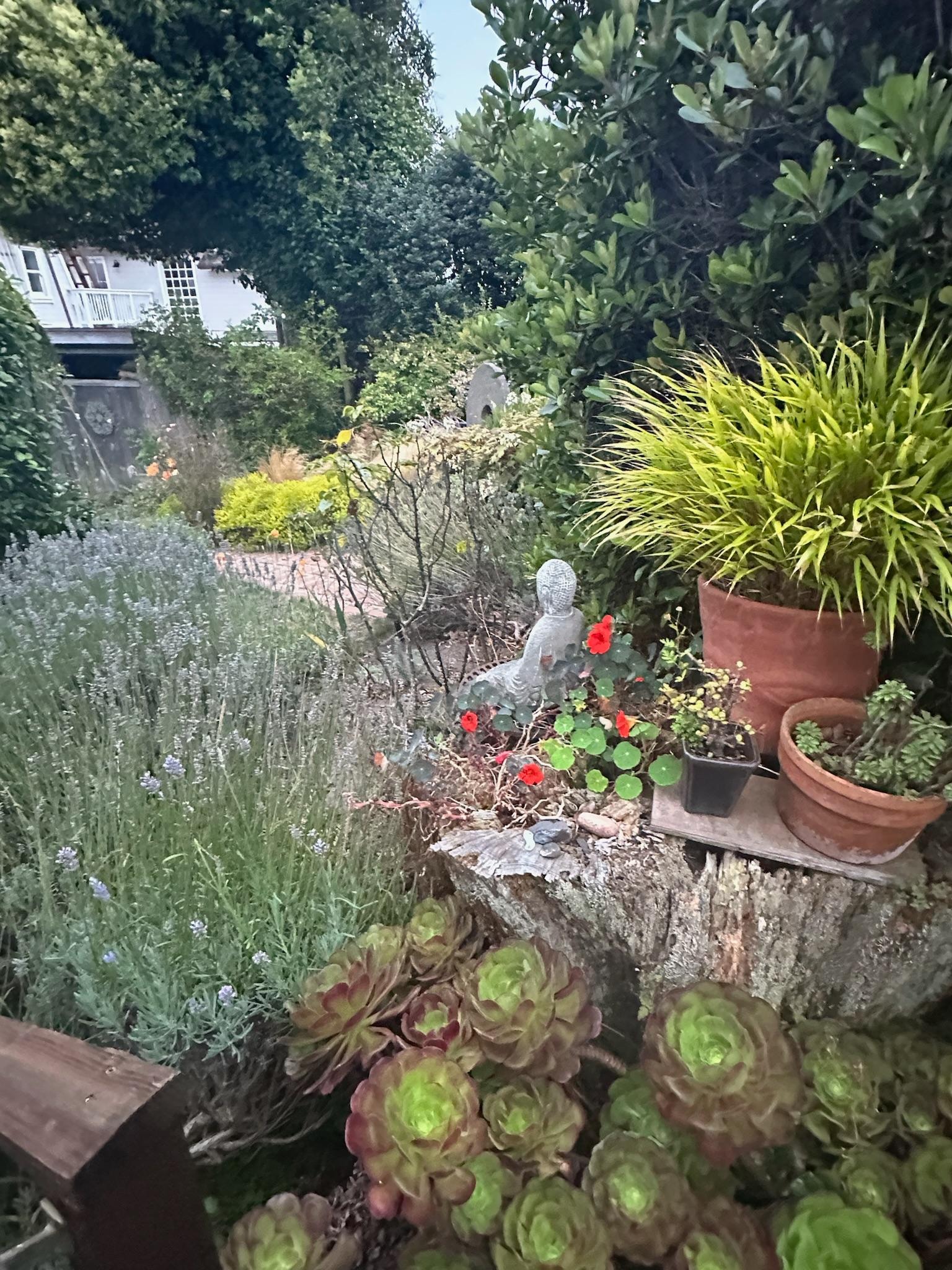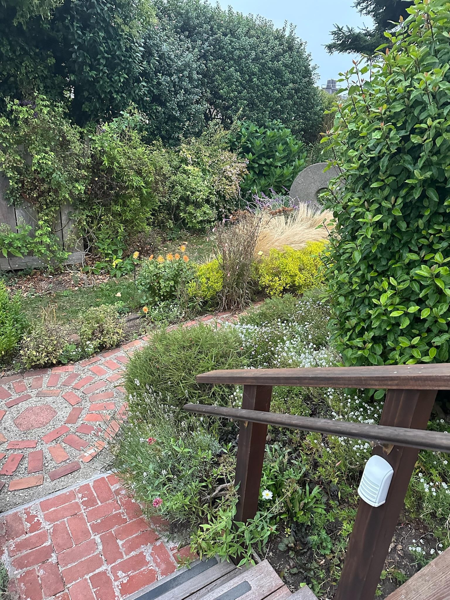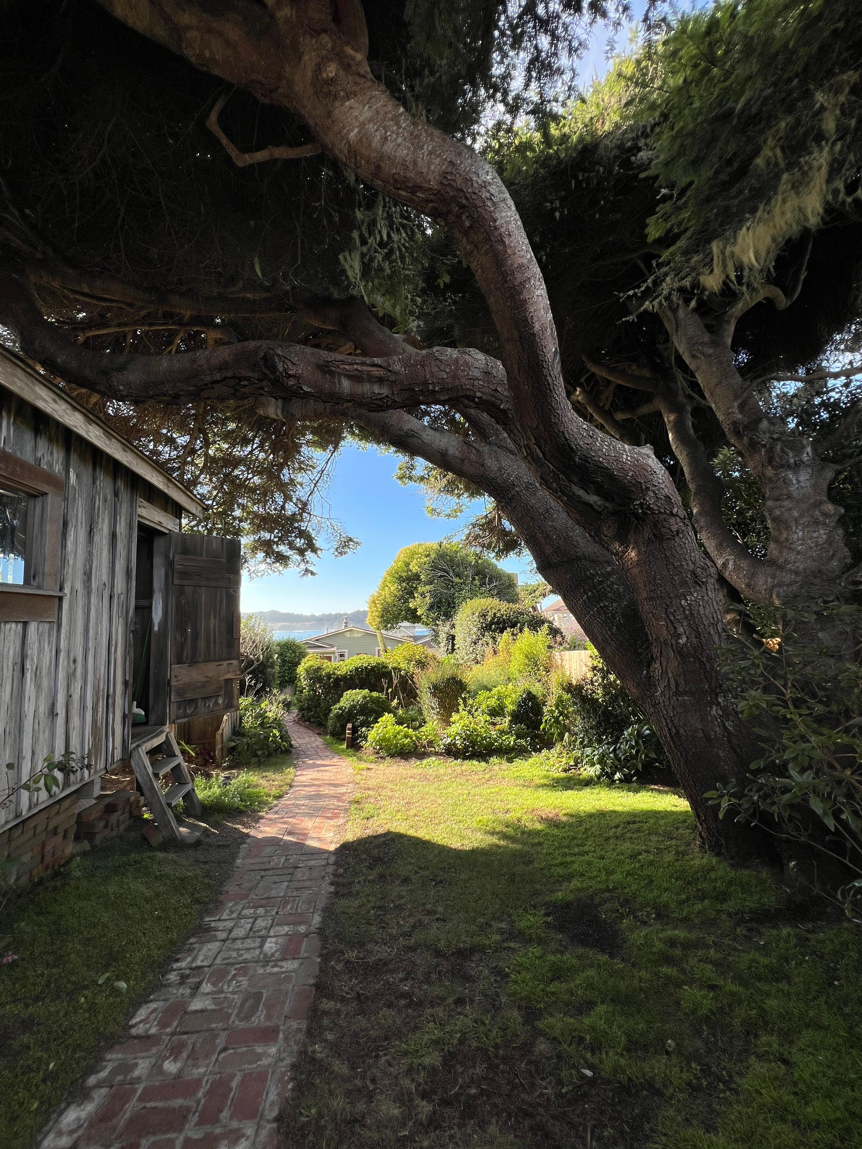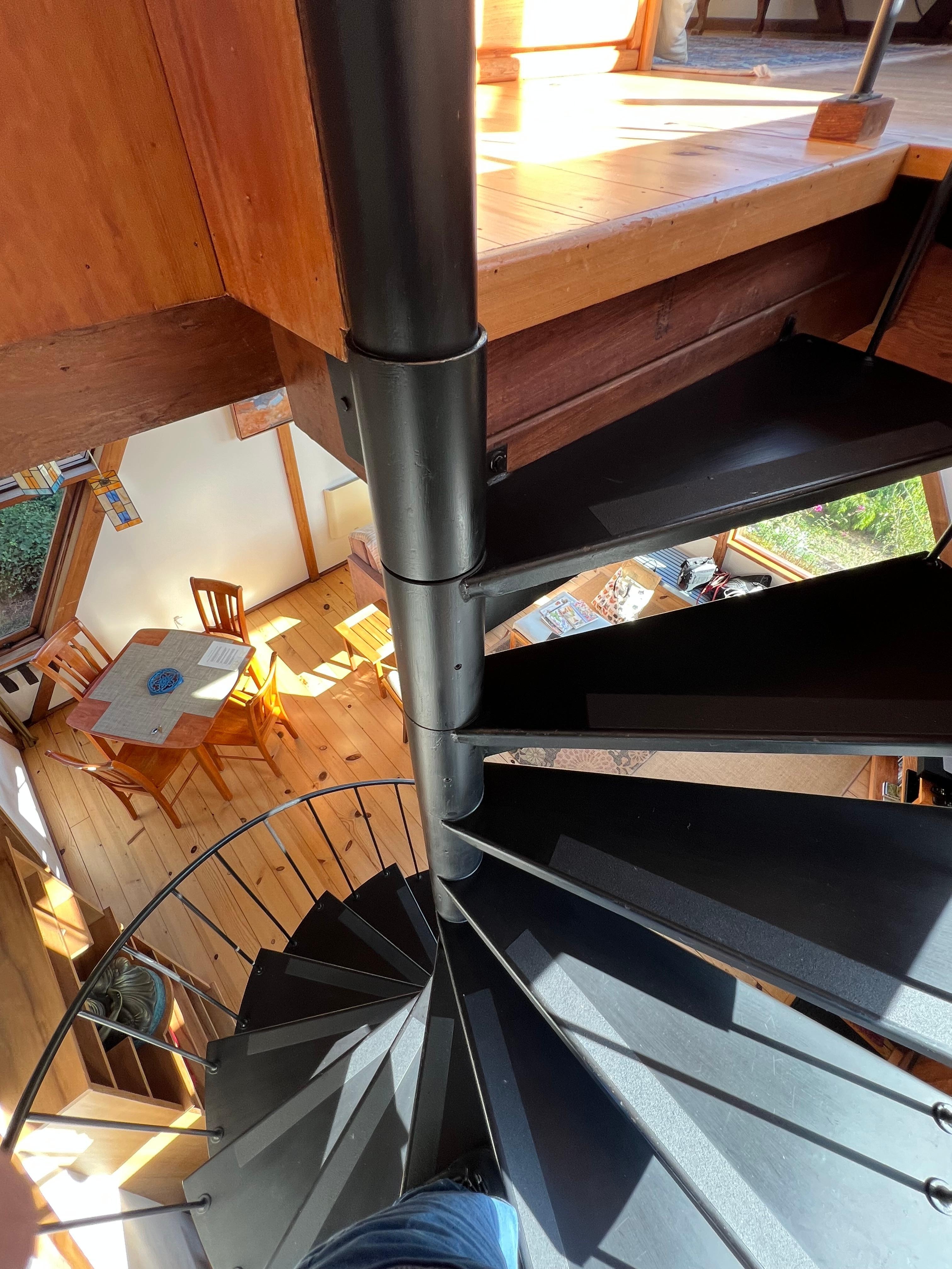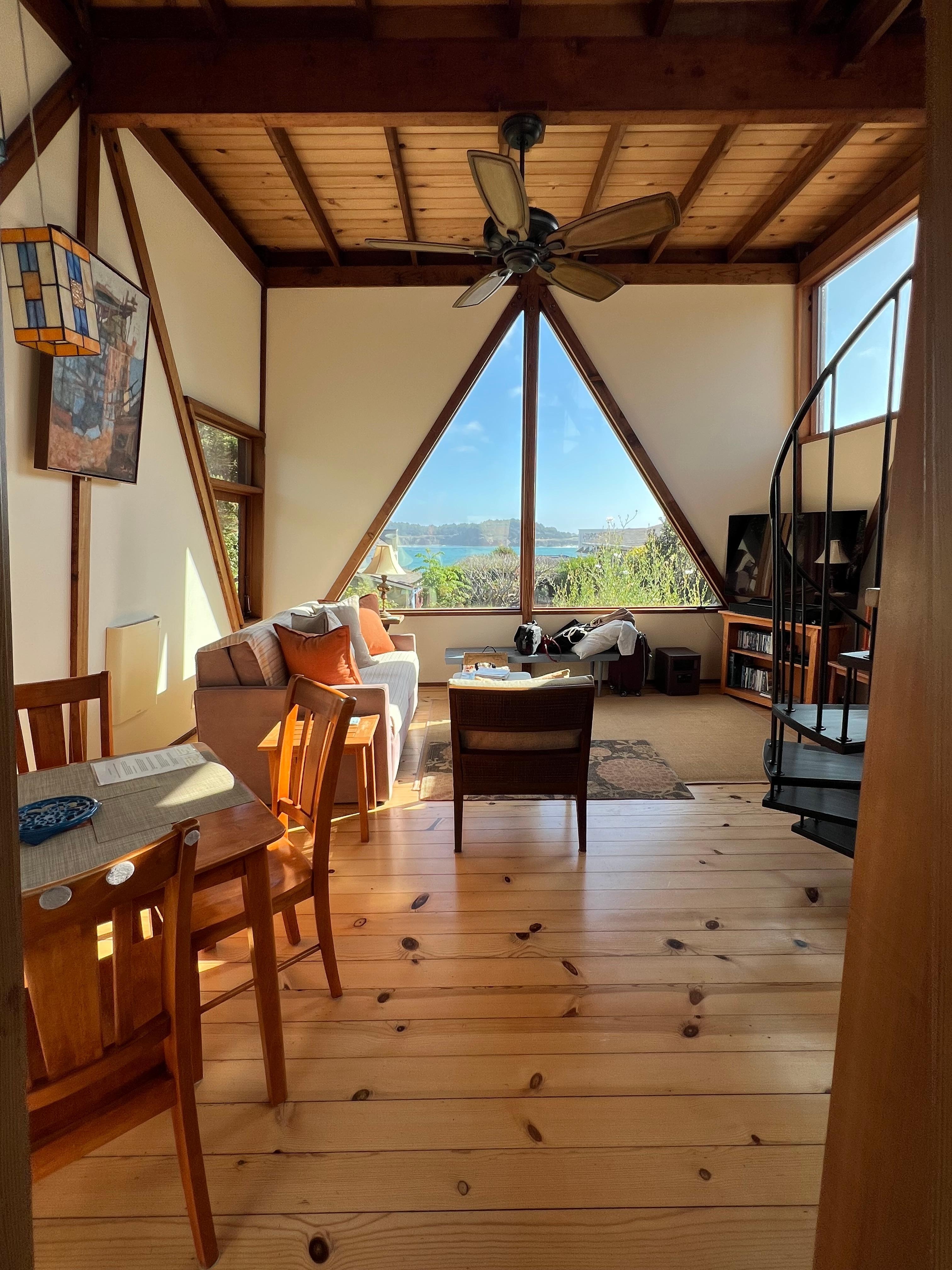 Downstairs there is a queen sleeper sofa with a flowering garden and pond just beyond the triangular glass paned windows. The spiral staircase leads to a airy room with a queen bed. In winter you may see the grey whales as they migrate down the coast of California, and in the Spring the headlands are covered with wildflowers. The galley kitchen, where simple meals can easily be prepared, opens onto a garden patio where you can enjoy your meal, or there is a cozy dining area in the main living space.