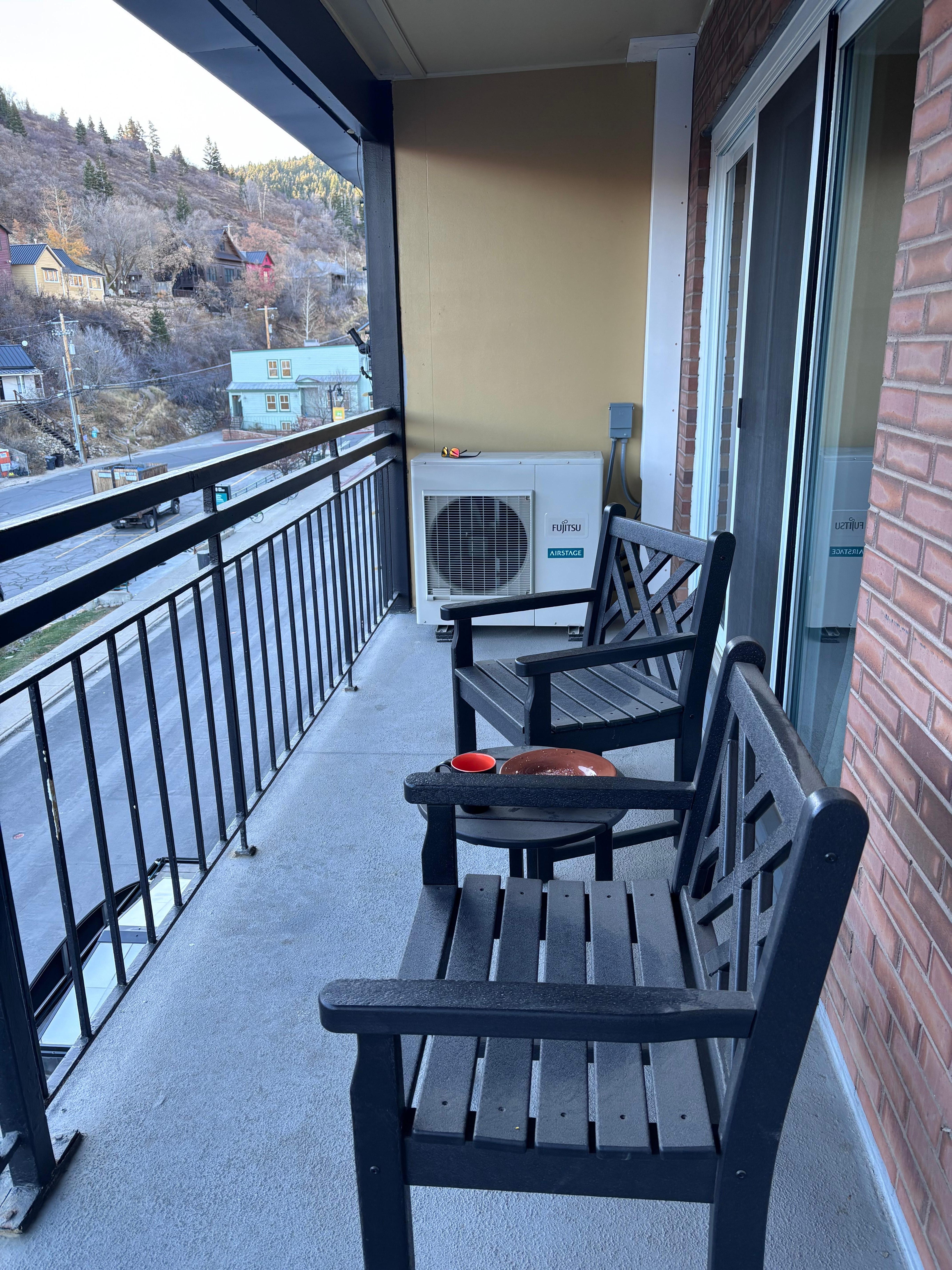 Private Balcony accessible from both the living room and bedroom, the balcony offers patio seating with stunning views of Historic Main Street.