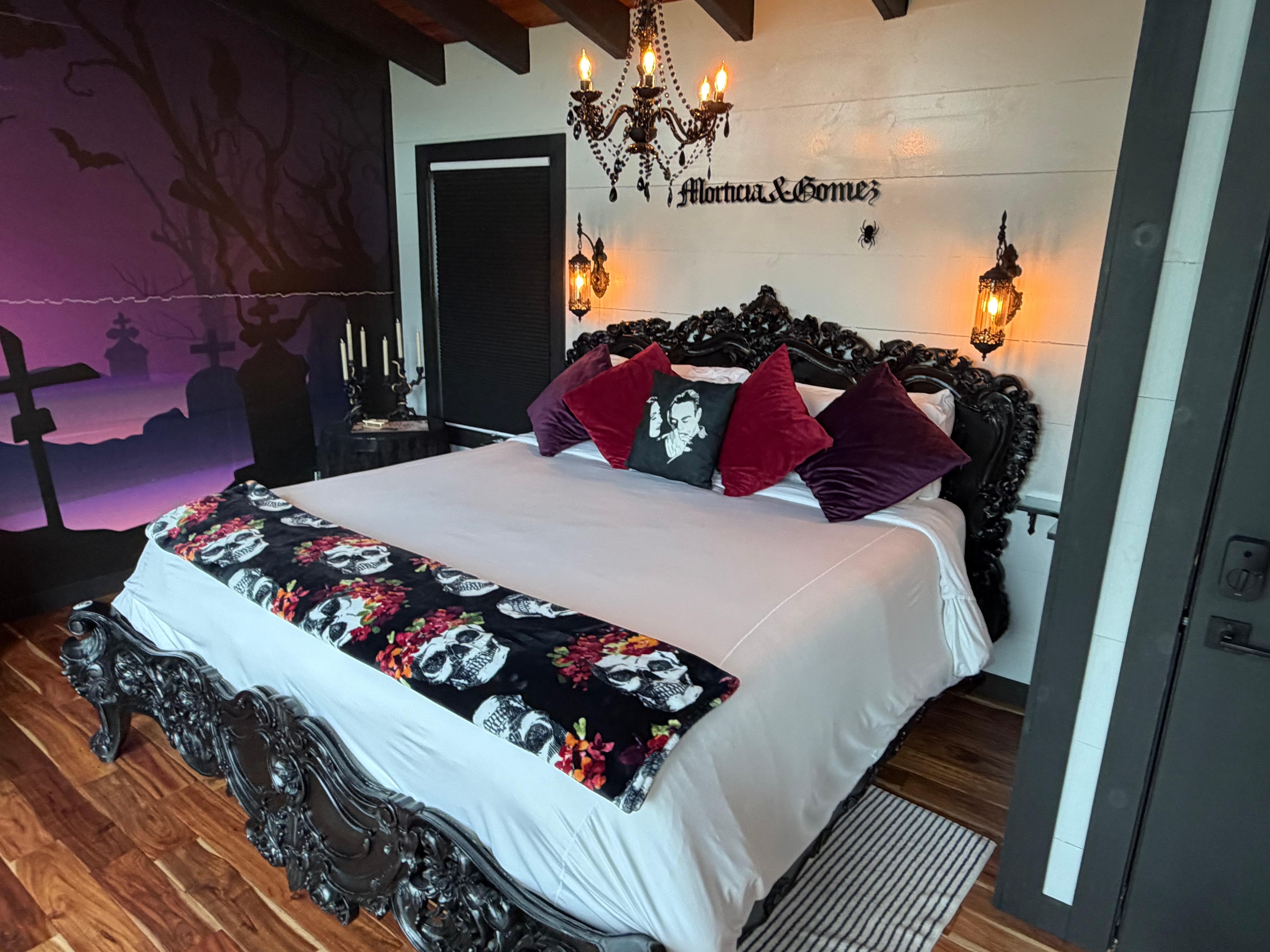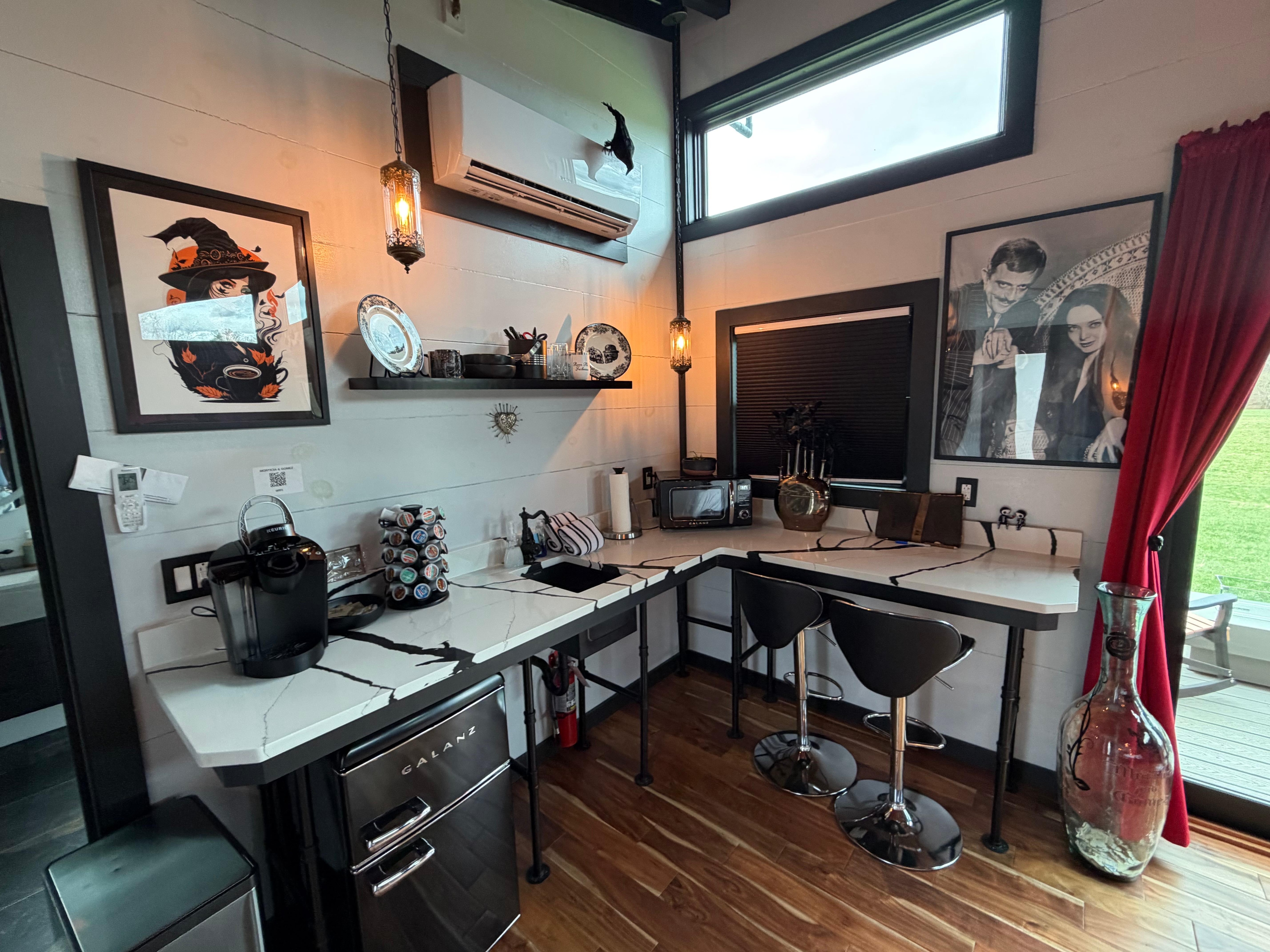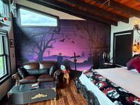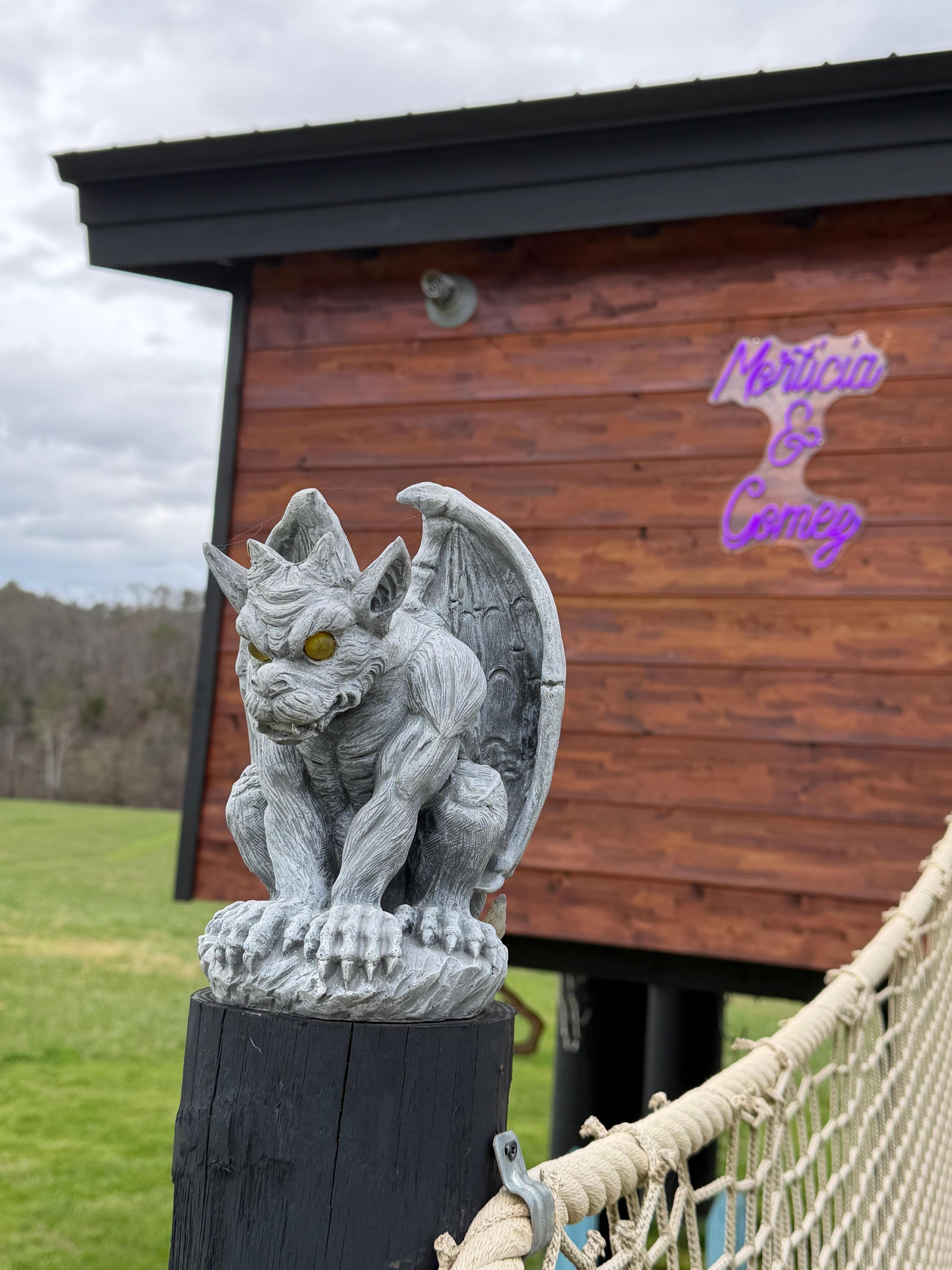 Dada Dada Da Dum Snap Snap! Step into the ghoulish, gothic world of the Addams Family. Our favorite creepy, kooky, romantic couple Morticia and Gomez will take you back to the fun of the TV show and movies. Go on a scavenger hunt to find the 27 references to the Addams Family movies and show in the decor. Huge gothic romantic king-size bed, gothic lighting, leather loveseat, beautiful kitchenette, hot tub, fire pit, beach chairs & tubes for you to enjoy the river all make for a memorable stay. If you loved the movie The Addams Family, you will love this treehouse. Gothic, romantic, comfortable and peaceful in middle of 57 acre farm with 1/2 mile of river frontage in downtown Sevierville. Through the tree gate, you will wind along the road to your "treehouse". Your hauntingly good time begins as soon as you enter through our automatic tree gate and continues when you pull up to your parking spot and then walk up the log rope bridge guarded by two gargoyles. Egg chairs underneath to enjoy.
