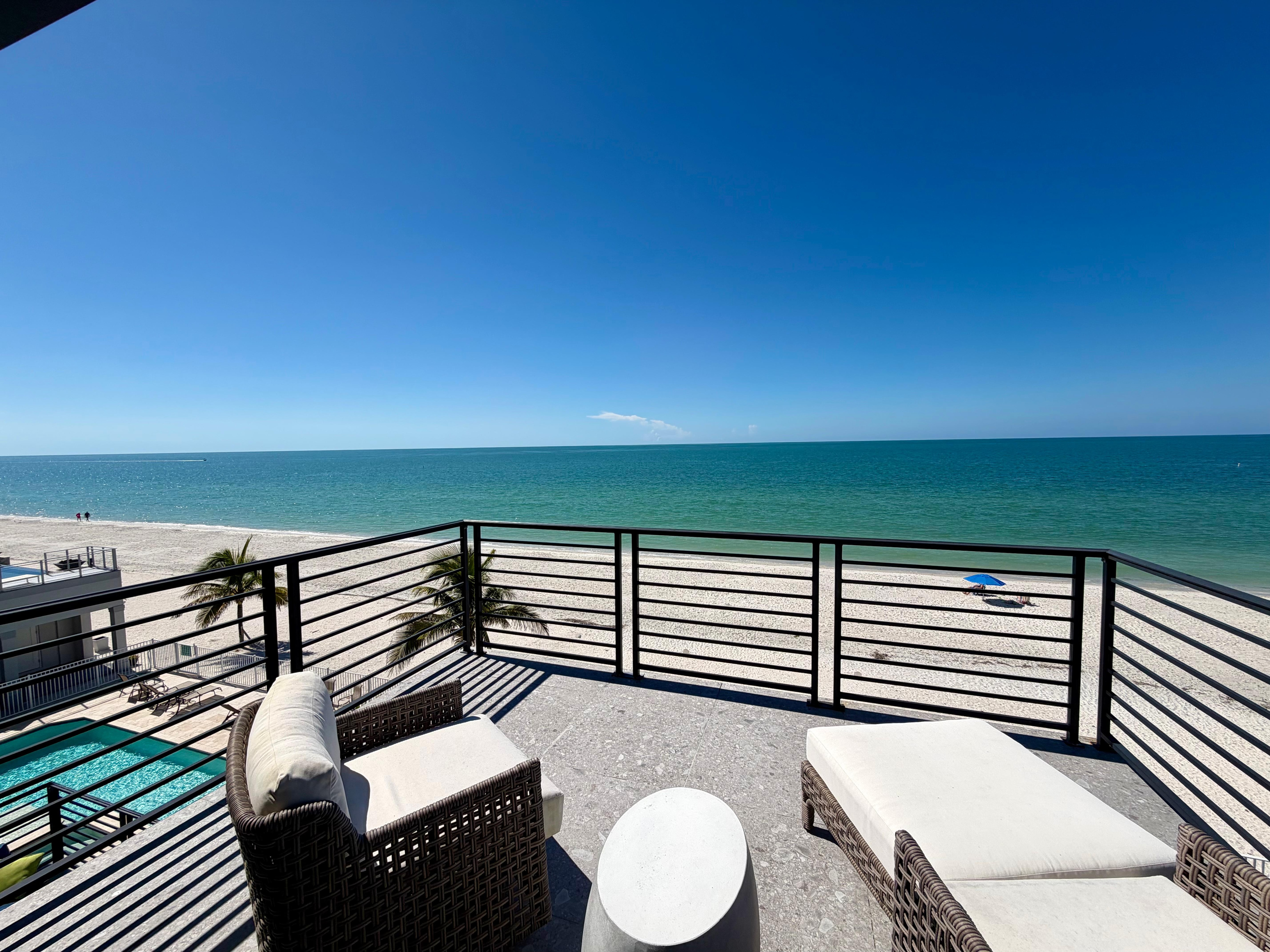 The top floor of the home is dedicated to three luxurious bedrooms, each with its own ensuite bathroom, offering privacy and comfort for all guests. The master suite features a king bed and a large private balcony. The master bathroom is a spa-like retreat with a spacious walk-in shower, his-and-her vanities, and a large walk-in closet. The first guest room also boasts a king-size bed and includes a desk, for those that need to get a little work done. The ensuite bathroom features dual vanities and a walk-in shower, offering a touch of luxury. Positioned at the back of the house, the second guest bedroom offers peaceful beach views. It is furnished with a king-size bed and has an ensuite bathroom with a single vanity and walk-in shower.