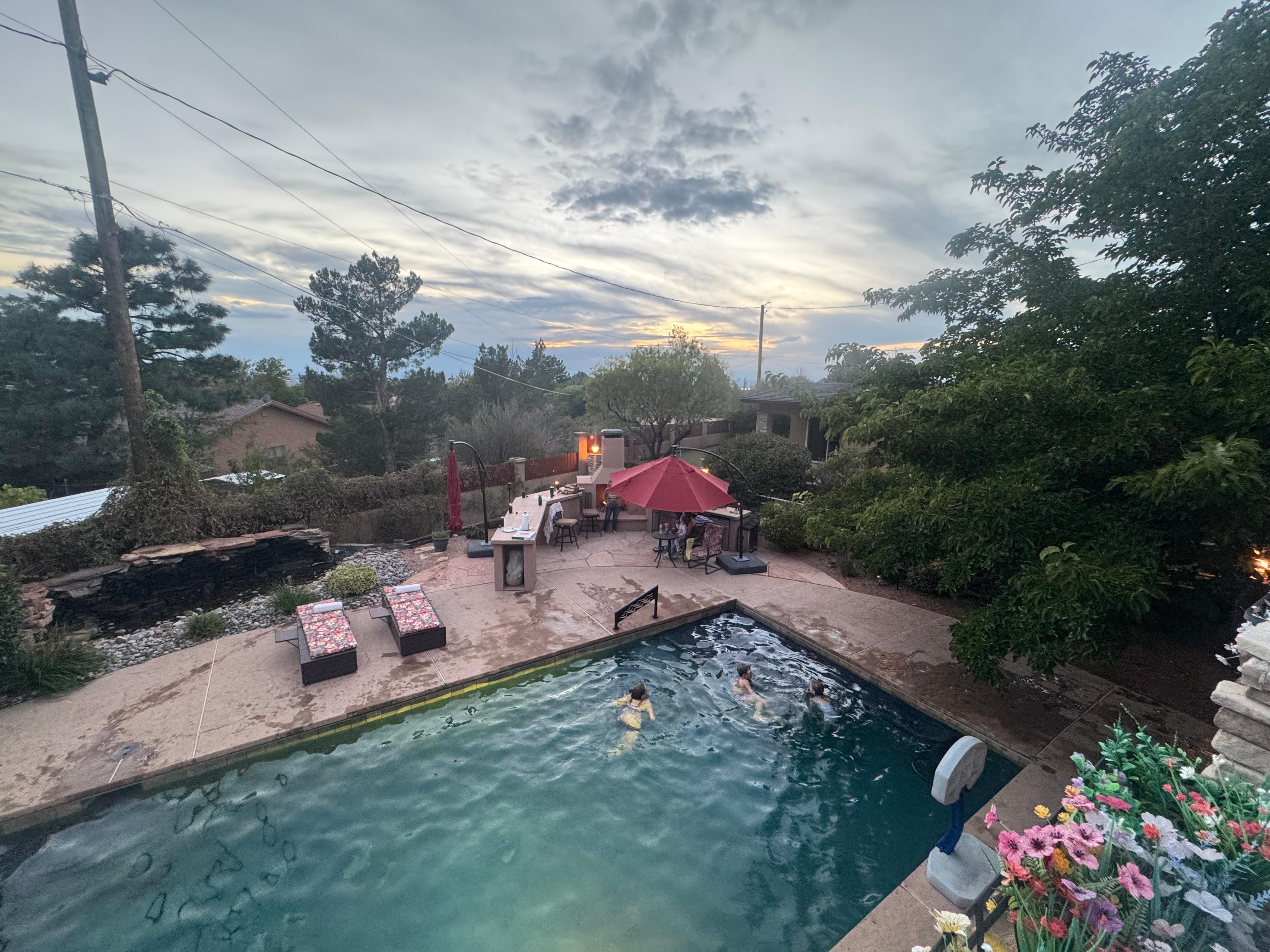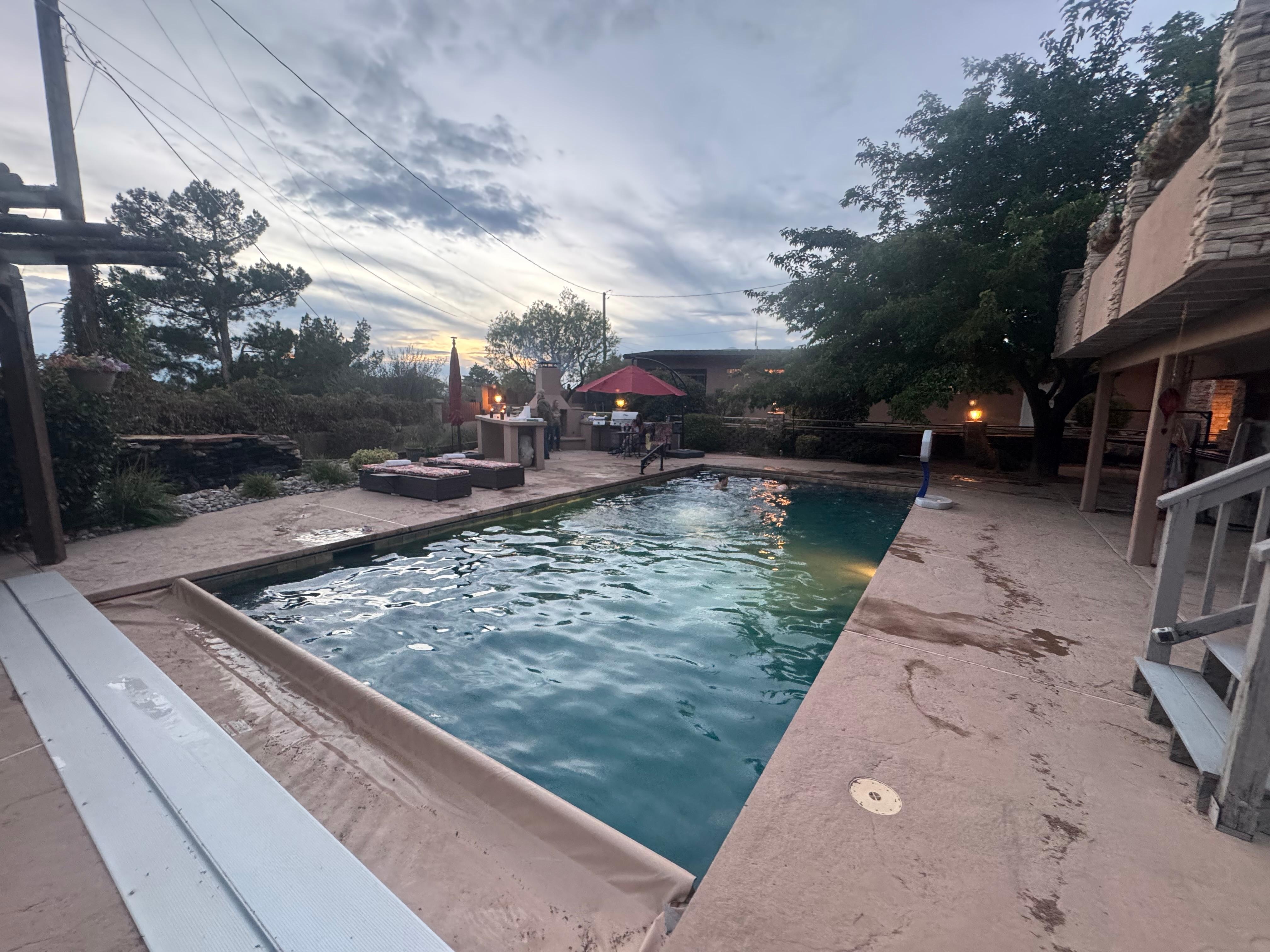 Charming 1200 sq ft guest house with 3 BR 2 BA nestled in the foothills of Albuquerque’s spectacular Sandia mountains. Refrigerated air and heat throughout. The backyard oasis boasts a warm, inviting heated pool and large hot tub. Enjoy the outdoor kitchen with grill, stove top, mini refrigerator and fireplace for dinner under the stars. Lounge and unwind to the peaceful sounds of the water fountain while stargazing or taking in a night swim. There is also a fun 9 hole putting green for getting a little golf in. This area has a variety of many birds and wildlife such as deer, fox, coyotes, raccoons, rabbits and squirrels that make themselves at home here and we also have a small turtle sanctuary.