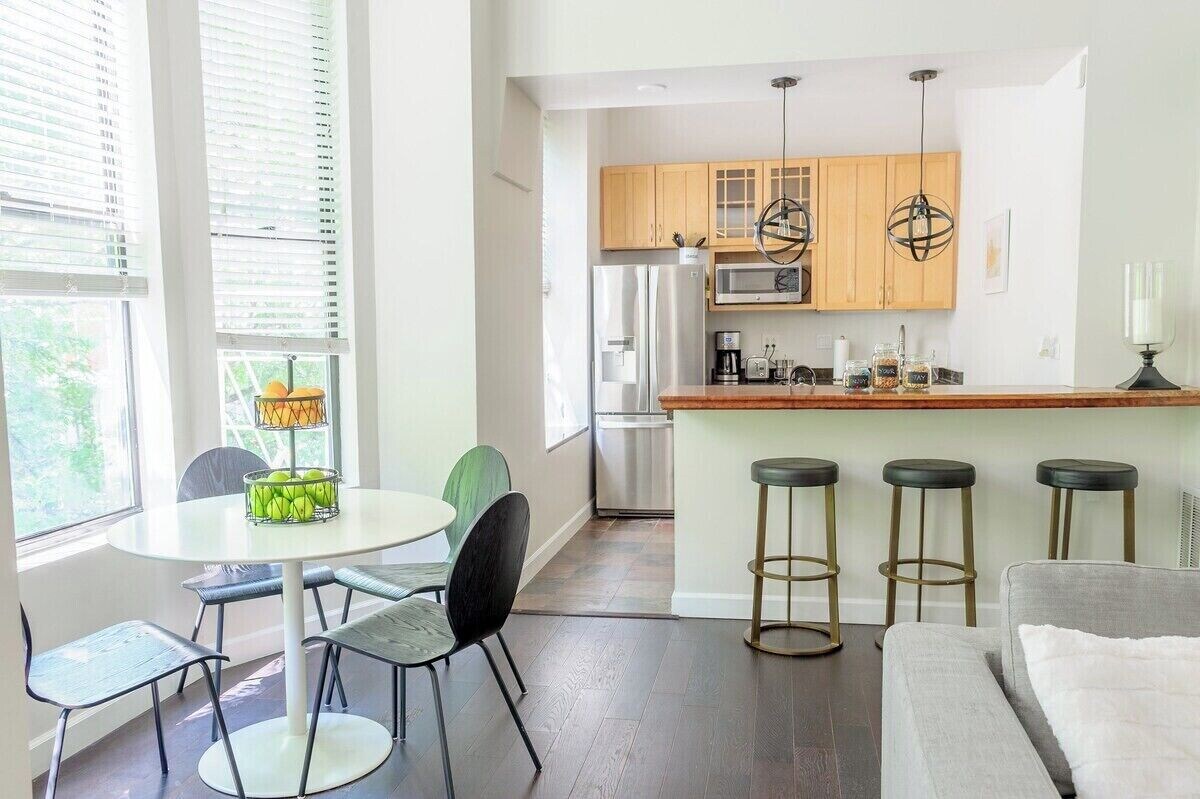 As soon as you step inside, you'll be greeted by a stylish and modern decor that showcases the best of Chicago's urban sophistication. The living room is spacious and inviting, with comfortable pull out sectional sofa that turns into a queen bed if needed and a large flat-screen TV for your entertainment. The dining area is perfect for hosting intimate dinners, while the fully equipped kitchen has everything you need to prepare delicious meals.