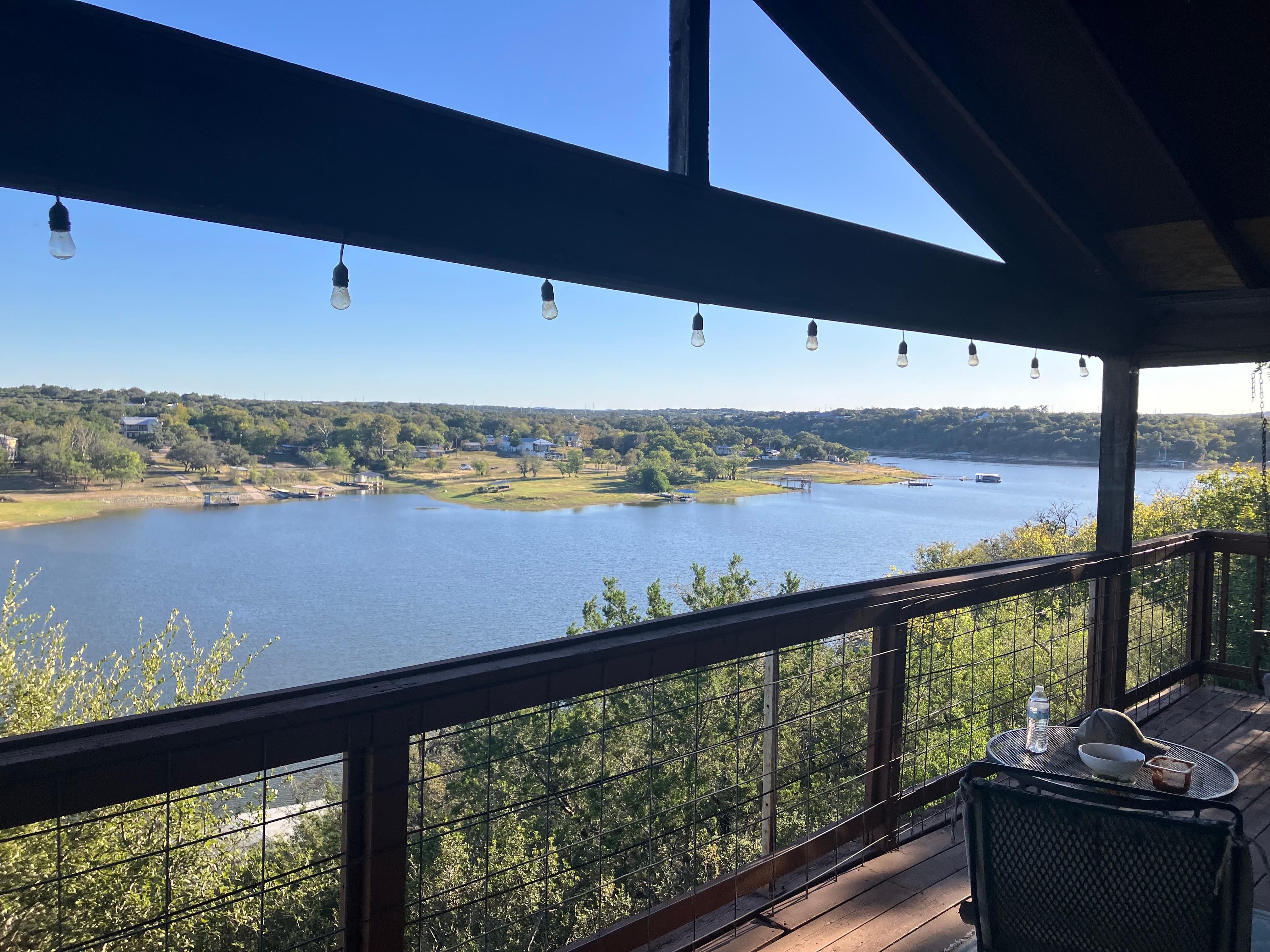 This is a peaceful little cabin/house perched above the winding Pedernales River arm of Lake Travis out in the Texas Hill Country. This summer of 2025 watch snowy egrets in the shoreline and graceful vultures soaring past the deck at eye level. Enjoy expansive sunrise views with morning birdsong and the evening glow of a rising moon in this serene setting. The river is full although not accessible due to recent floods. Enjoy a front row seat to all its wild beauty.