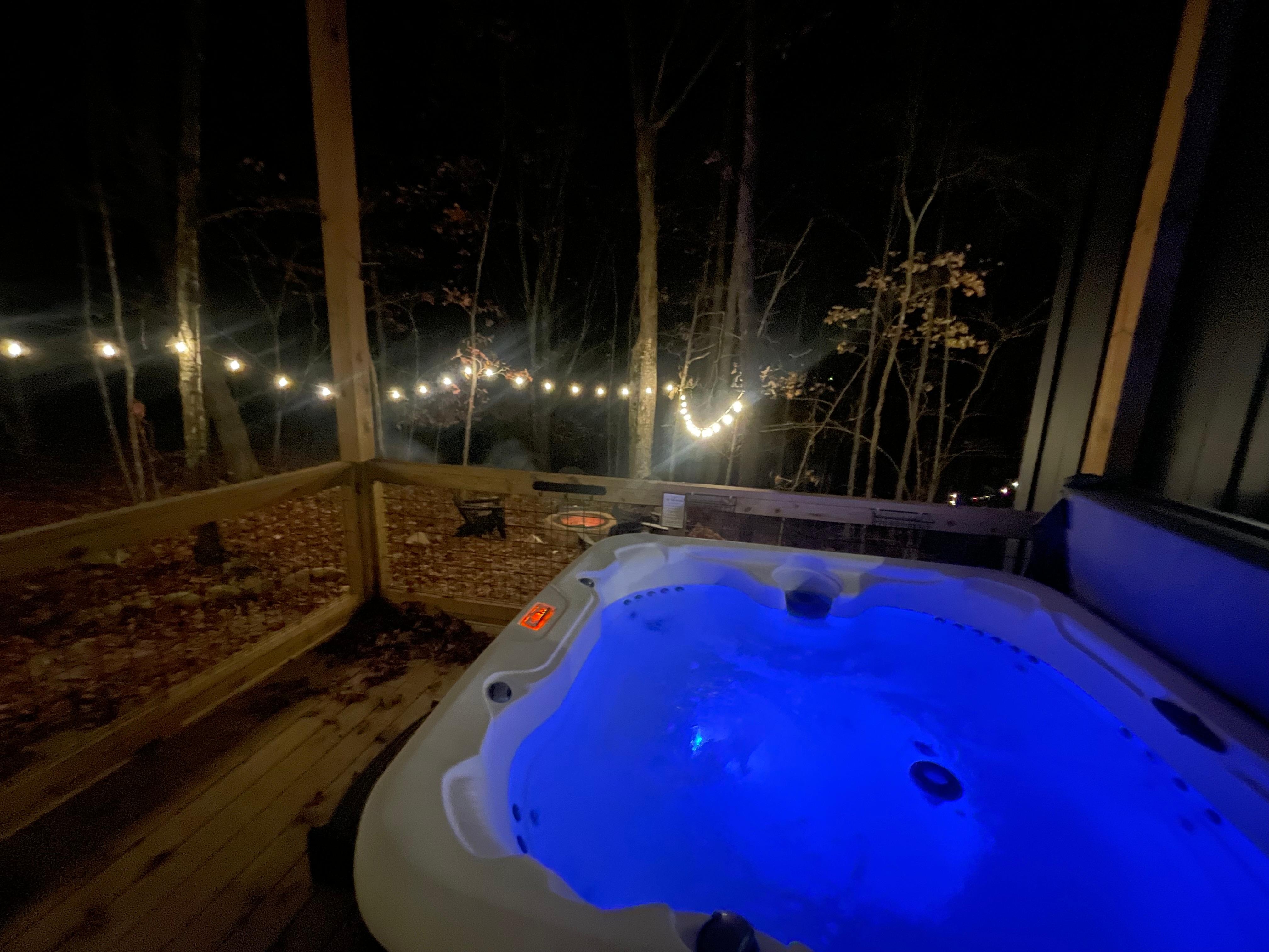 Hot tub with easy lift cover on private deck. The deck also includes a sectional sofa with tranquil views of the woods. Sip some coffee on the deck and watch for hummingbirds that frequent the feeder!