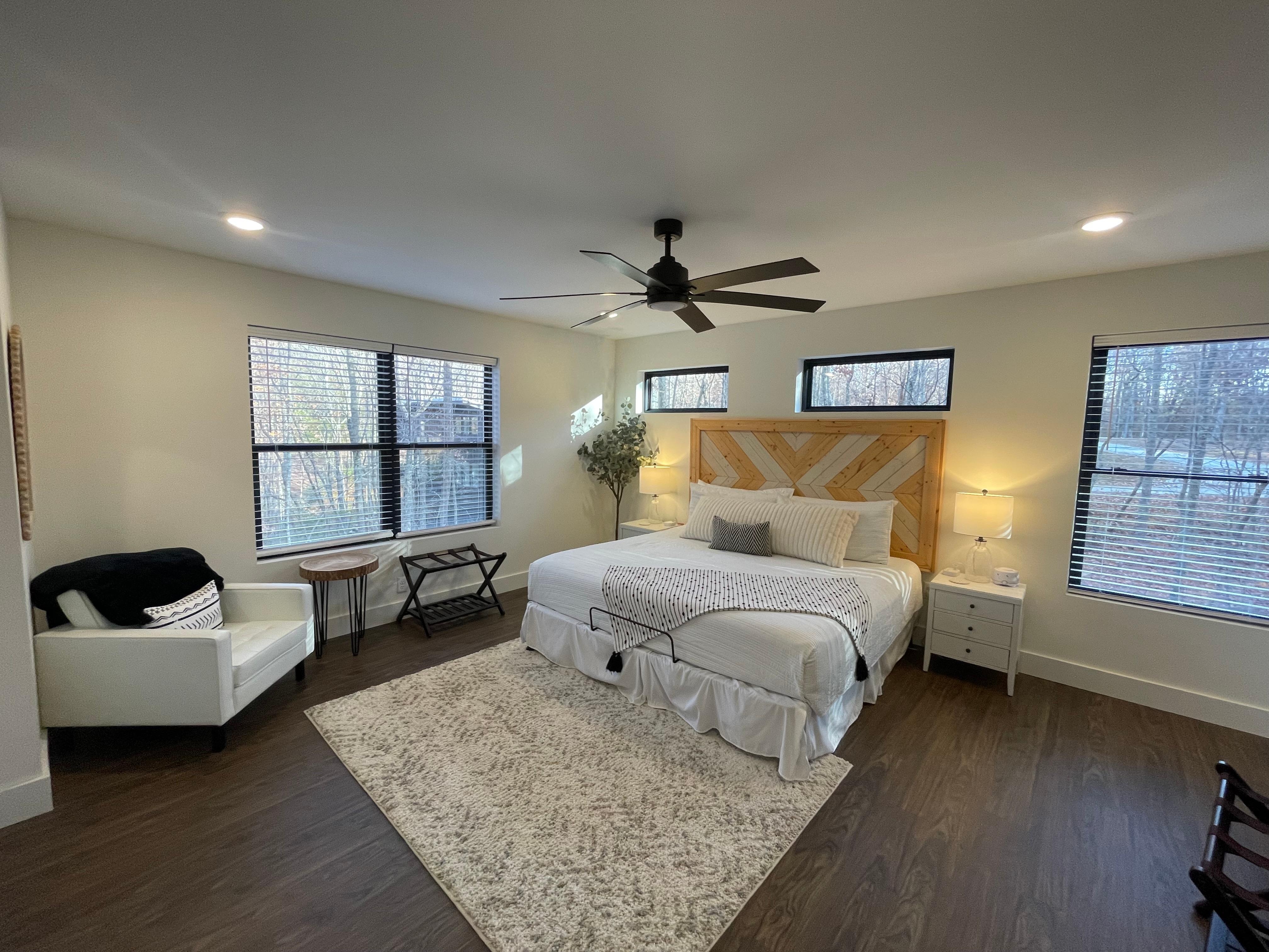 One king size bed in the enormous master bedroom on the main level. This bedroom also has its own private full bathroom including a double vanity. Enjoy the Roku tv while relaxing on the adjustable bed while looking out over the forest!