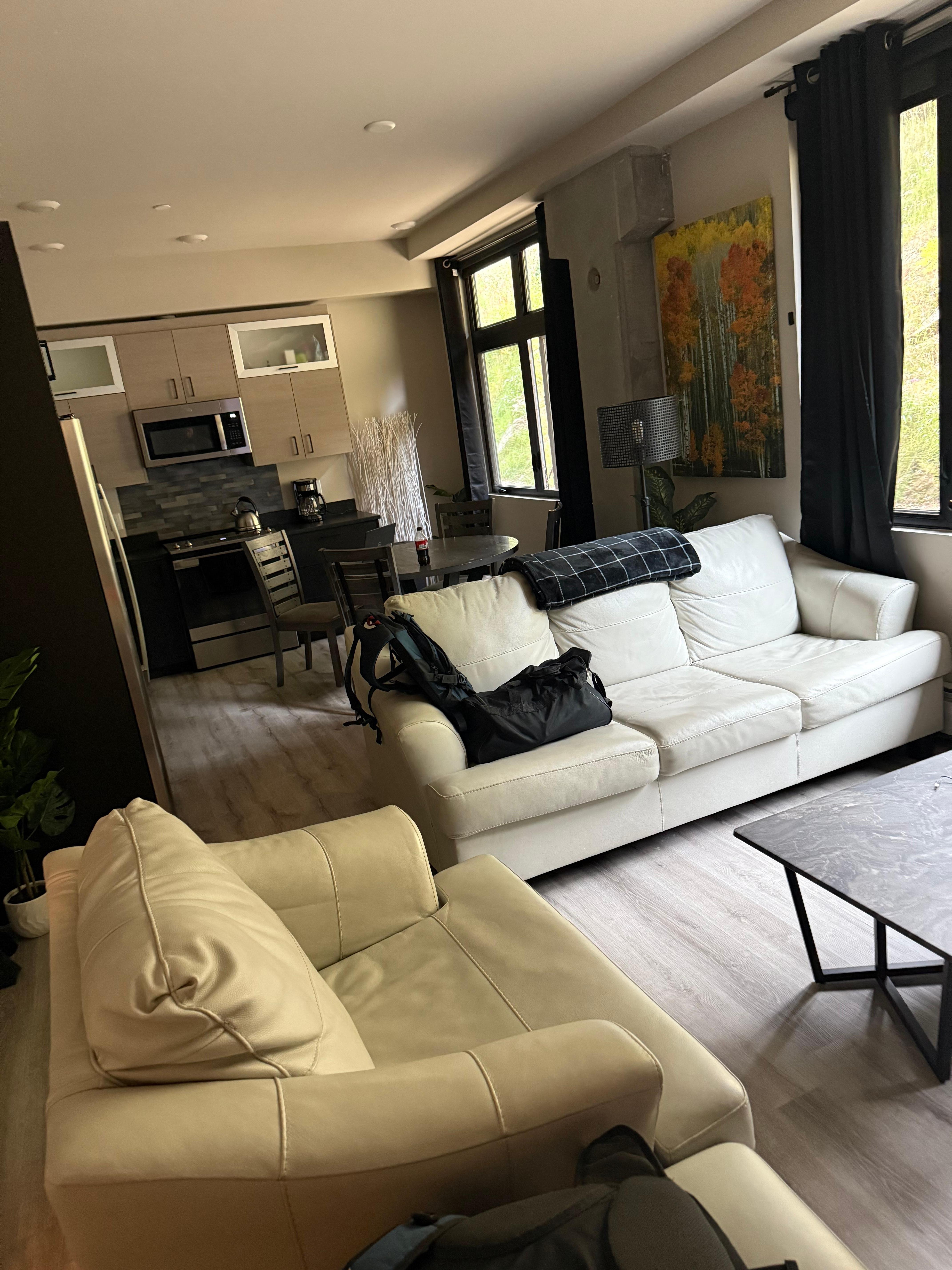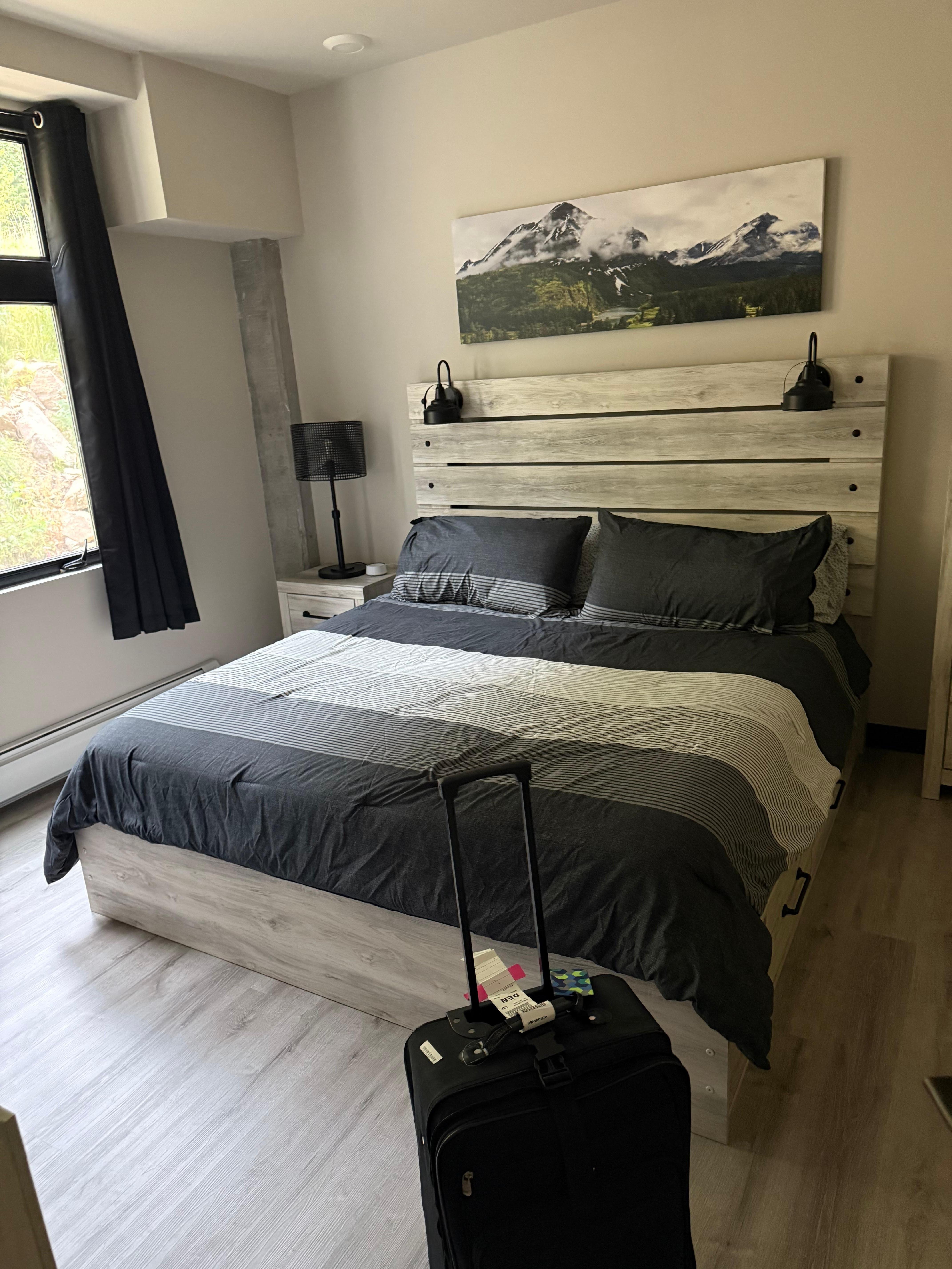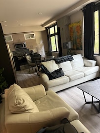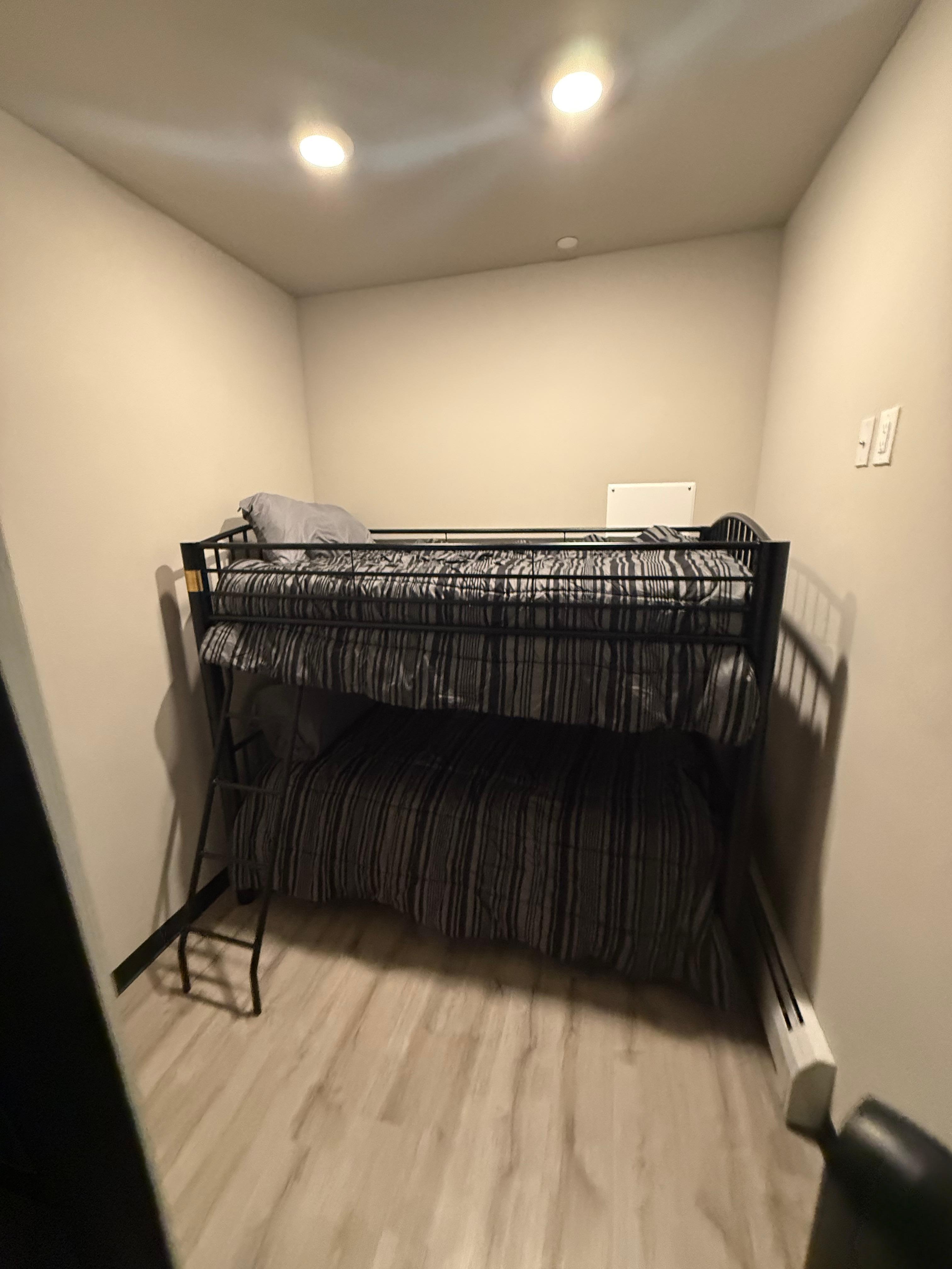 This cozy retreat features a comfortable living room with a queen sofa bed, an office/den equipped with full-size bunk beds, and a single bedroom with a luxurious king-size bed. Enjoy all the modern comforts, including WiFi, a fully equipped kitchen, a washing machine, and essentials like a coffee maker, toaster oven, and blender. Stay warm with the efficient heating system, and unwind with entertainment options on the 65” TV in the living room and the 43” TV in the bedroom. Experience restful nights with down feather pillows, all beds and pillows have protectors that are laundered between guests.