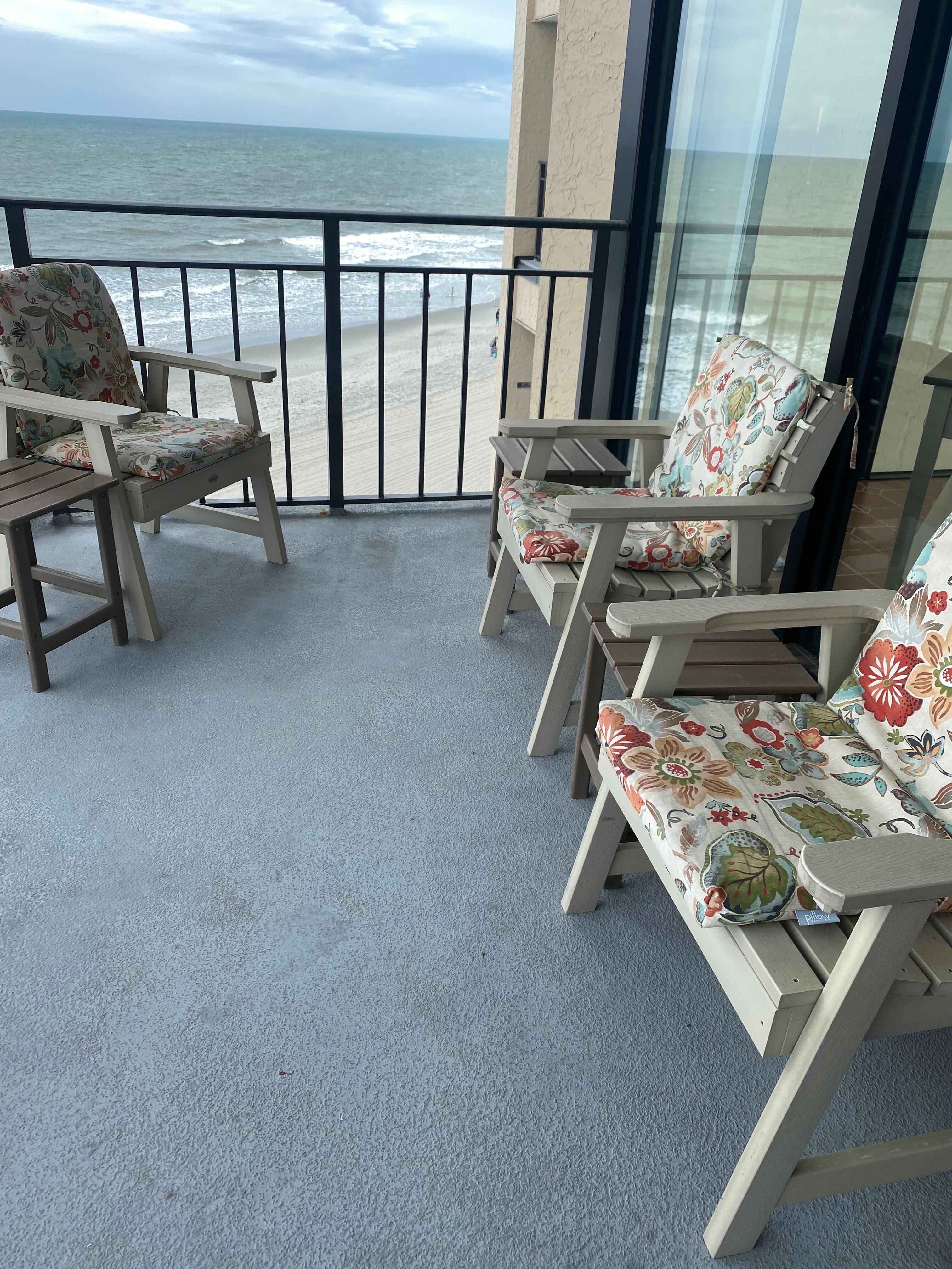 Sliding glass doors lead to a balcony filled with chairs for relaxing. Here on the balcony, you can enjoy the beautiful view with only the sound of the waves.