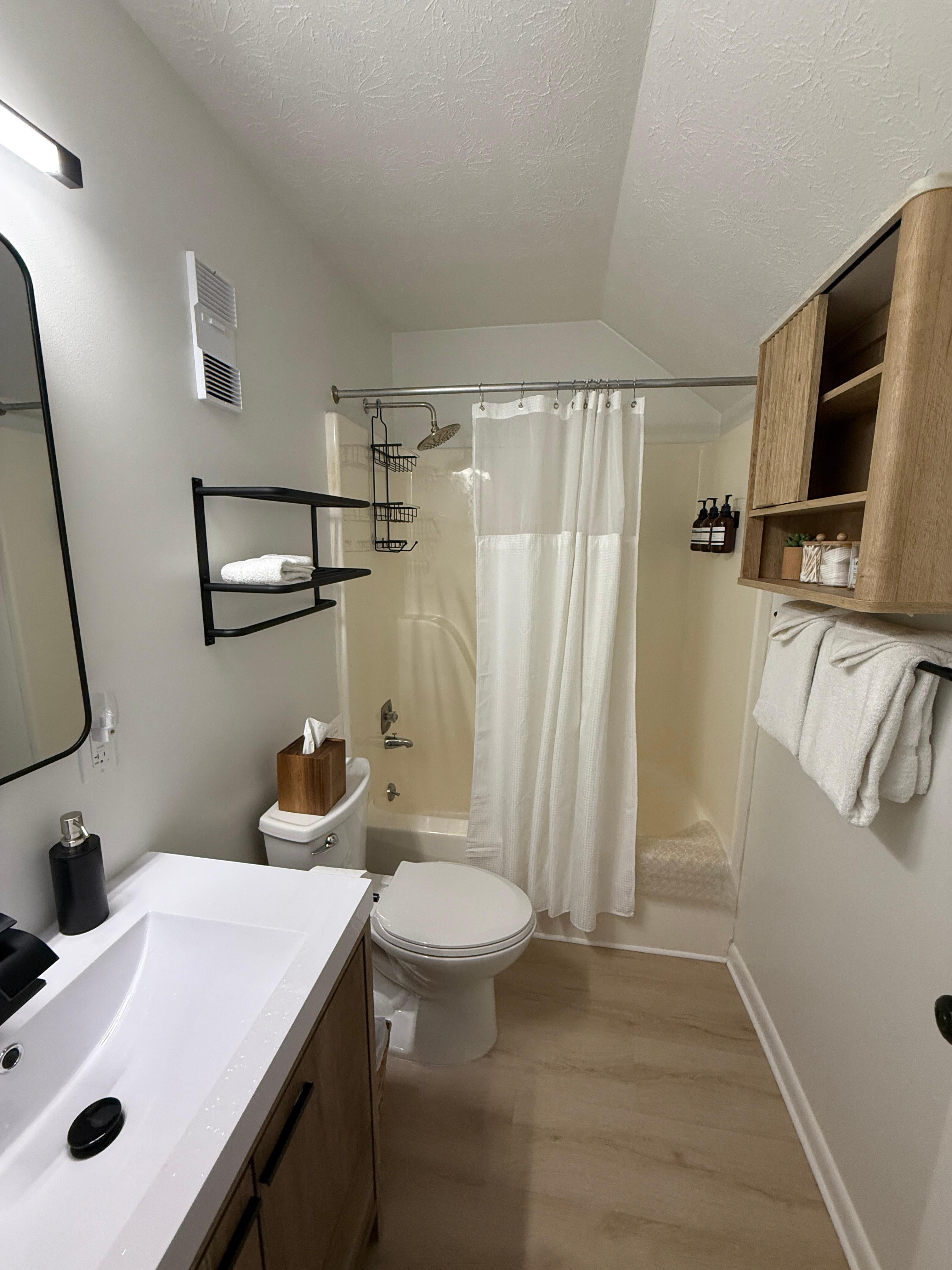 There are two bathrooms in the condo, both with a shower-tub combination. Each one is stocked with in-shower shampoo, conditioner, and body wash so that you have one less thing to pack. We also provide Q-tips, makeup-removing wipes, and cotton rounds.
