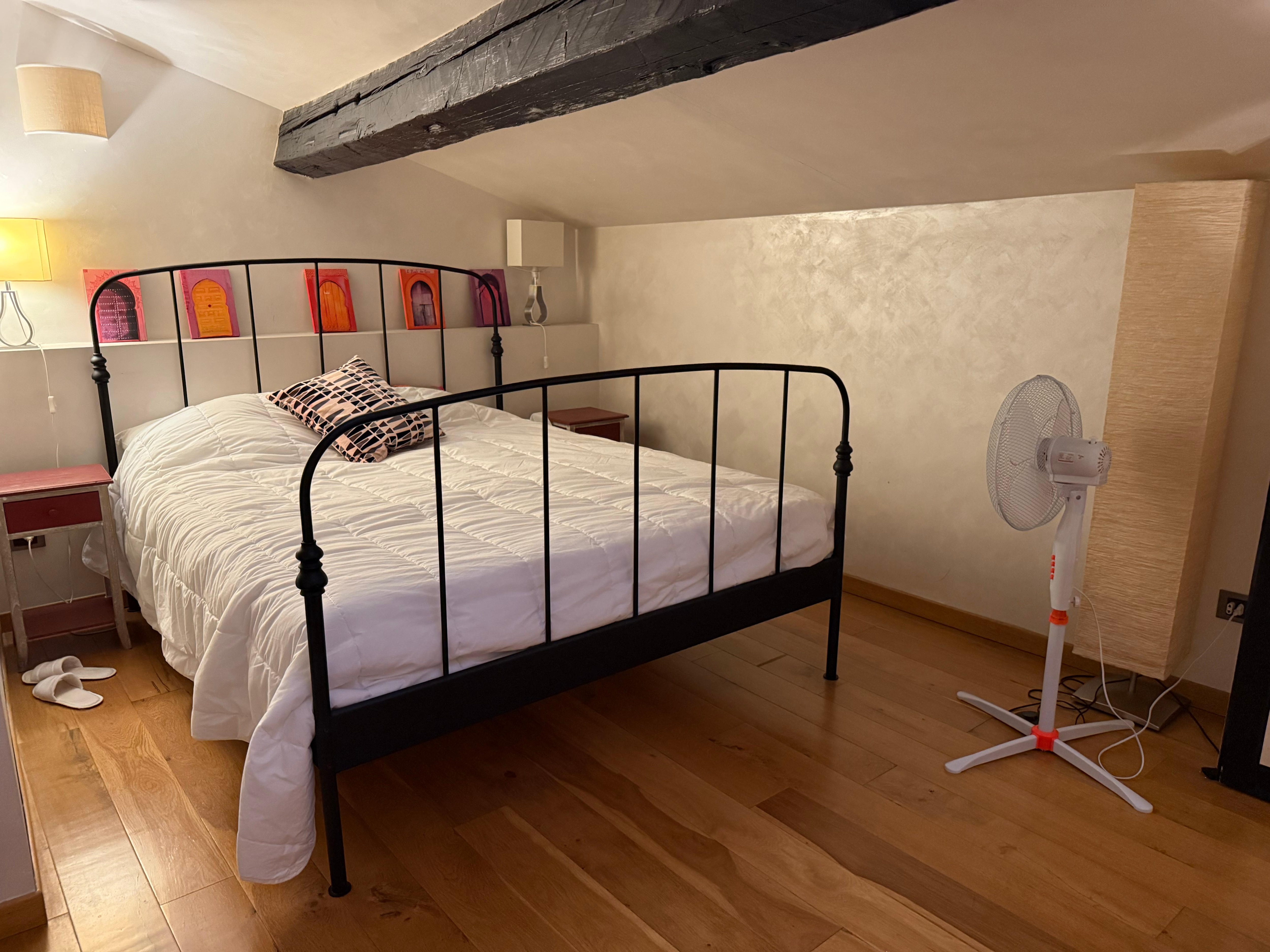 The second bedroom has also a king size bed and both the bedrooms has original drawings on the walls. There is second bathroom with a huge shower.