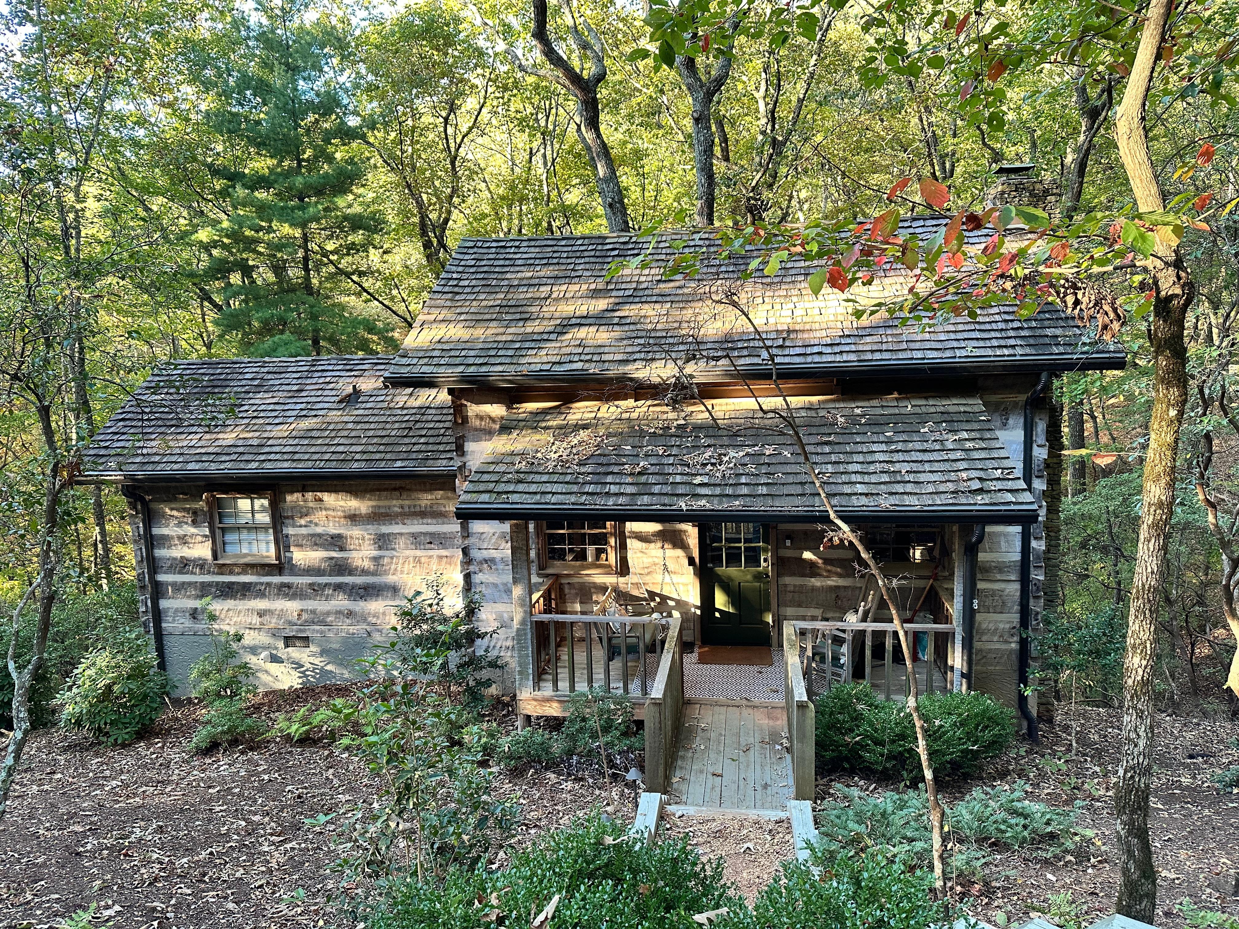 Enter the beautifully restored timber and white chink cabin through a rocking chair front porch into the open-plan dining, living area, and kitchen. The living area offers beautiful views of the wooded glen through multiple windows and a treehouse-like screened back sitting porch. Downstairs, a second living room with a TV is perfect for movie night or the game and features a stylish electric flat-screen fireplace. Behind the living room is a second screened porch sitting area, a great spot to listen to the creek or read a book. Outside, nestled at the back of the cabin, is a beautiful fire pit, perfect for relaxing and enjoying nature and the sounds of the nearby creek.