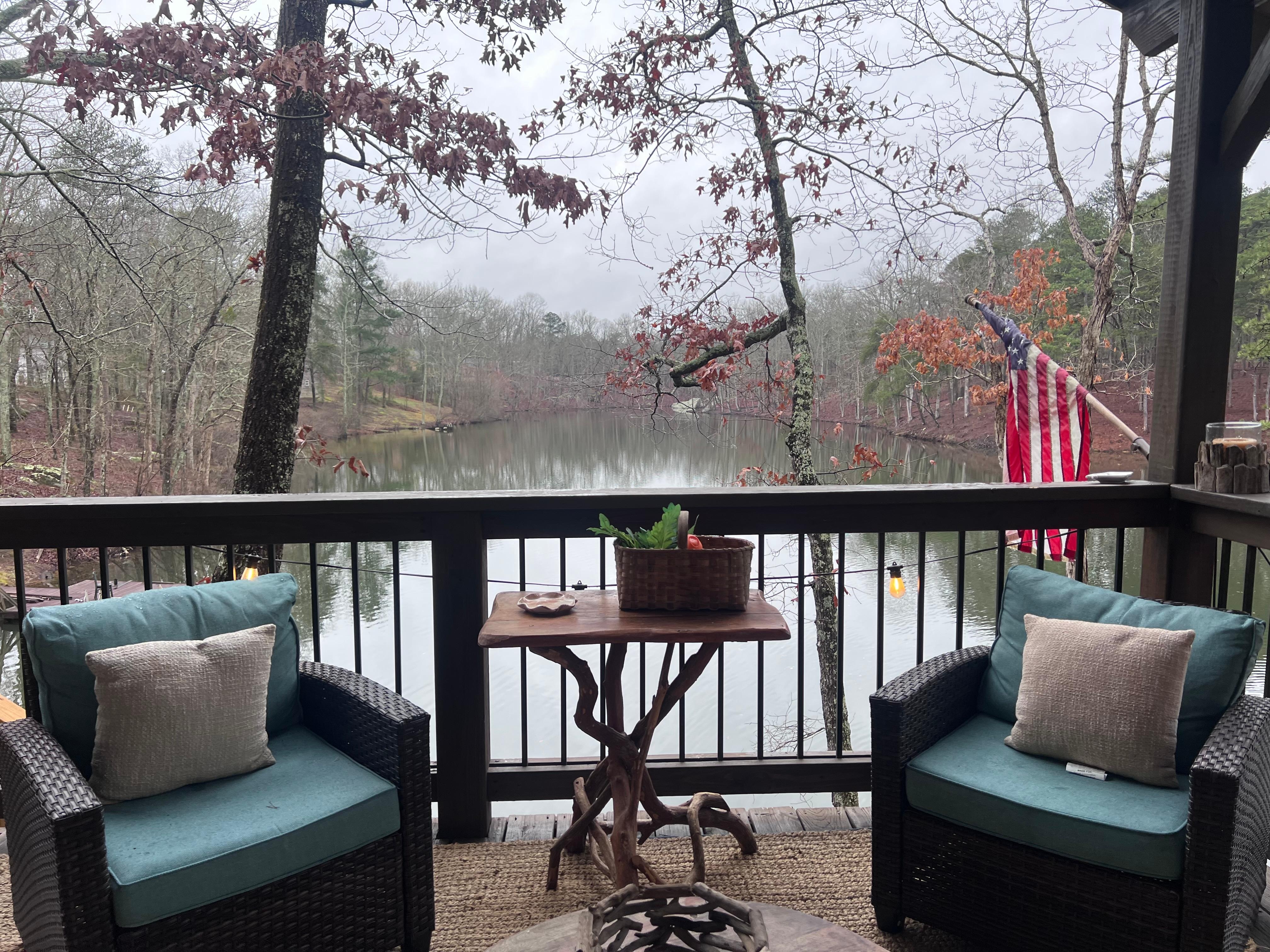 Enjoy this peaceful little cabin located in scenic Little River Canyon. Just a 6 minute walk to Eberhart Point with hiking and swimming and a convenient drive to downtown Fort Payne, Mentone, Lake Weiss, Desoto State Park and more. At the cabin you can enjoy the private lake with great fishing, and a private dock with dining. The cabin has a large back deck with a gas grill, patio furniture, and dining table with the best views of the lake. On the back deck there is also an outdoor private shower(seasonal). To the side of the cabin is a fire pit with seating to roast some marshmallows or just sit by a cozy fire, along with a swing looking over the lake. Inside the cabin both bedrooms are king size beds with large closet space in both rooms. There is also an extra cot provided should it be needed. A large living room with a smart TV and lots of seating for social time. Kitchen comes complete with a stove and dishwasher, all kitchen dishwater and cookware, all of this just a door away from the back deck. Guest are welcome to explore the property around the lake. This is the perfect getaway!
