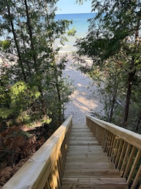 A brand new set of stairs to the beach were installed in March of 2025 with a beautiful 16x16 deck overlooking the lake. The stairs are gradual with resting spots along the way.
