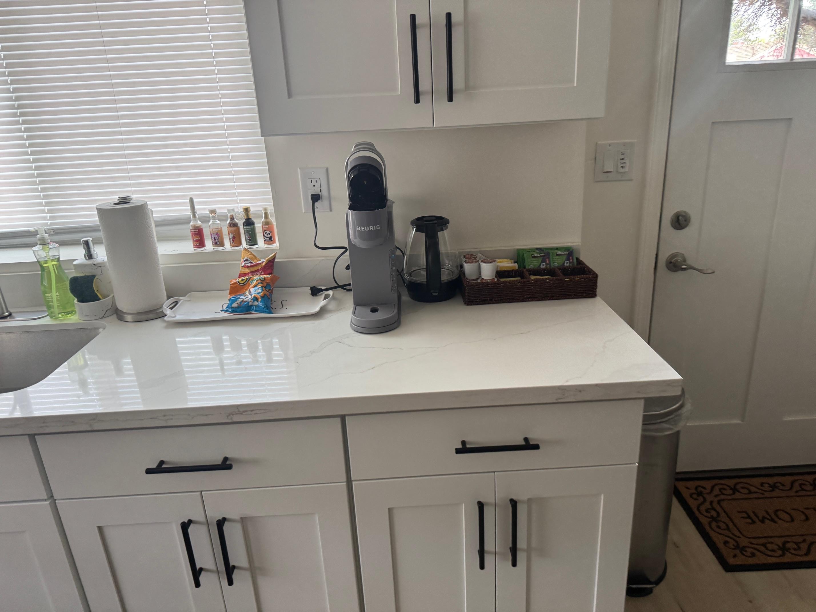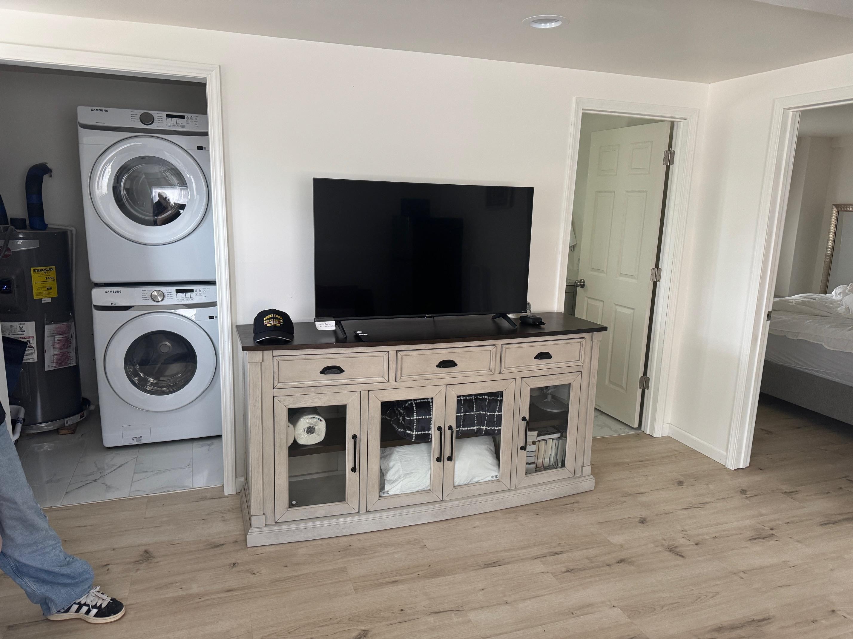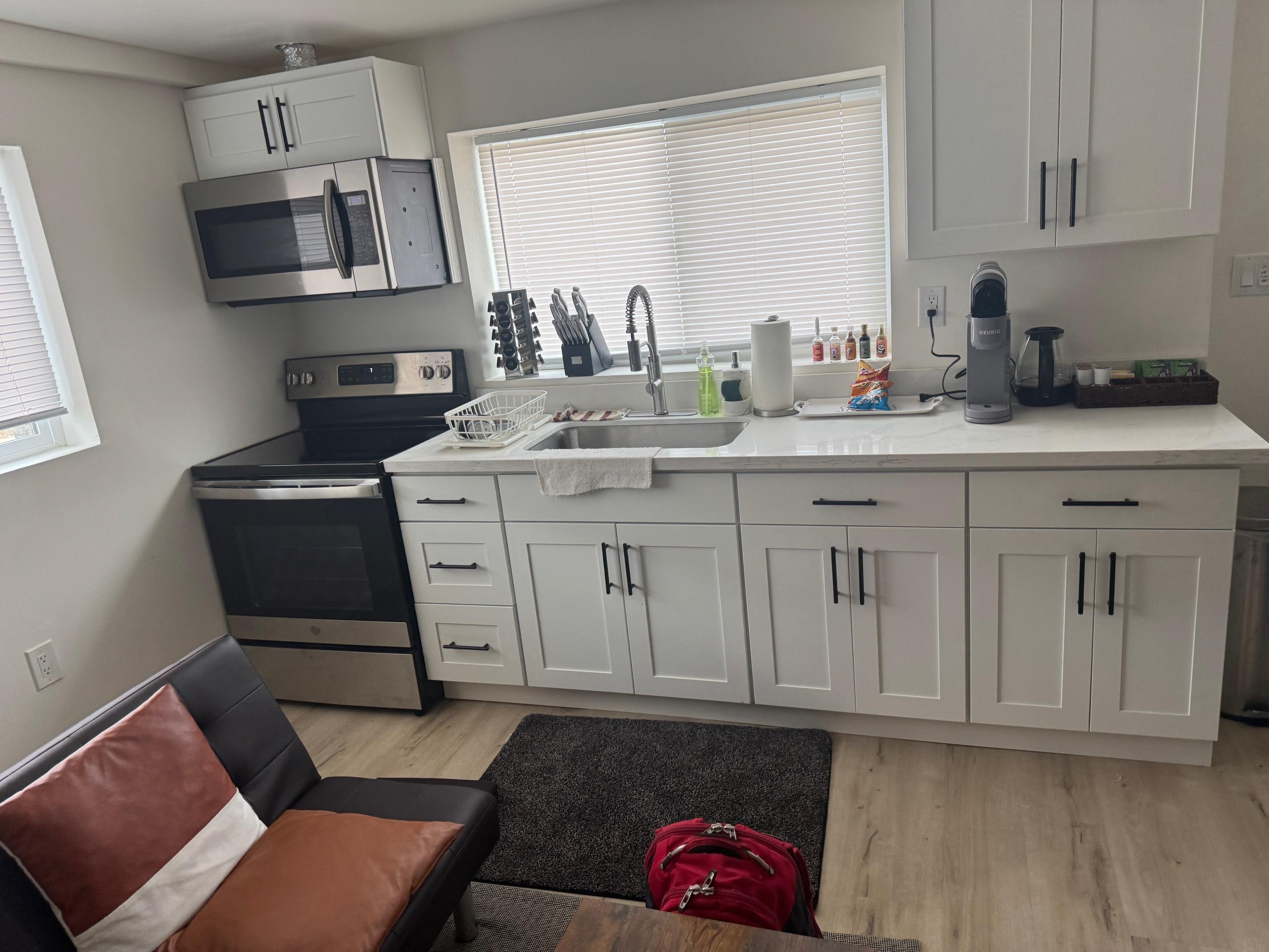 The Space: Nestled in a quiet and safe neighborhood, our tiny house ensures a tranquil environment for a great night's sleep on super comfy beds. The bathroom features a stand-up shower stocked with shower gel, shampoo, and conditioner. The kitchenette includes a microwave, fridge, electric hot water kettle, and coffee maker for your convenience. A 50-inch TV equipped with access to your favorite streaming services.