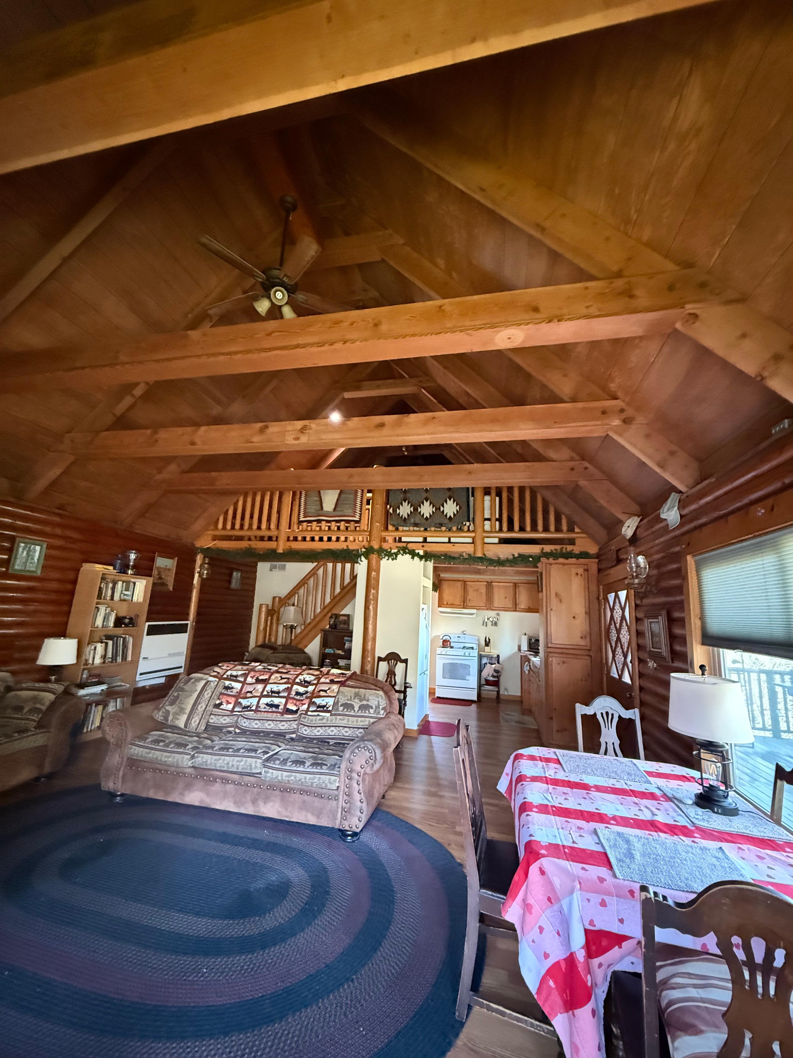The cabin is close enough to Hwy 245. But has plenty of privacy with a feel of living in the forest, and the property includes a seasonal creek. The mountain environment is extended indoors with the furnishing of wood and stone themes. The log walls and steeply pitched cedar ceiling provide a feeling of warmth or sit out on the deck with a cup of coffee or a glass of wine and enjoy the cedar, pine, and oak trees and have a view toward the creek bottom. Habitat of numerous wild birds including Steller jays and acorn woodpeckers. A short walk on the Creekside trail provides seasonal blackberry picking opportunities or sit under the sprawling canopy of the mature Valley Oaks and listen to the wind.