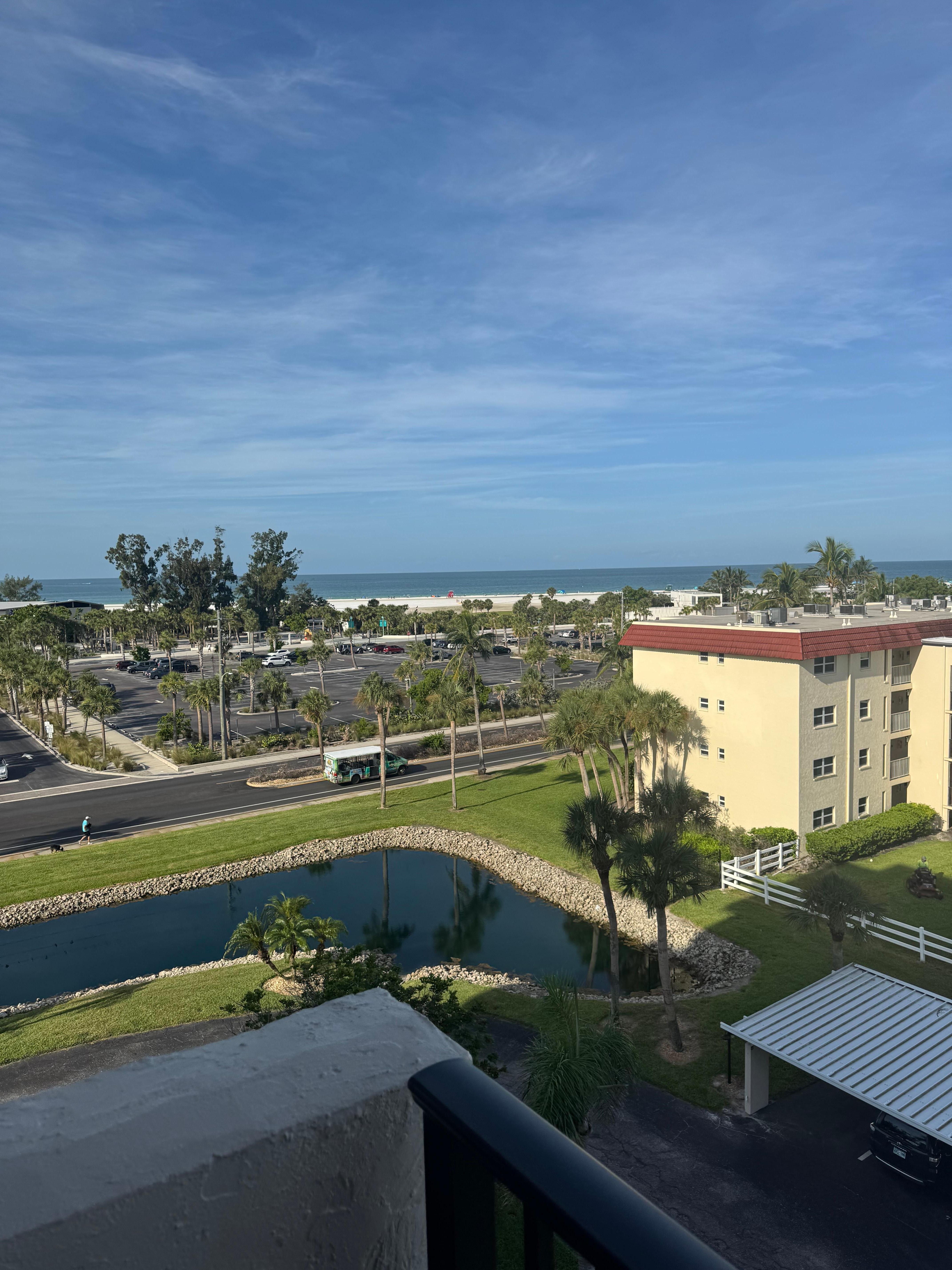 Just a five-minute walk across Beach Road to Siesta Key's world-famous beach! This fifth floor 2bd/2ba corner unit offers an abundance of sunlight with views of the crystal white sands of Siesta Key Beach. The condo also includes two balconies that add significant space for watching the sunrise while sipping your morning coffee or enjoying a glass of wine while catching a beautiful sunset. The condo has an open floor plan which includes a kitchen, with all the conveniences of home, seating for six in the living room and dining room. The master bedroom has a king bed with an ensuite bathroom. The second bedroom has two twin beds. All linens, bath, beach and pool towels are included. A full-size washer and dryer are also available in the unit. High speed wireless internet and satellite TV complement this space. If a beach day is not on the agenda, you can enjoy the heated swimming pool, play tennis or pickleball on one of the two courts or just relax in the comfort of a chaise lounge on the pool deck. A BBQ grill and covered picnic area are also located in the communal pool area. Beach chairs, umbrella and toys are also provided in the unit. Assigned covered parking. Siesta Key Village is just a short ride away on the FREE trolley that will pick up and drop you off right outside of the condo. If you are interested in getting some exercise, it is about a 20-minute walk to the village. The village offers restaurants, shops and plenty to do during the day or evening. This is a smoke free and pet free property.