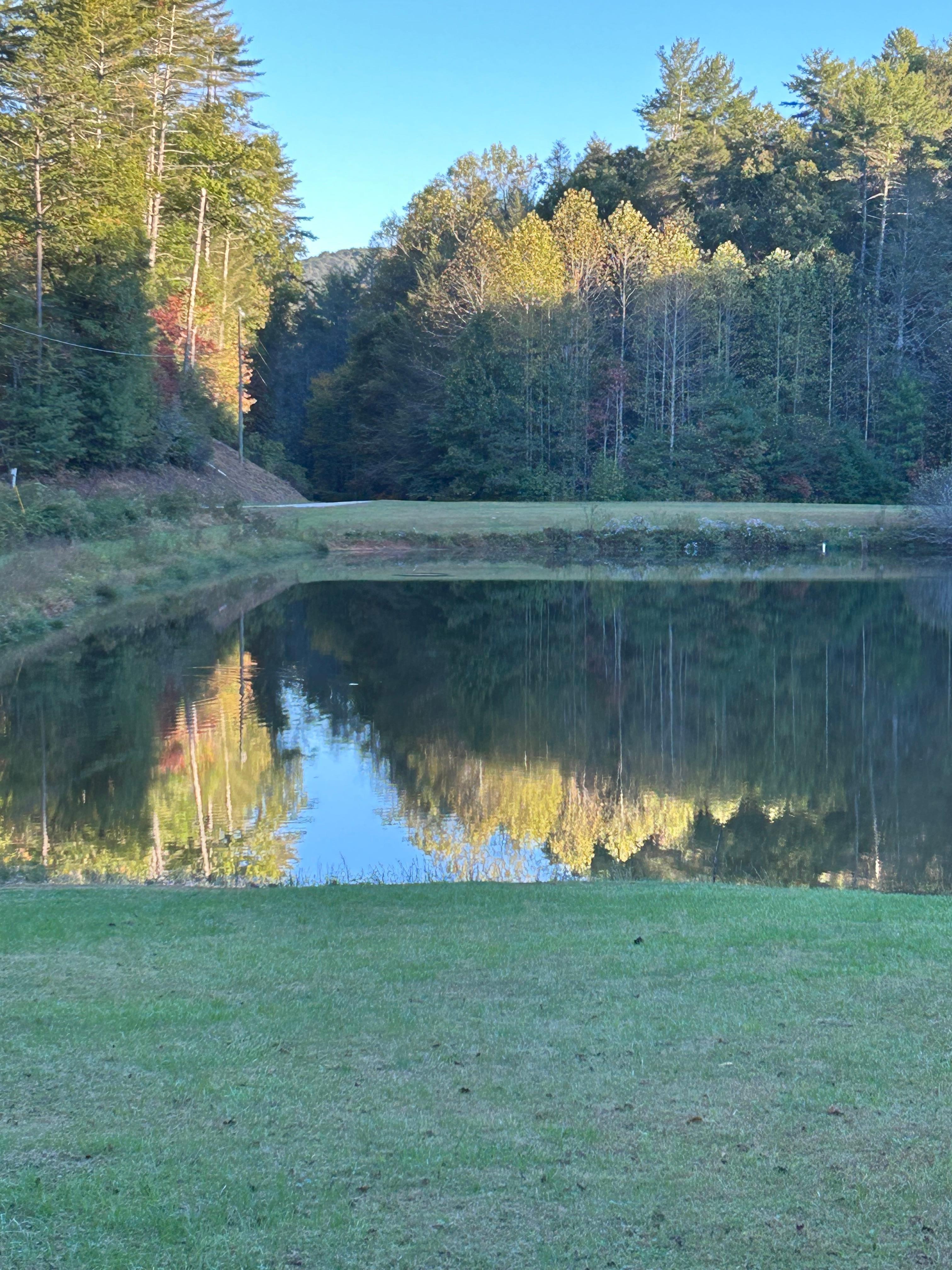Cabin is situated on big, grassy yard beside fishing pond 10 miles from charming downtown Ellijay. Rent our sturdy canoe for a paddle cruise or fishing tour around the pond. Wind up your pitching arm for a game of corn hole...corn bags and boards provided. Watch the deer graze and turkeys peck from the wrap-around porch. Relax by the campfire while your buddies catch a few fish and throw them back. Bring your football, soccer ball or croquet set (?) for a game on the grass; come on back in the house to recover in comfort. Listen to the bullfrogs croon on the pond in the evening.