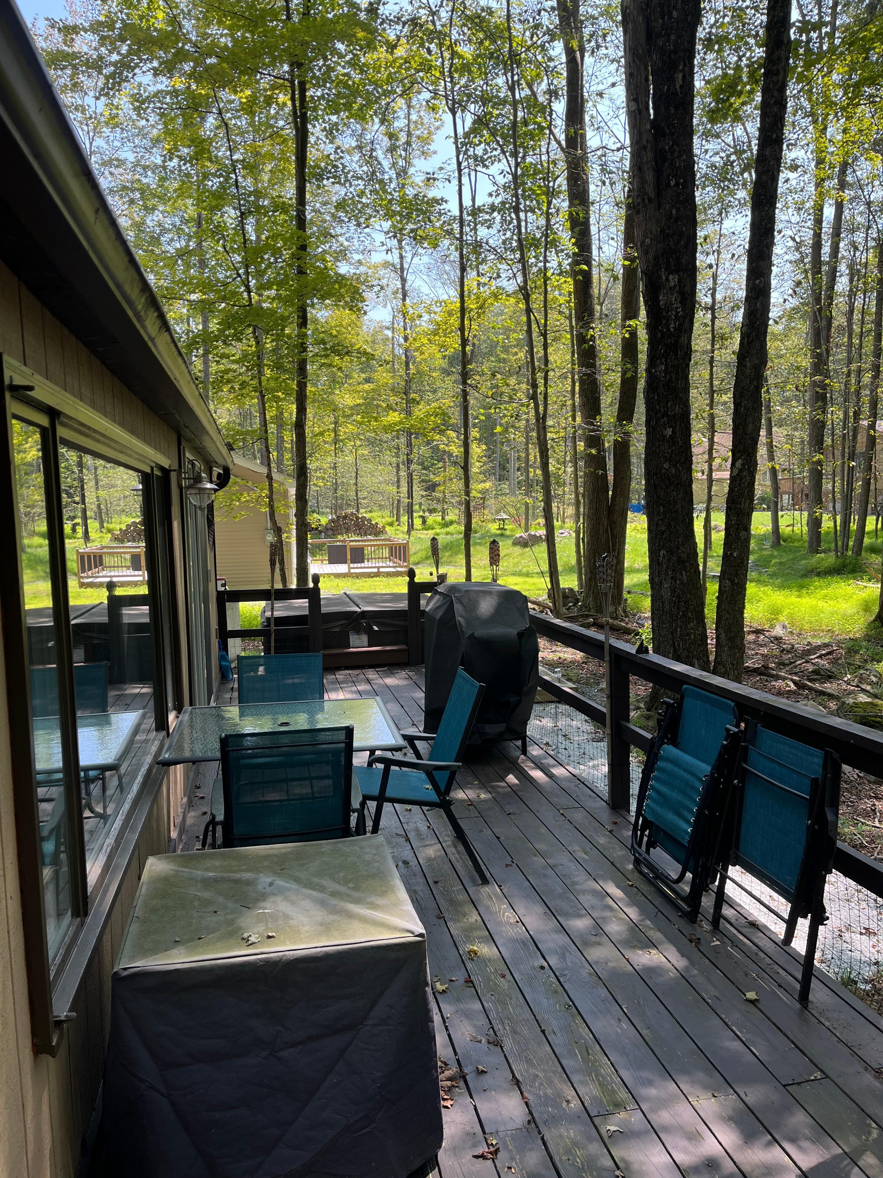 -Go out the sliding doors to the deck with seating for your morning coffee, a gas grill for BBQ or to simply sit back and enjoy the great outdoors with deer sightings. In the front yard you will find a fire pit with comfortable seating. Step off the back deck into a 5-person hot tub, featuring a lounge seat, 25 jets for maximum comfort. (HOT TUB ONLY AVAILABLE FOR USE BETWEEN APRIL & OCTOBER)