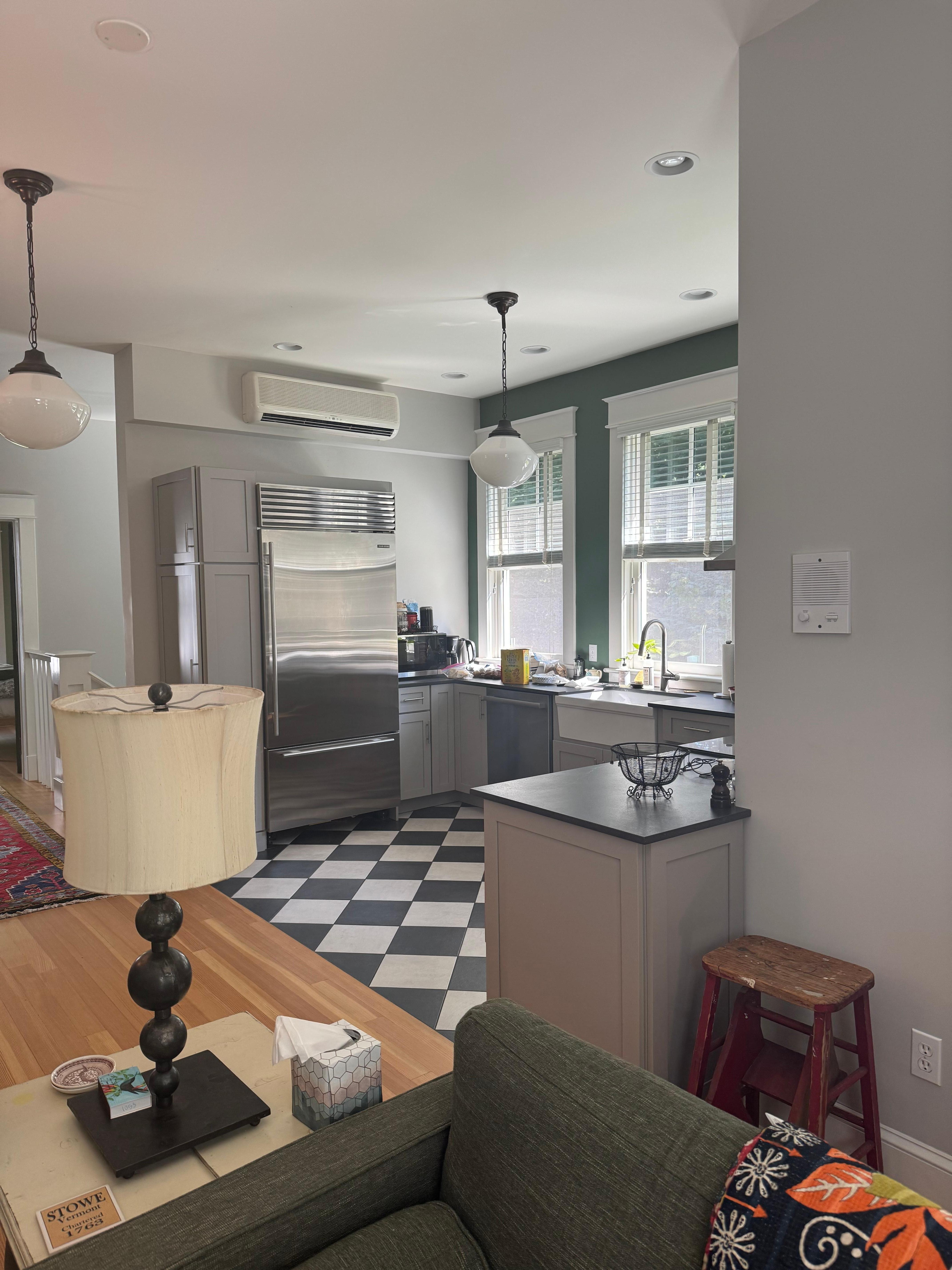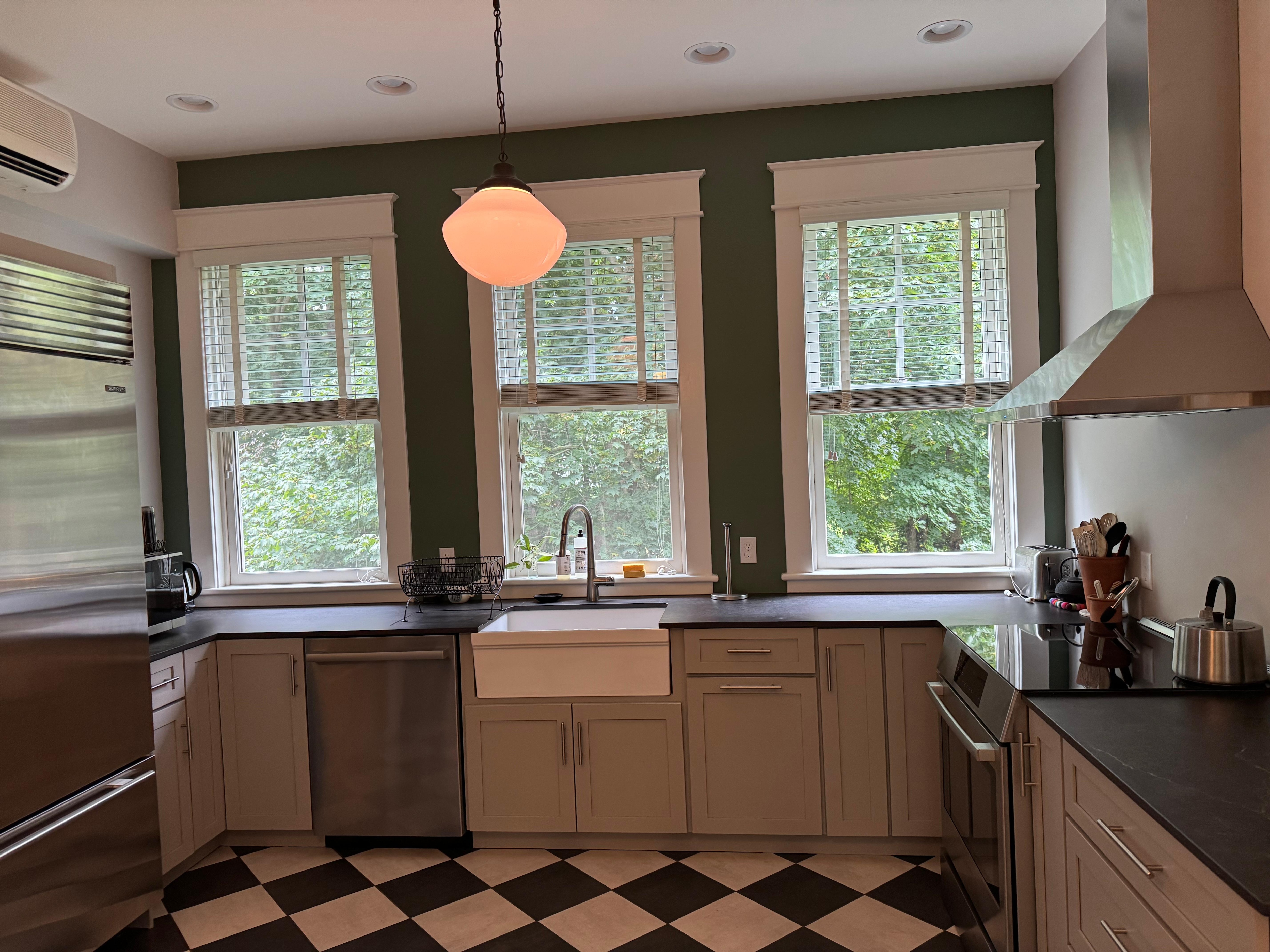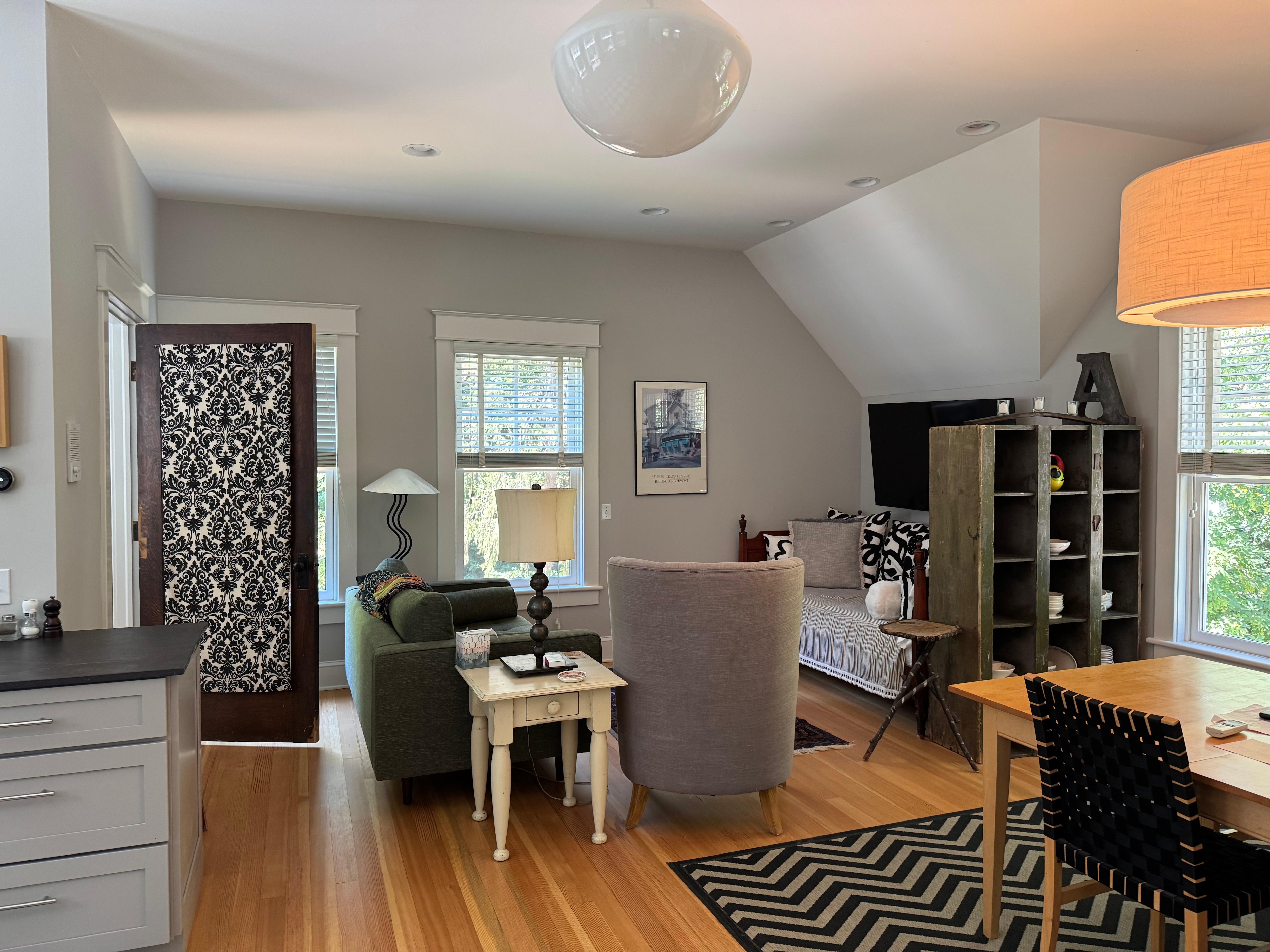 CARRIAGE HOUSE APARTMENT • 195B North Prospect St. Burlington, VT 05401 The building has been our graphic design studio for the last 20 years. We’ve recently moved out and back into our main house, on the same property, and have added a kitchen and shower to our one bedroom space. Our property is easy walking distance to UVM and the UVM Medical Center. DETAILS - One bedroom with a queen bed; full kitchen with all new high-end appliances & well stocked for cooking meals; bathroom with tiled shower, antique pedestal sink; living room/ dining area with table and 4 chairs (more possible), day bed/twin bed, upholstered chair(s); large TV with streaming services; new washer/dryer on the ground floor. Upstairs lining space is 900 square feet plus downstairs entrance area/ laundry. Off street parking. Large property surrounded by mature trees- we called this our treehouse when it was our workspace. Lot’s of light, set back from the street, so it is quiet. 5 blocks from UVM green, 15-18 minute walk to the patient entrance of the hospital - less than one mile. 18-20 minute walk - one mile to Downtown Burlington. 35 minute walk to Waterfront Park 1.6 miles. All utilities / Wifi / Washer, Dryer / Ample parking included