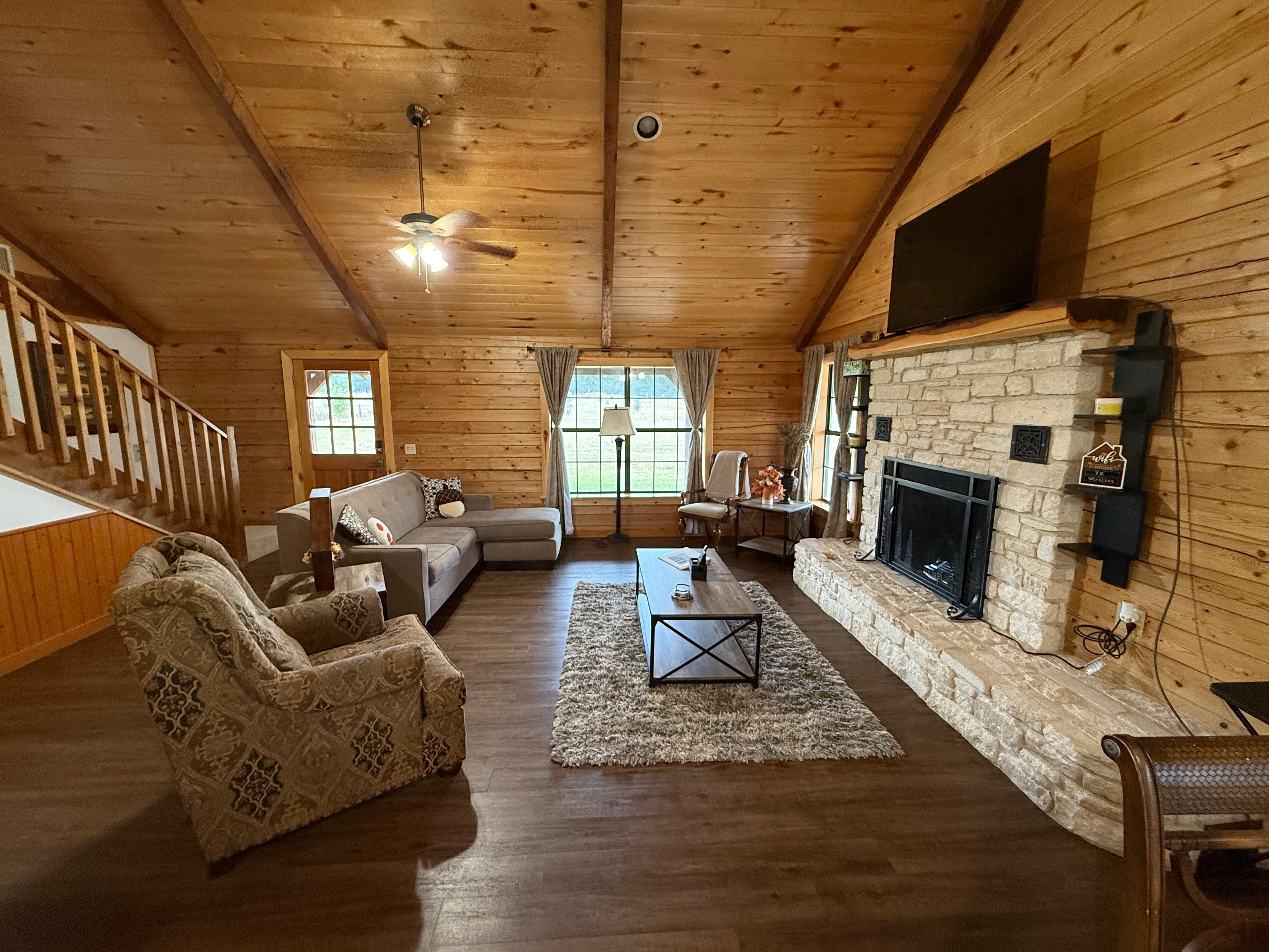 This cozy cabin in New Ulm with 2 bedrooms awaits you. Take it easy at this unique and tranquil getaway on these 15 acres in the country. This charming retreat features a king bed, two twin beds, and a queen bed, perfect for a family or group of friends. Enjoy the convenience of a full kitchen, washing and dryer machines, hair dryer, and WiFi during your stay. With two bathrooms equipped with showers, towels, toiletries, and hair dryers, you'll feel right at home. Make your holiday one for the books with a stay at our place. Enjoy privacy and beauty, indulge in comfortable accommodations, take a stroll on the open/wooded trail, grill at sunset, savor dinner under the outdoor covered space or the indoor dining area, stargaze the dark skies, swing away in the breeze, enjoy a warm drink on the porch, and warm up next to the electric fireplace in the living room,