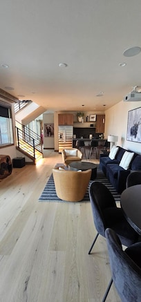 Living Area: The heart of the home features vaulted ceilings and floor to ceiling windows that enhance the spaciousness and elegance as well as breathtaking views. The plush sectional sofa by the grand stone fireplace is the perfect place to cozy up and unwind or an ideal spot to watch movies on the 75” TV with Sonos soundbar. The great room flows into the spacious dining room and Chef’s kitchen. Enjoy your favorite music on the Savant Sound System that flows throughout the house and joins with the large home theatre projector screen in the basement. The basement features an incredible entertainment area with wet bar, complete with a dishwasher and full-sized fridge, perfect for effortless hosting. There’s also an additional adjacent space for games. A Queen sleeper sofa is available in this downstairs area.