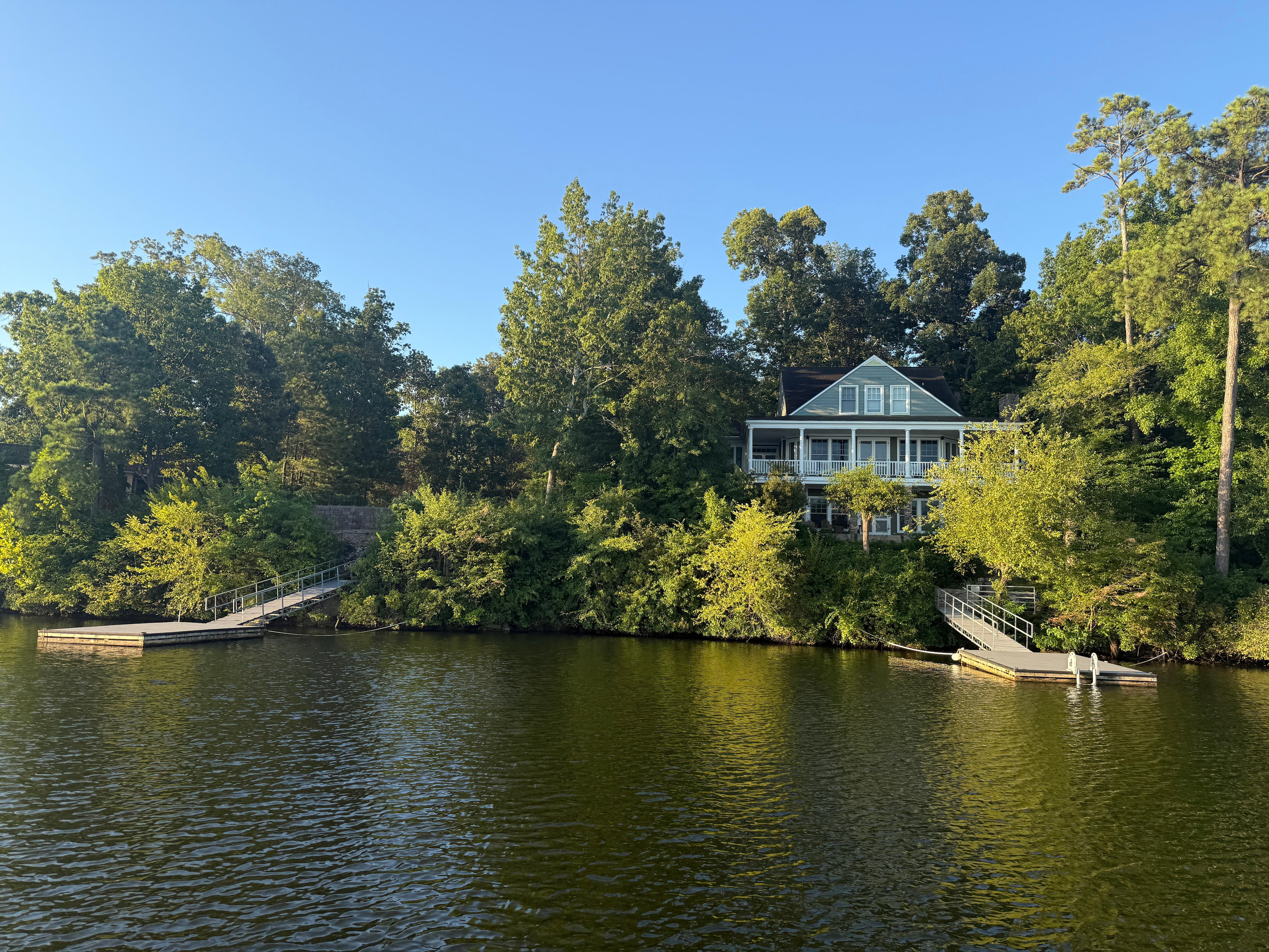 New ownership!! This home was a previous VRBO with consistent reviews of 9s and 10s! This architect designed, 3 story lakefront home is situated on a bluff with expansive views of beautiful Lake Murray. With 7 bedrooms, 5.5 baths and close to 4000 square feet, This home sleeps 15 and offers plenty of space and privacy for multiple families. The main level consists of a living room with large screen TV, dining area, a well stocked kitchen, primary suite with private bath, as well as a half bath and laundry room just off the kitchen. In the dining room you will find a large table that comfortably seats 8-10 with additional seating for 5 at the kitchen island. The upper level has 4 spacious bedrooms: 3 queens and 1 full. 2 of the queen bedrooms have their own private full bath, the remaining 2 bedrooms share a full bath. Downstairs on the bottom floor you will find an inviting second living space complete with TV, ping pong table, another full kitchen, a queen bed room and a room with two twins and bunk beds that share a full bathroom. Enjoy the natural beauty of the South Carolina mid-country while enjoying the rocking chairs on 1 of 2 gorgeous Charleston-style wrap around porches on the main and lower floors, as well as a beautiful screened-in porch with floor-to-ceiling stone fireplace for those cool South Carolina fall and winter nights. Massive windows on all levels highlight the amazing big water views from almost every room with the main bedroom and two bottom level rooms each having private access to their respective floor's porches. Every room contains a ceiling fan and each level of the home has its own heating and A/C unit. If the inside amenities aren't enough, enjoy your stay via the home's private lot immediately next door - take your pick of lounging in the sun, enjoying a friendly game of volleyball on your own private sand court. For those wishing to bring or rent a boat, the property comes with access to 2 private docks, each having approximately 18 feet of water depth at low lake levels and 30 feet at full pool. The lot provides ample parking and extra space (boats, cars, jet skis, etc) for guests as well. An ideal retreat for families, small groups or corporate rentals. We invite you to relax and unwind with us in this private and spacious getaway on the water!