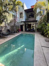 The private courtyard, centered around a sparkling pool and shaded by native palms, offers a tranquil retreat. Guests can dine al fresco at a stone table or unwind on cushioned lounges, surrounded by blooming greenery. A rooftop terrace overlooks the neighborhood, ideal for morning coffee or evening stargazing.